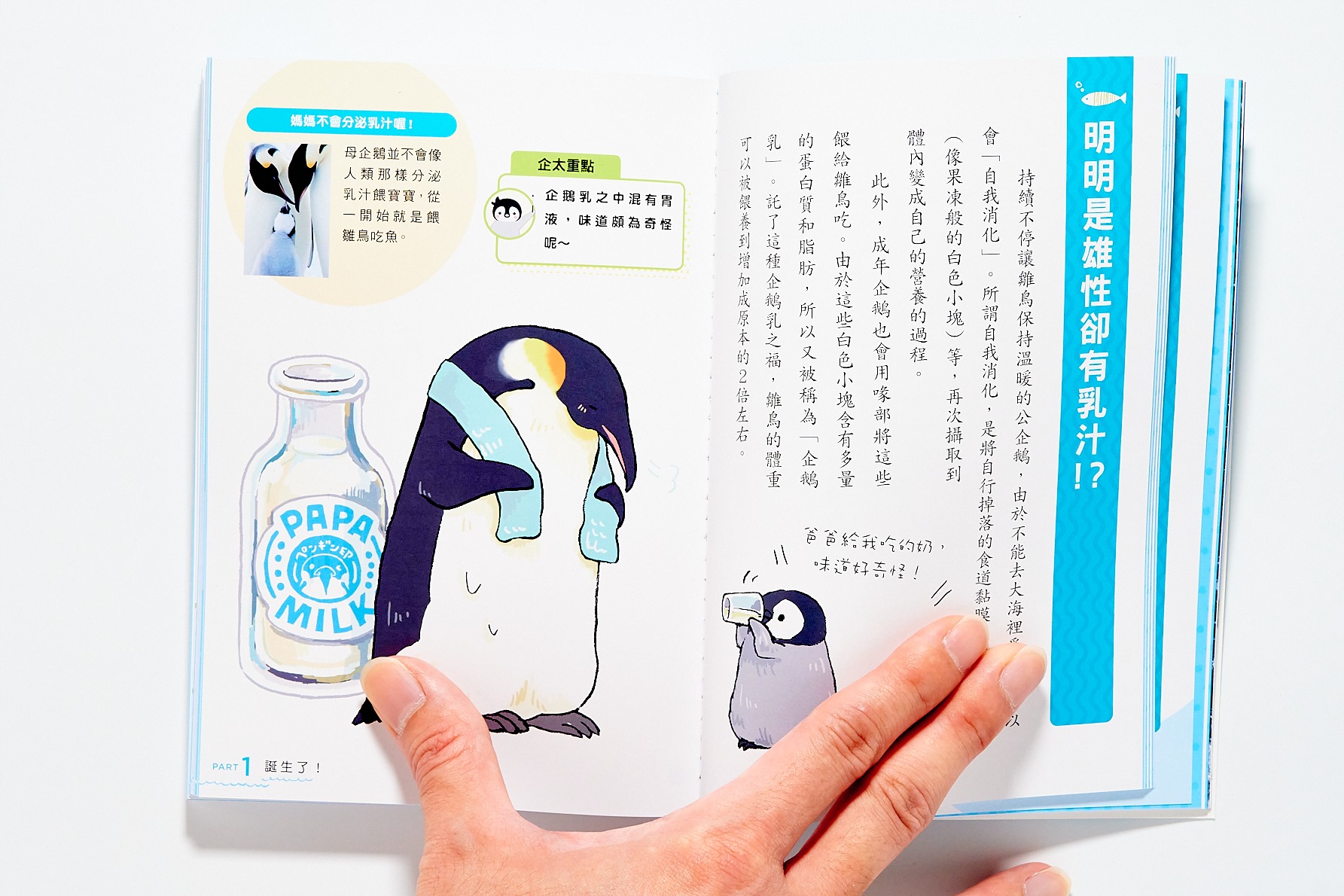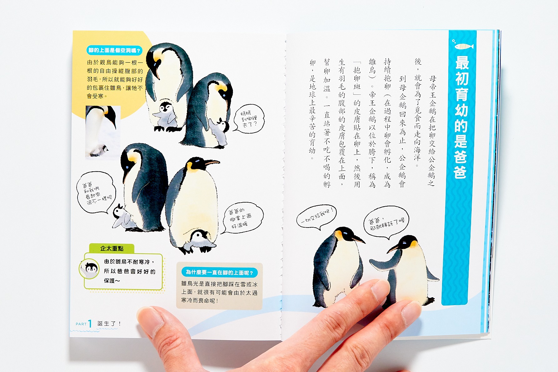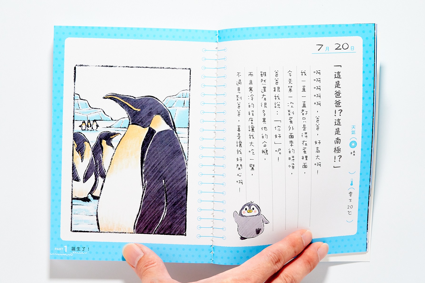 日記裡可以看到小企鵝破蛋出生的興奮、觀察爸媽怎麼照顧自己的好奇文字。剛開始寫到一睜開眼怎麼是爸爸,那媽媽到哪裡去了呢?因為企鵝的育兒方式可是女主外、男主內;爸爸要負責分泌乳汁餵奶,媽媽則是要出外捕魚養家。更有趣的是,企鵝還有公立托兒所,小企鵝們通常聚在一起,被好幾位企鵝老師、家長保護著。