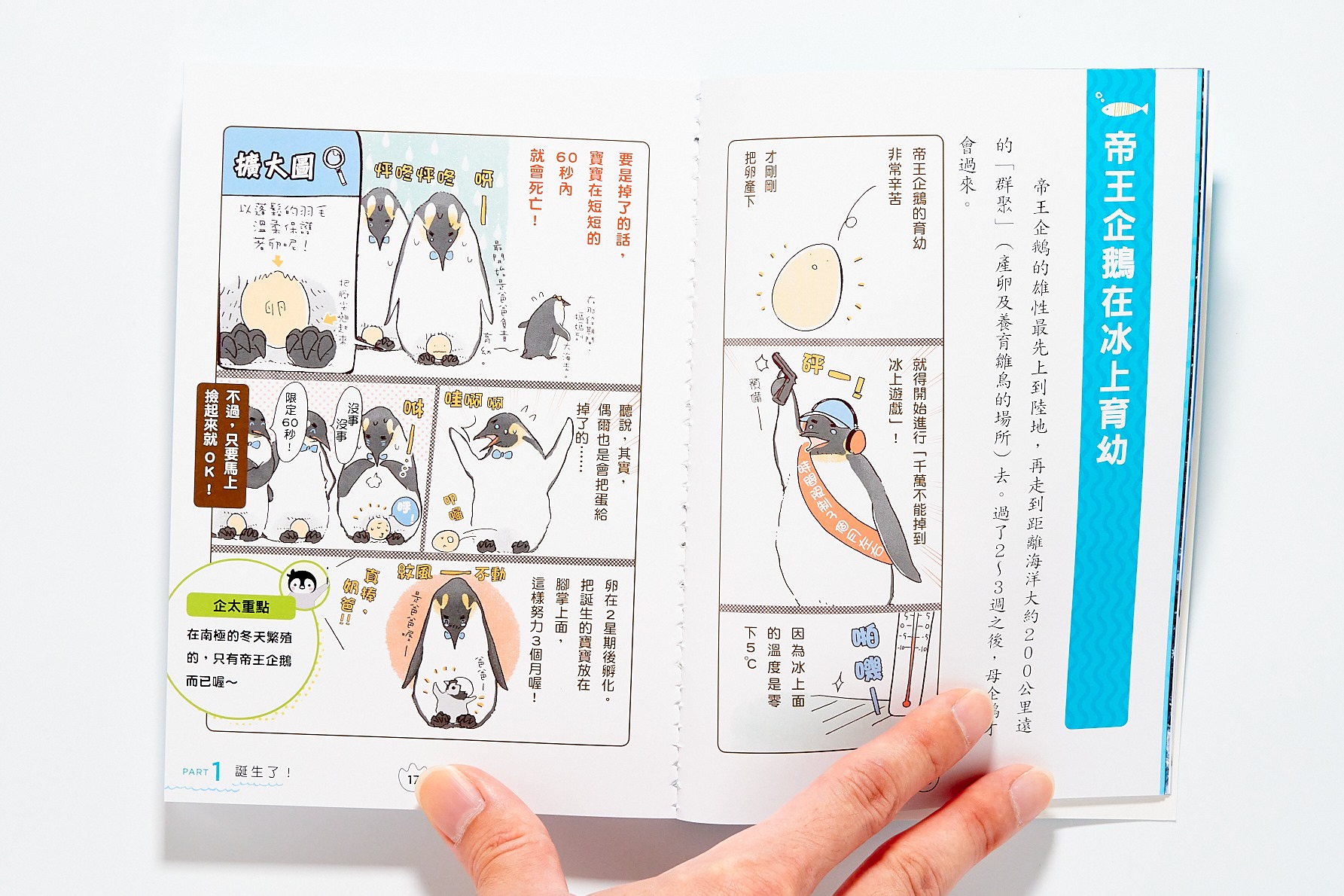逐漸長大的同時,讀者可以從日記、小百科、漫畫穿插中,學到各種有關企鵝的知識,不過要書中的企鵝主角可是帝王企鵝,世界上最大型的企鵝;我們台北動物園的明星企鵝則是小一號的國王企鵝。