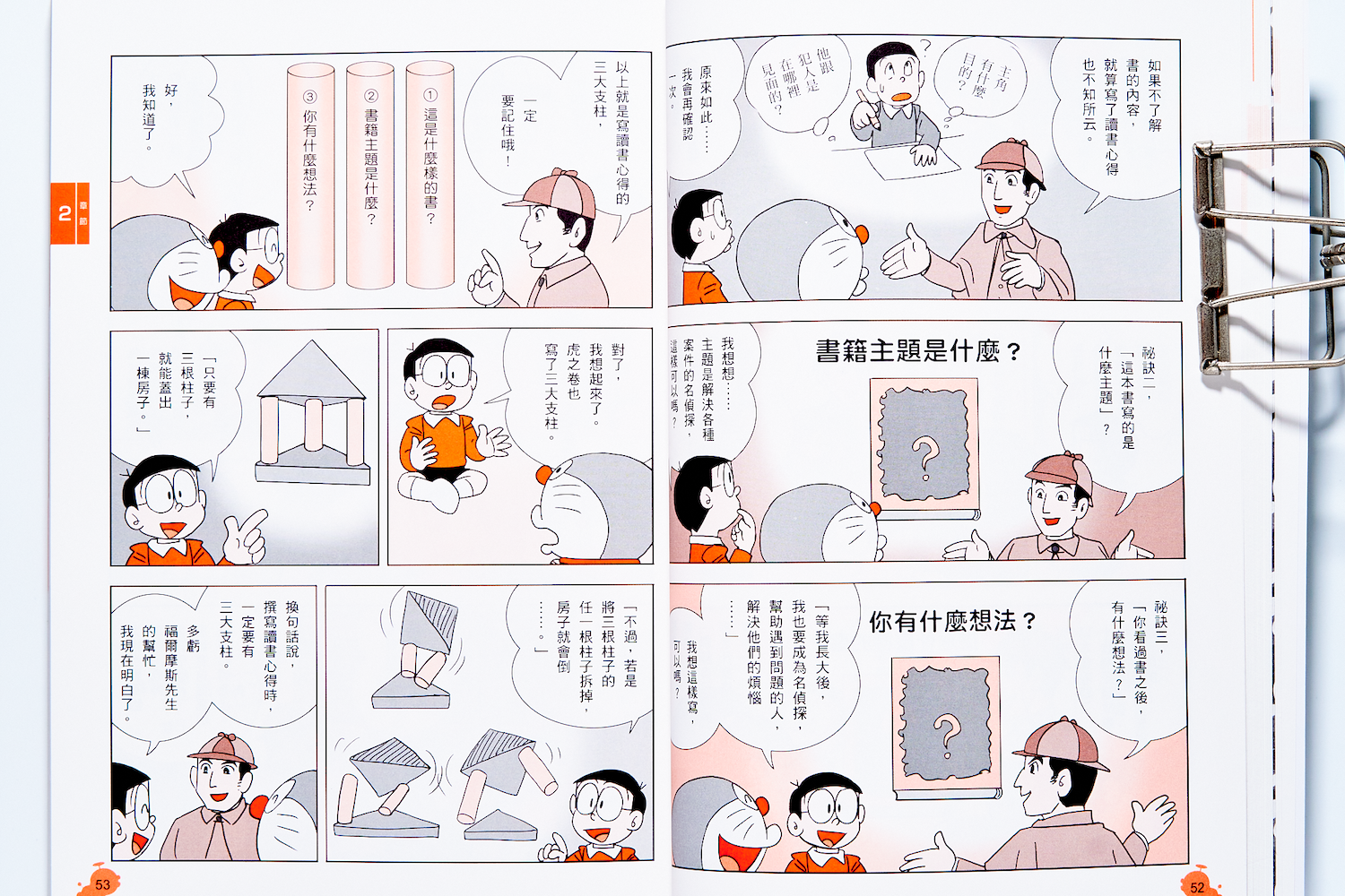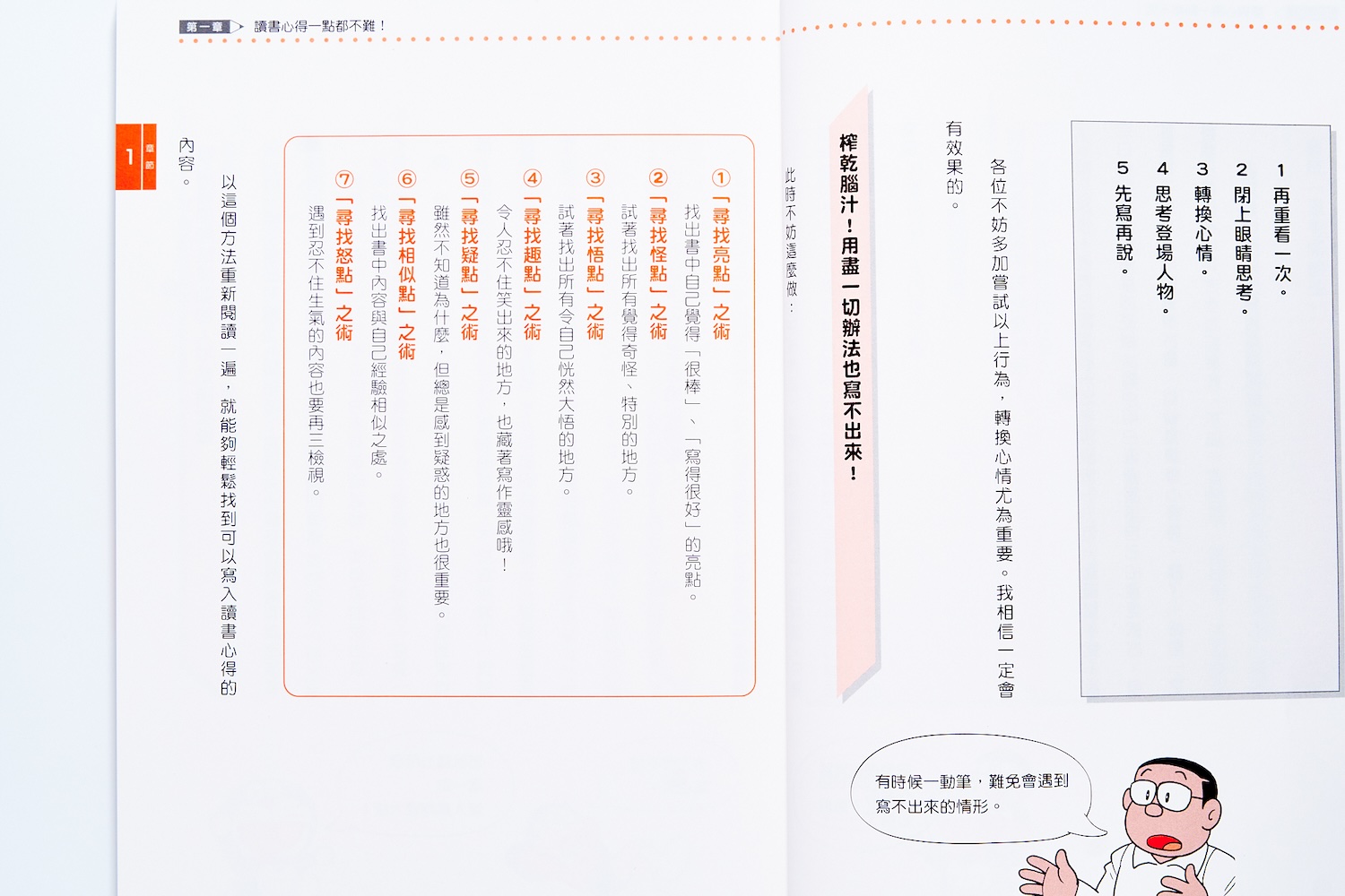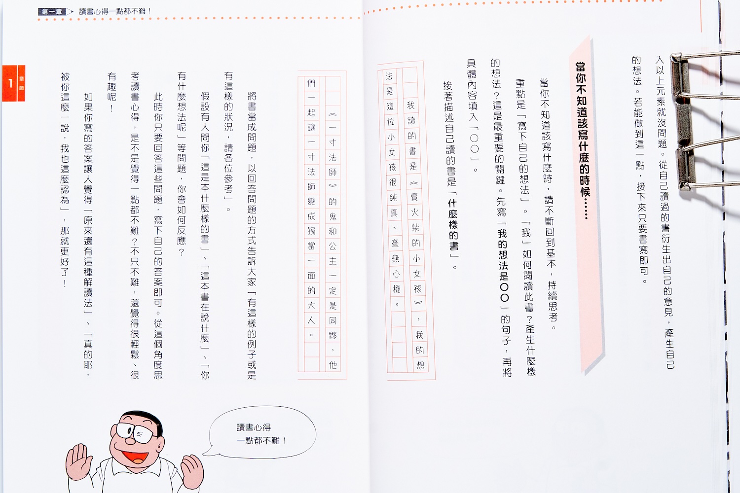 並且為了配合大雄這個超級初學者(也剛好適合小朋友),如何寫讀書心得的方法也被拆解成一步步。像是一開始大雄連寫第一句都沒想法,書裡就說讀書心得就是其實就是你對書的意見,哪怕是只有一句話也好——先不要覺得一句太少、不敢寫。
