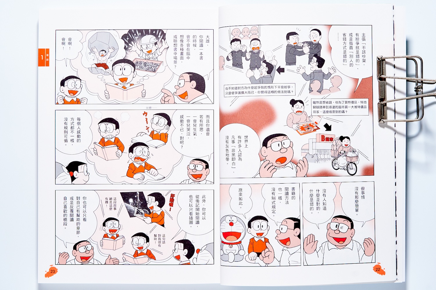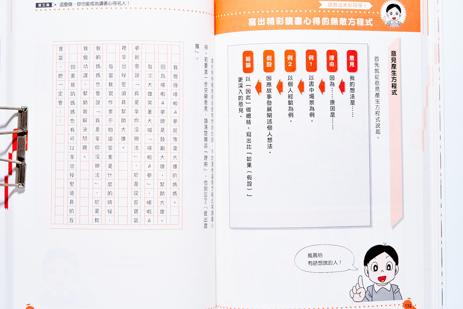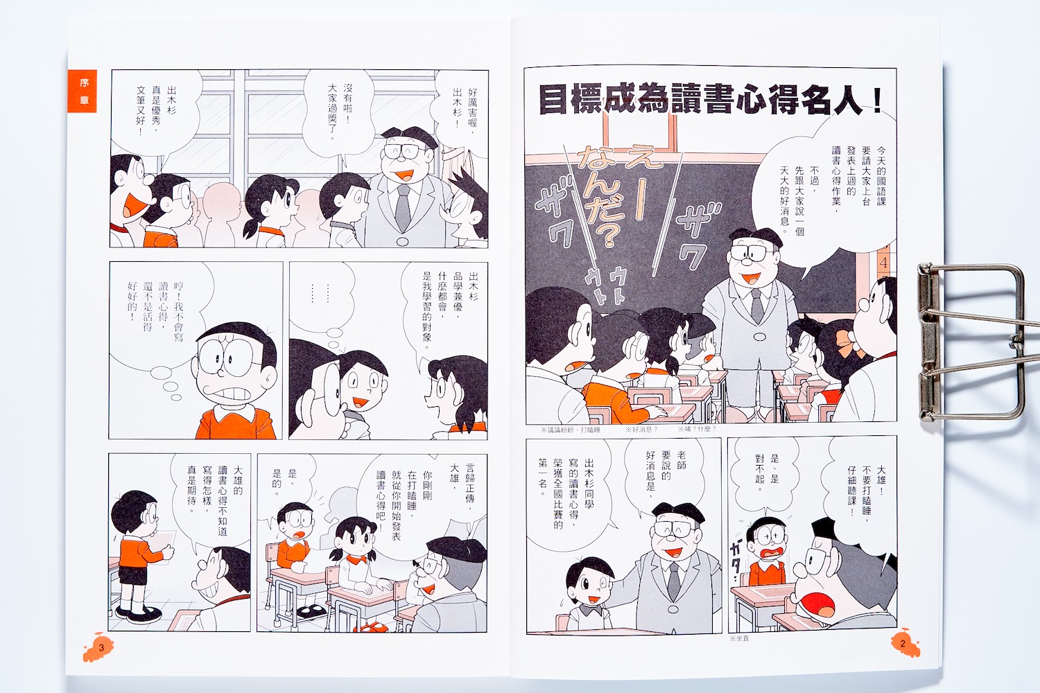 並且為了配合大雄這個超級初學者(也剛好適合小朋友),如何寫讀書心得的方法也被拆解成一步步。像是一開始大雄連寫第一句都沒想法,書裡就說讀書心得就是其實就是你對書的意見,哪怕是只有一句話也好——先不要覺得一句太少、不敢寫。