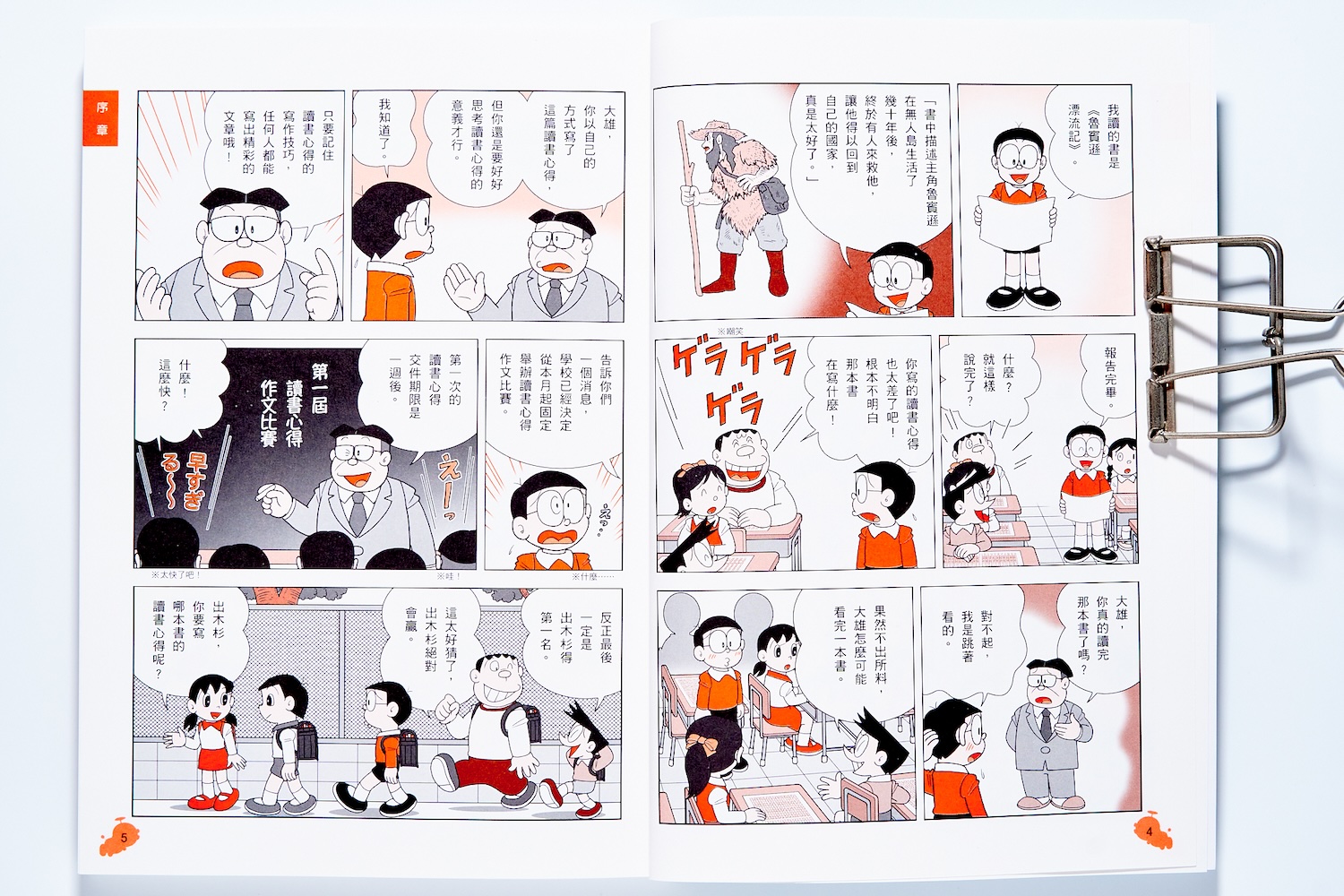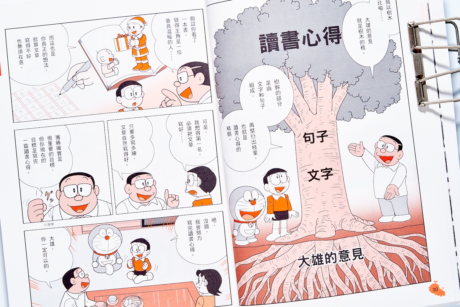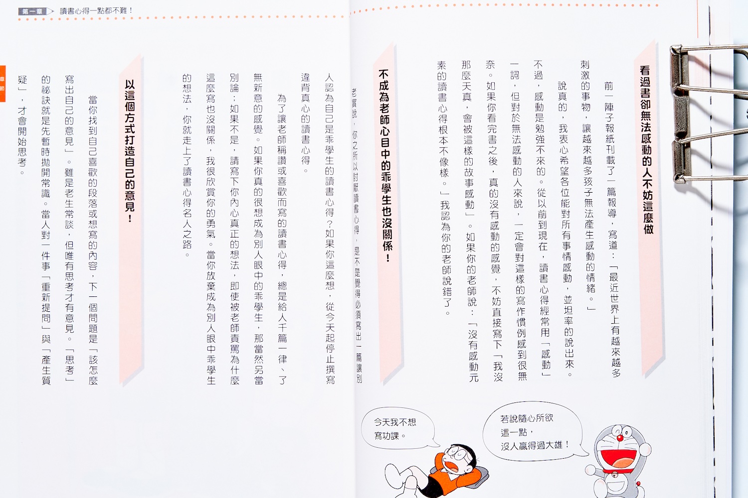 哆啦A夢裡的大雄實在是這本書的最佳男主角,遇到寫功課就出現各種愛睡覺、拖延病、牽拖其他人……不過書裡這次哆啦A夢不再直接提供神奇道具,而是手把手親自教大雄(孩子)寫心得。