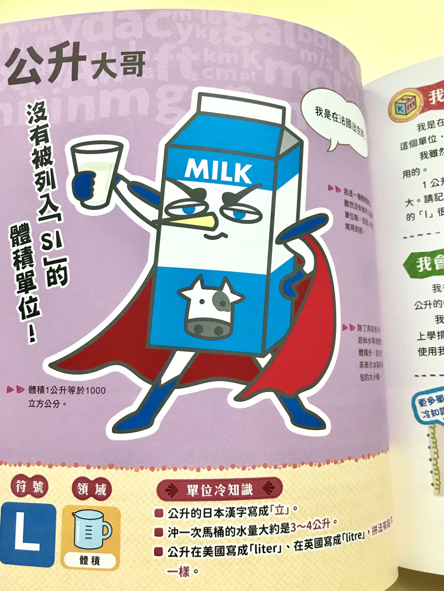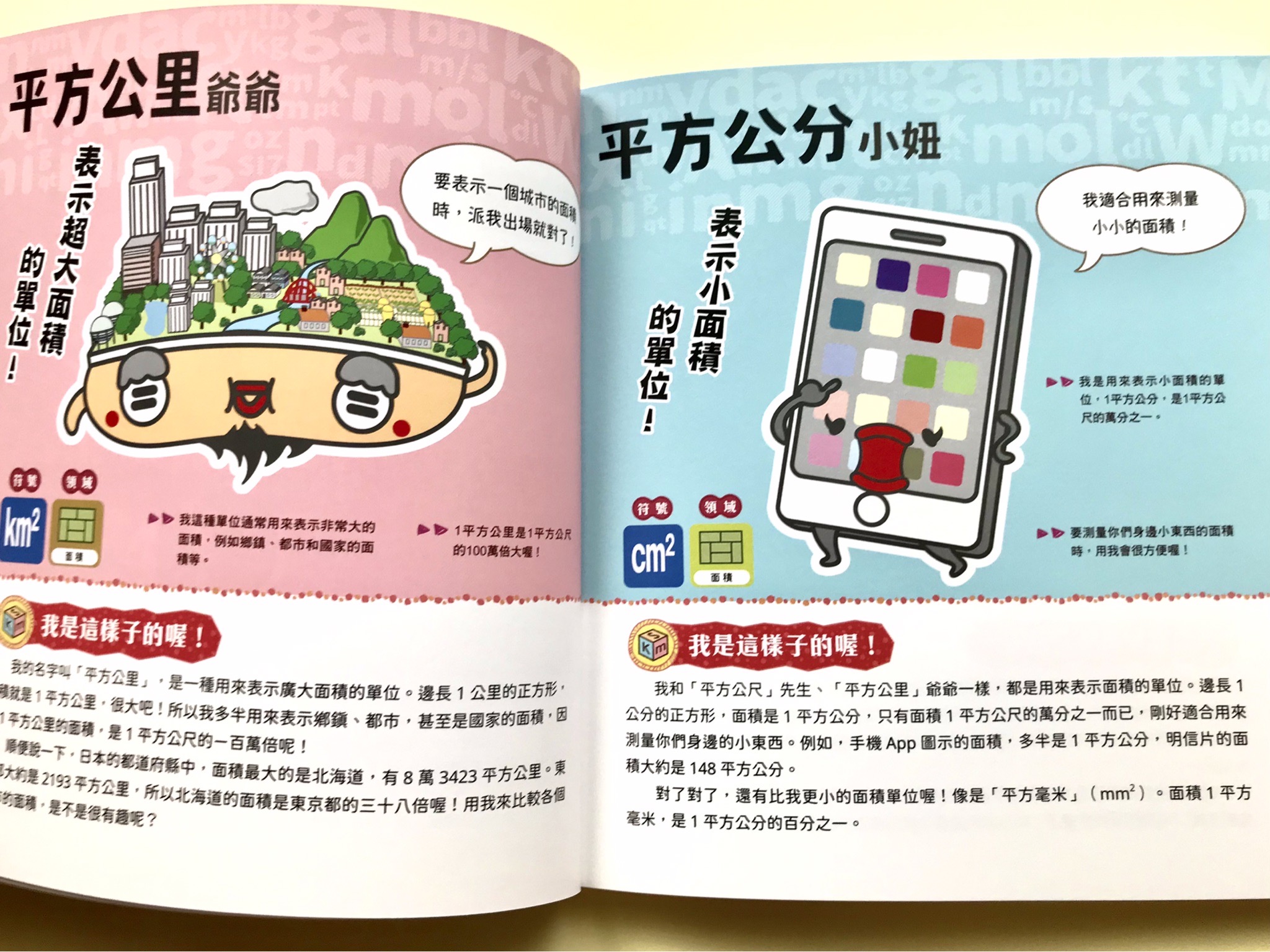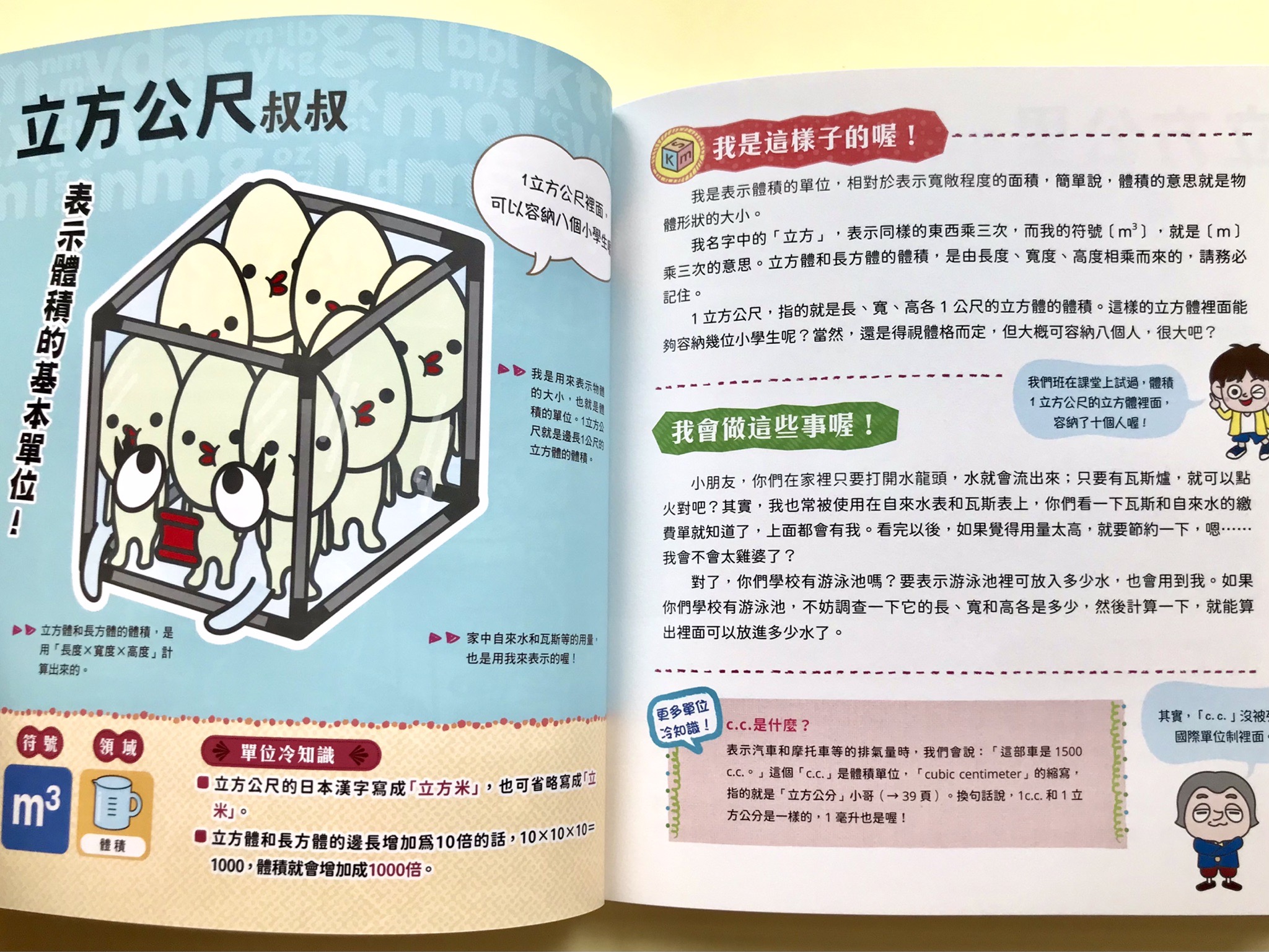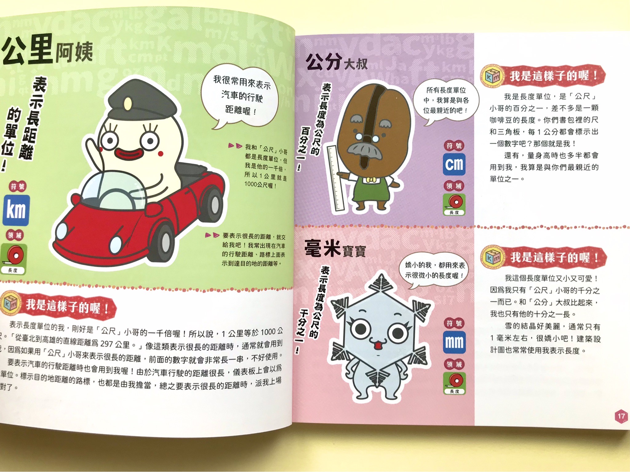 書中就是利用這樣的角色,把每個單位的特點變成圖,方便孩子記憶。旁邊再列舉那個單位的故事,還有實際使用情境。