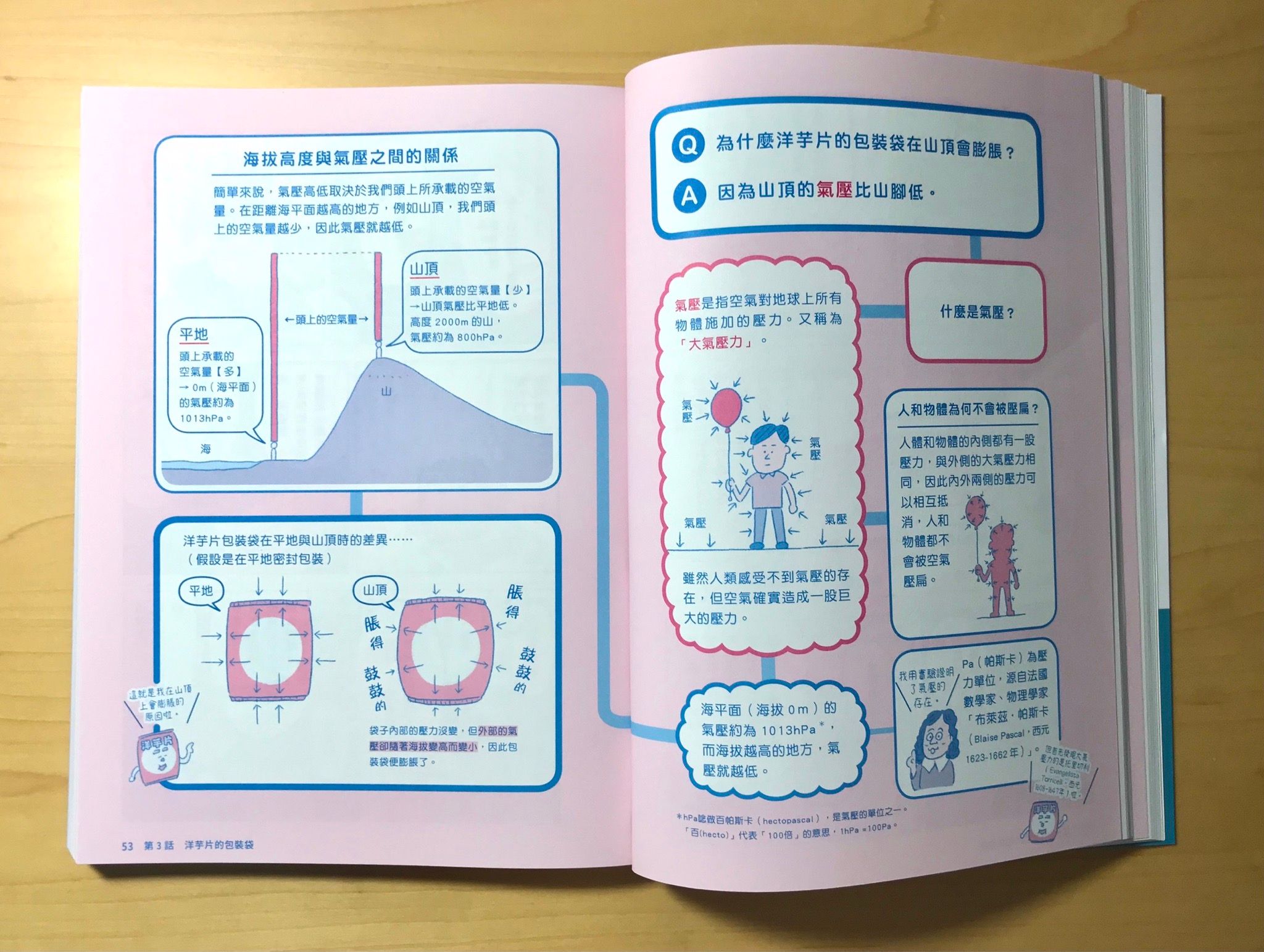 像是波可太跟爺爺去爬山,想到為什麼山上的空氣這麼好聞、清新(對應光合作用),或是背包裡把洋芋片突然膨脹的厲害(對應氣壓)。