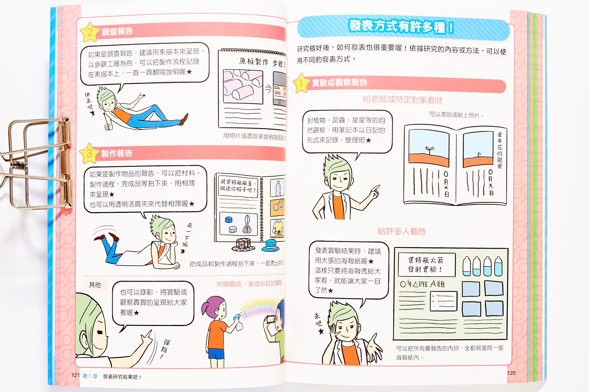 難得的一本書是有範例,可以讓孩子參考怎麼擬定計畫、紀錄分析、以及發表研究。如果想帶孩子做實驗或研究,腦中很常『靈光一閃』就找實驗書來試試看,不過實驗書大多都是讓孩子照著做一遍,以及認識其中科學原理。其實對於真正如何做研究幫助不大。