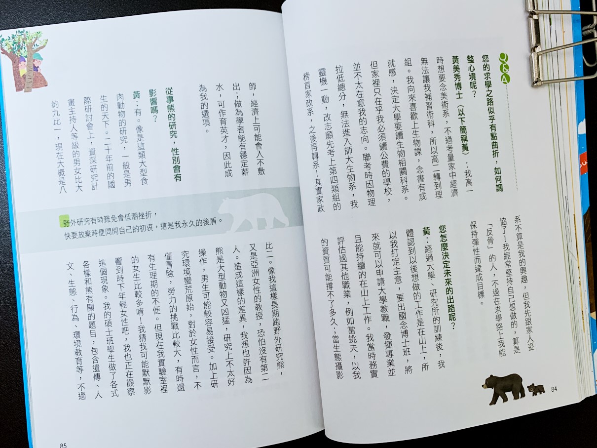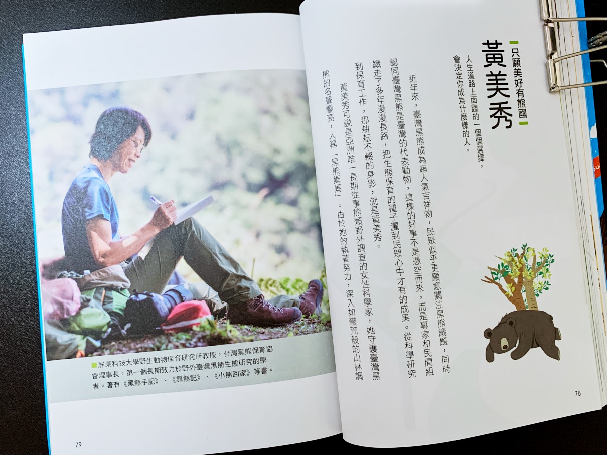 我喜歡每個科學家都有額外的插畫或是照片,是介紹他的工作,可以讓孩子認識。像是研究黑熊就是非常危險且孤獨的生活。