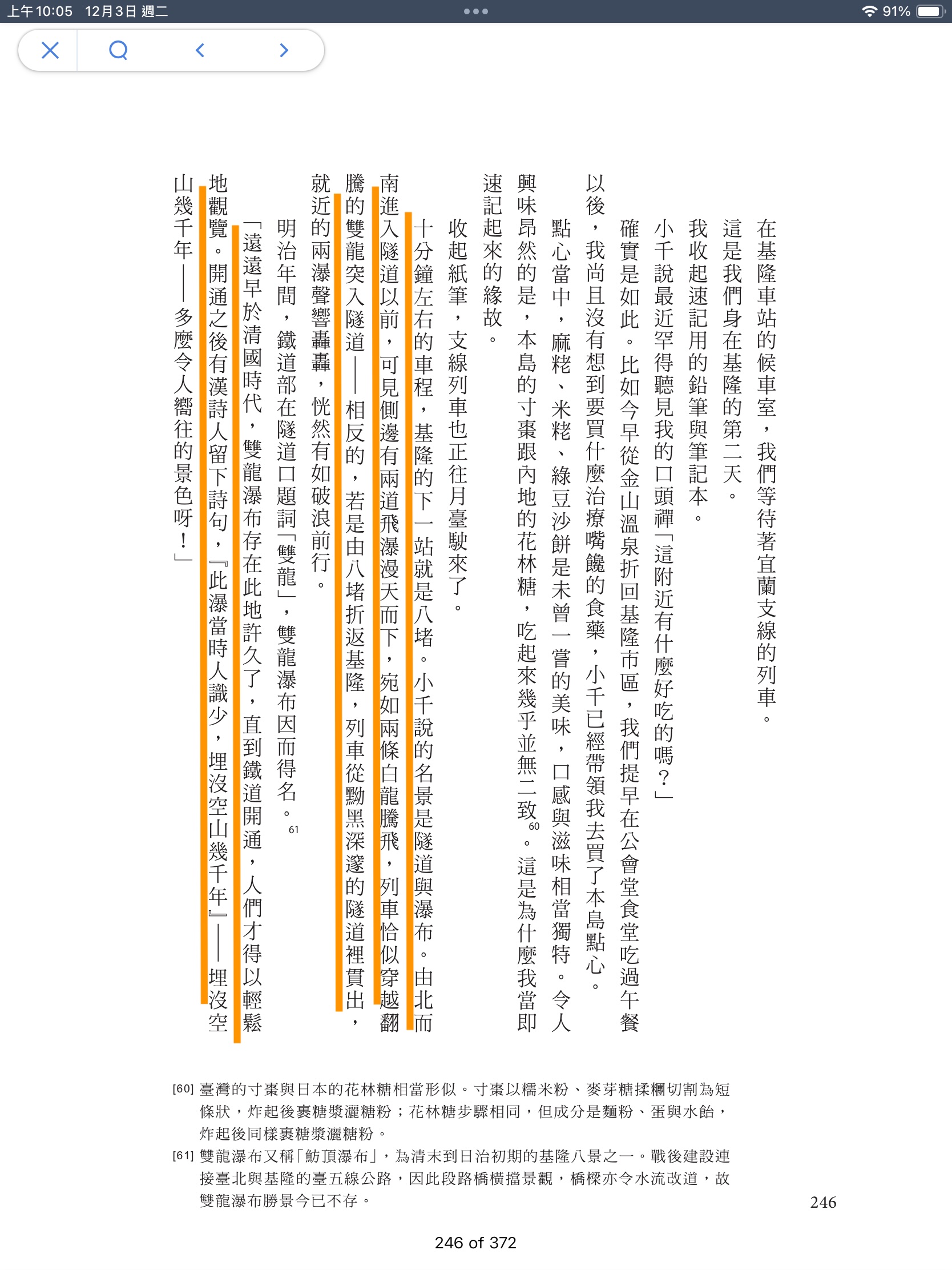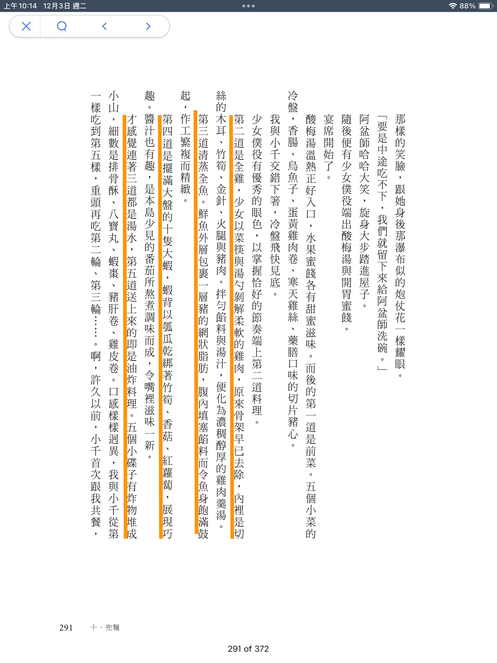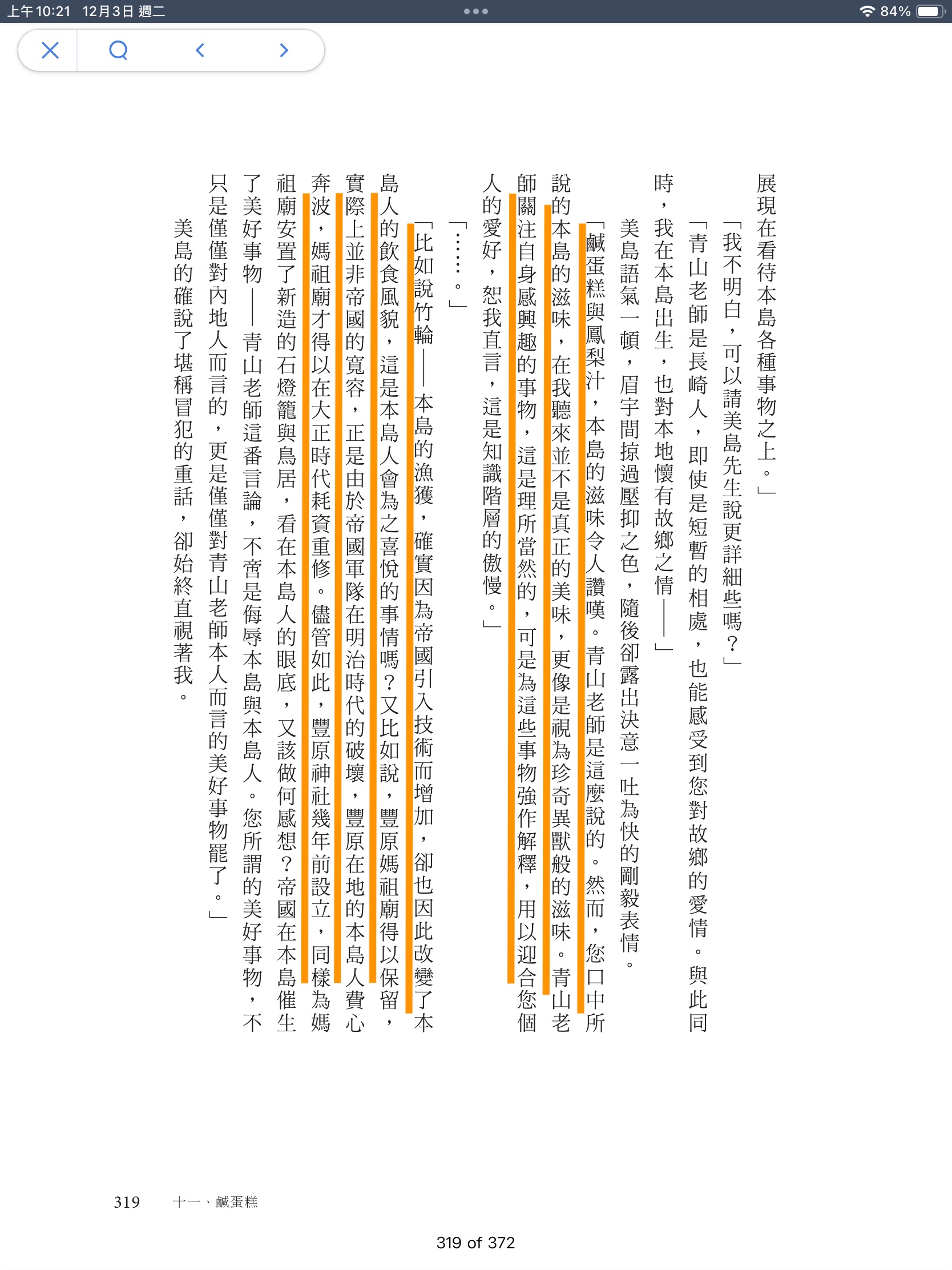 當然書裡的食物不只苦的麻薏湯,也有美味的各種臺灣在地料理,從目錄裡以臺灣在地美食當作的篇名就知道。當中有可甜可鹹的米篩目、有在配角主角轉換自如的肉臊、也有象徵臺灣殖民混合、多元族群的臺式咖哩。