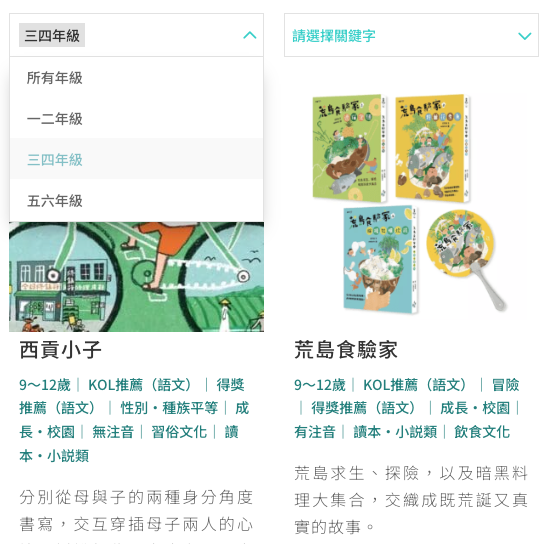 請直接使用下拉式篩選器選擇需要的國小年級以及孩子感興趣的關鍵字。詳細說明,可以點選頁面上方的使用說明按鈕。