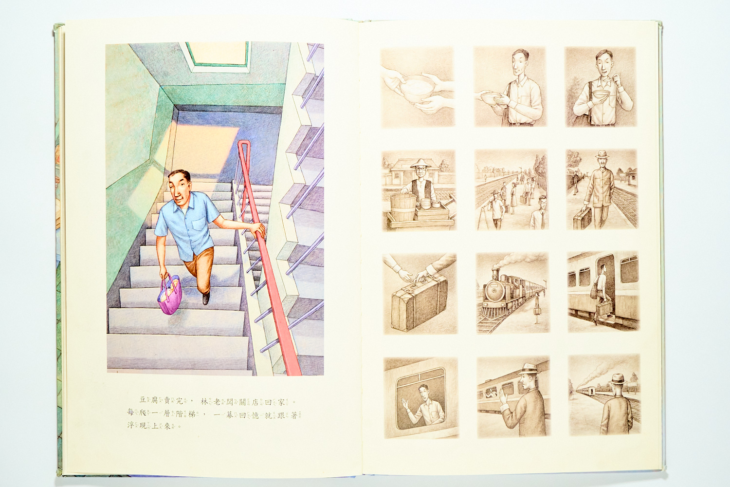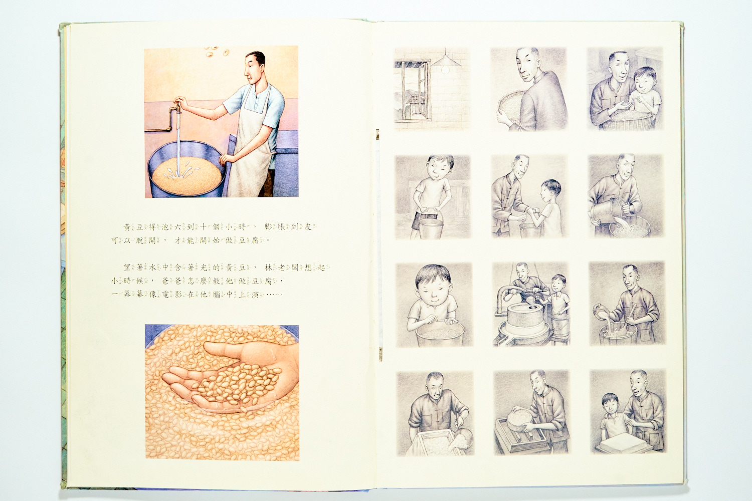 最後,我特別推薦《豆腐》這本文化繪本。主角是一位豆腐店老闆,他一邊磨著豆,一邊在黑白的回憶畫面中重溫父親的身影。這本書有一種安靜的力量,它告訴我們豆腐就像人生:底色是清淡的,但可以隨著加入的配料與料理方式,調出專屬自己的箇中滋味。