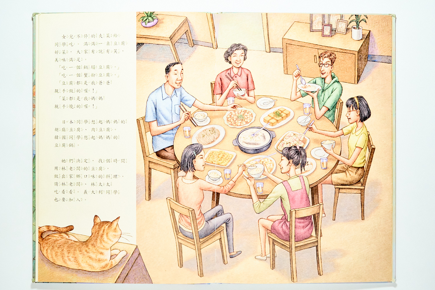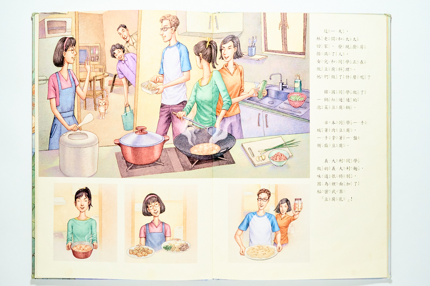書末透過不同國家的女兒同學來訪,展示了豆腐料理如何跨越國界串聯情感。這讓孩子明白,食物不只是填飽肚子,它也是一種分享愛與回憶的語言。