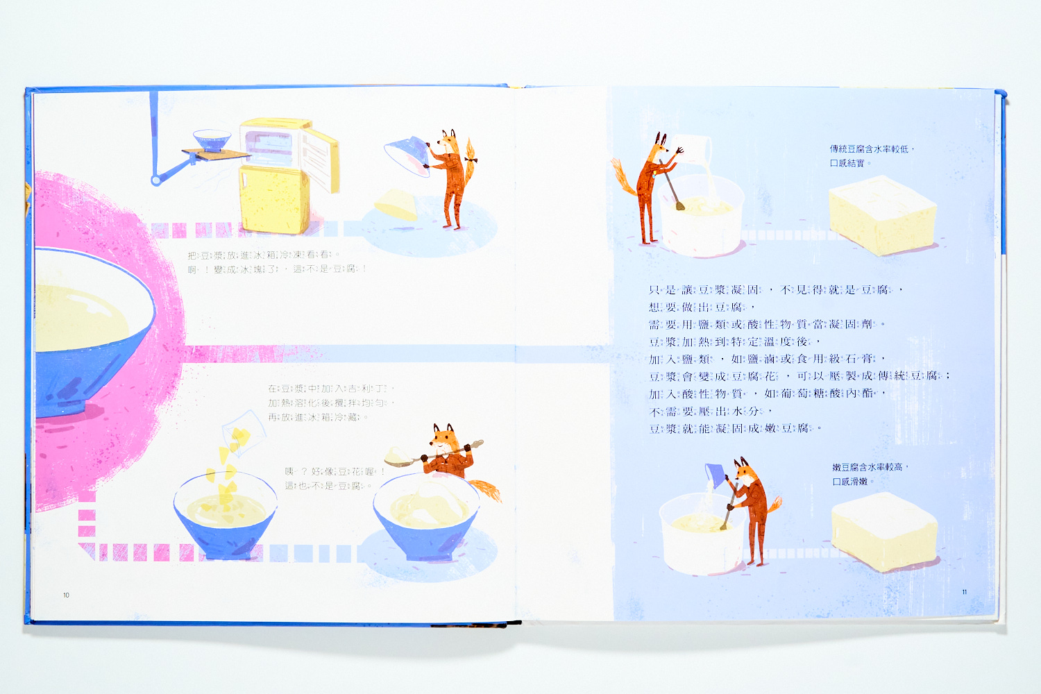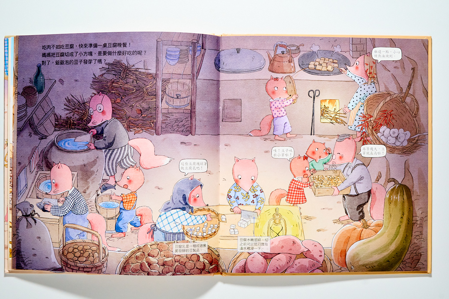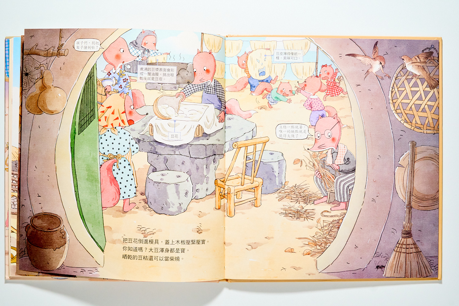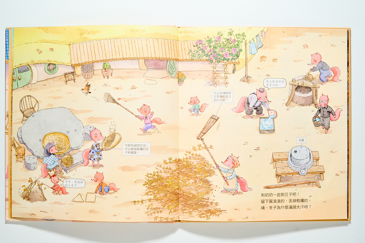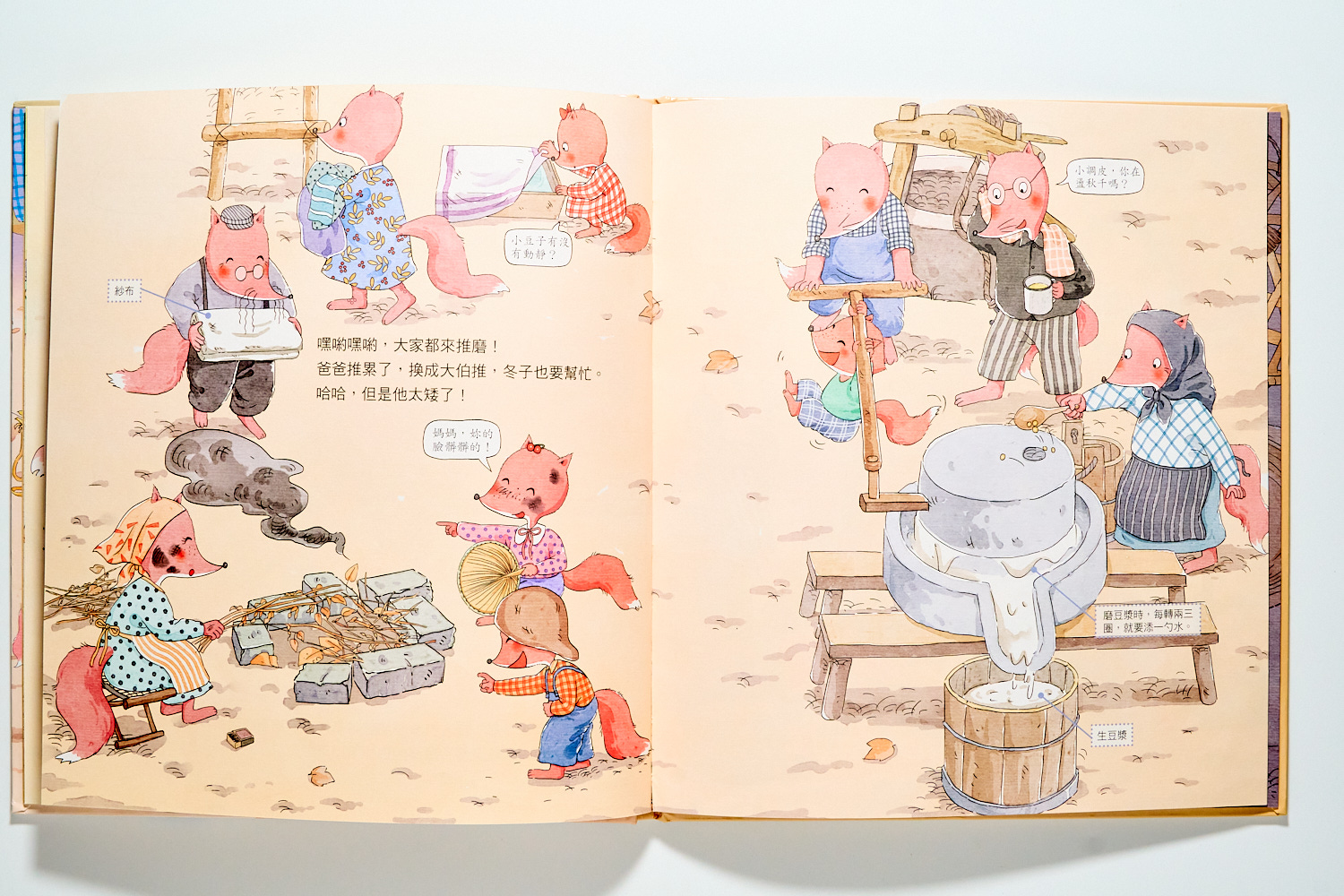 相比之下,《磨豆腐》則是透過狐狸大家族的故事,帶我們回到最傳統中國農村生活。你會看見黃豆的一生被澈底利用,連晒乾的豆桿都能當作燃料。石磨轉動出的不只是豆漿,更是一種「物盡其用」的古老智慧。兩書對比,孩子能直觀看見「自動化」與「手工感」的差異。