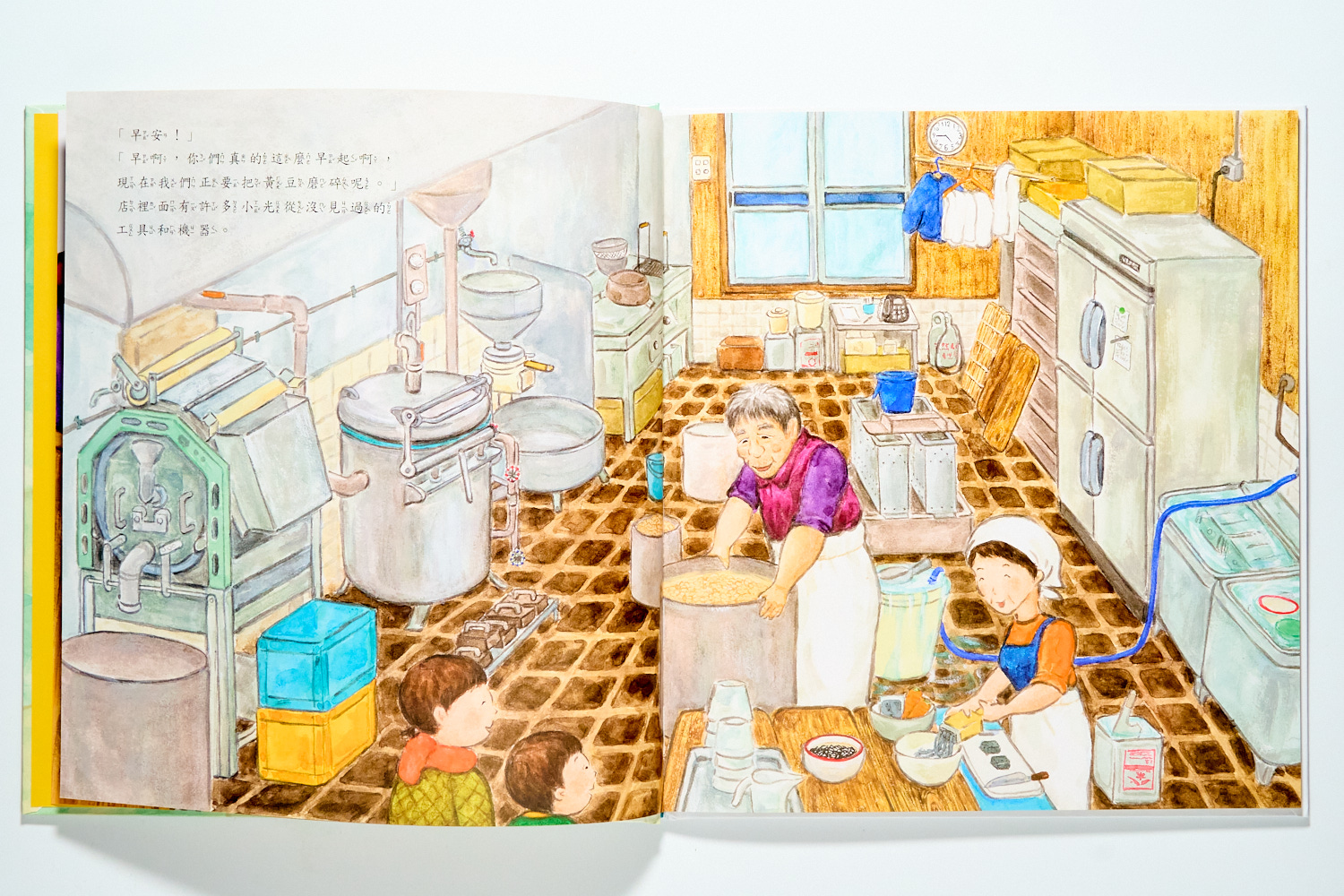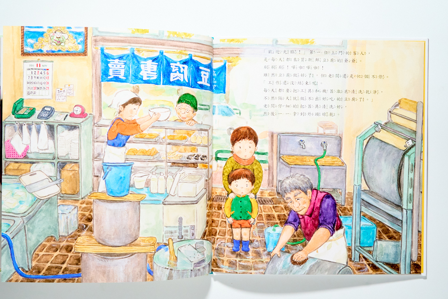 在《好吃的豆腐》中,我們走進日本市場那種熟悉的熟食小店。這本書細膩描繪了職人的現代化作息:雖然使用機器輔助,但從選豆、濾豆渣到前臺銷售,那種「專注做好一件事」的節奏感非常迷人。