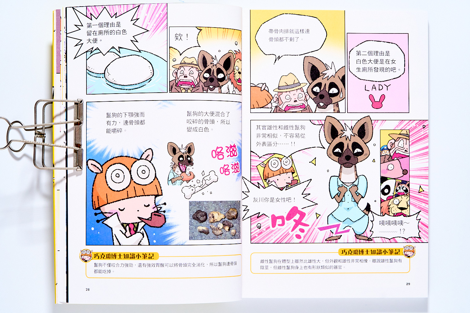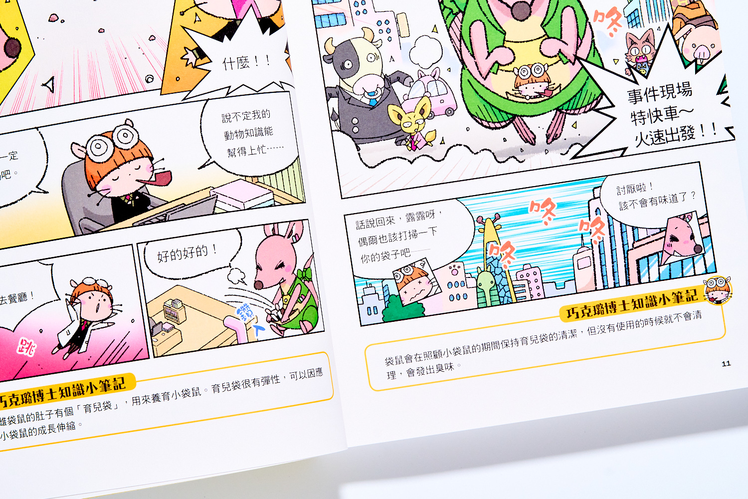 除了事件裡本身藏有的知識外,每頁底下還有一則對應故事情節的知識補充。這個知識補充短短的,很好讀,再加上是對應頁面情節的梗,所以就讓孩子讀完故事後,會習慣去找這頁底下的知識補充。這樣很有巧思的設計就可以避免孩子在看這類知識漫畫時,發生只看漫畫、不看知識的狀況。