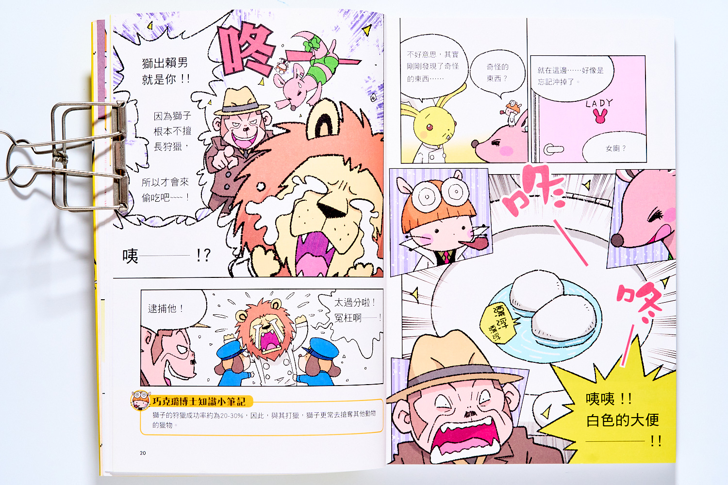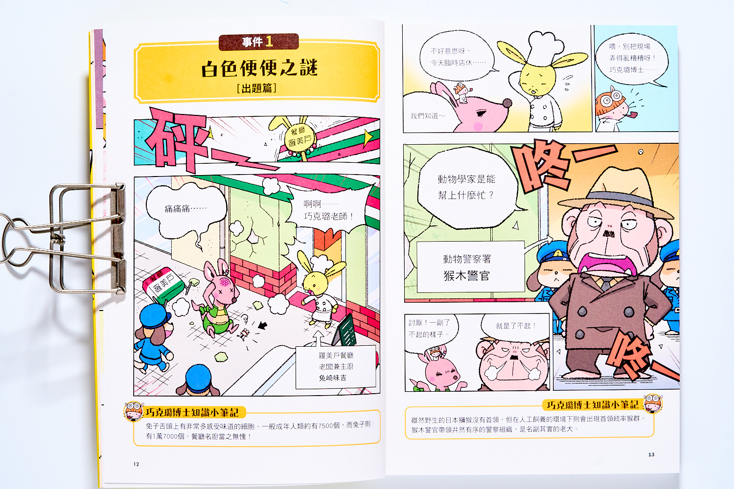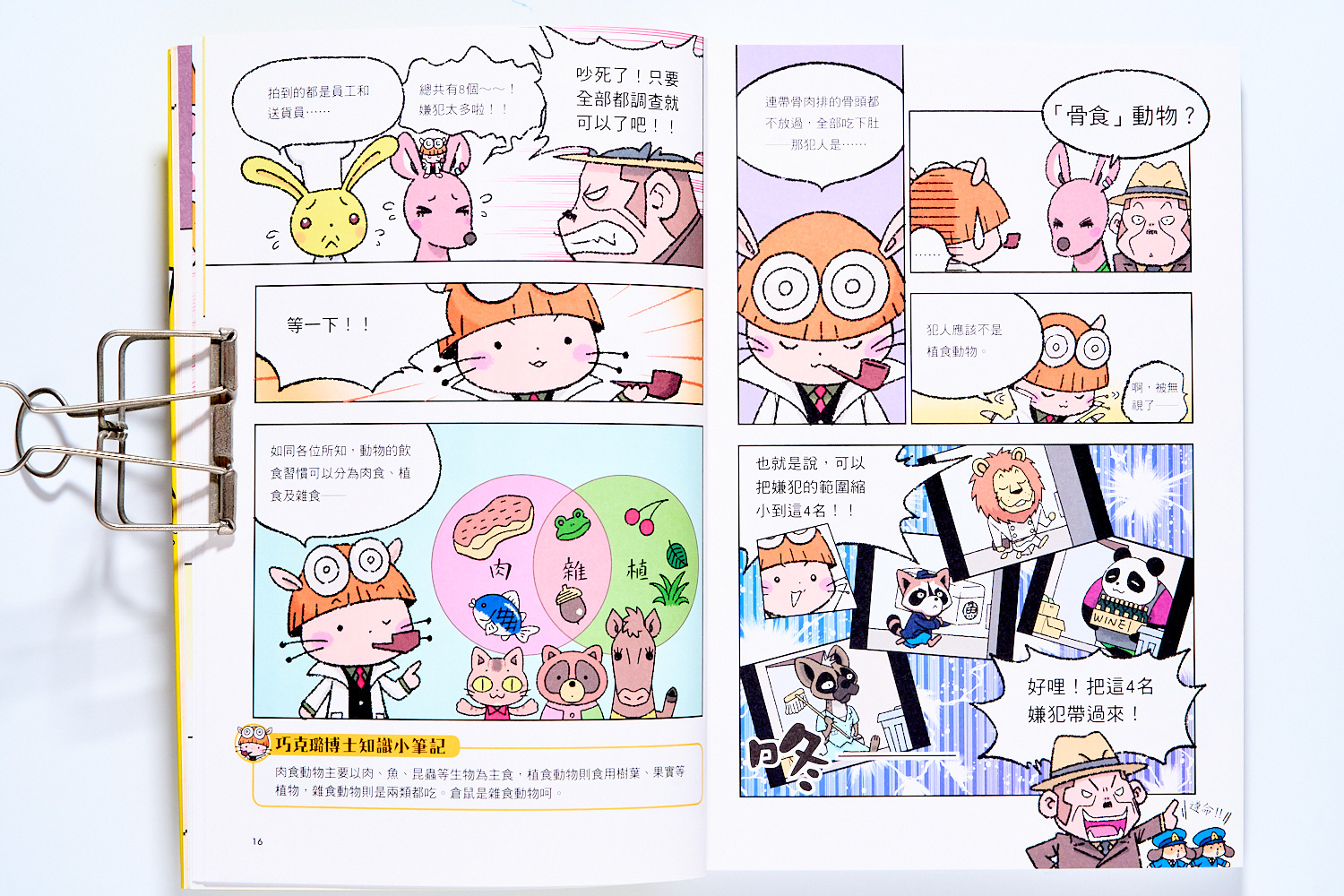 像是一開始的『白色便便之謎』就是兔子老闆的餐廳發生的肉排偷吃事件,倉鼠就運用動物的食性,再結合特定肉食動物的習性,最後找出白色便便的犯人。
