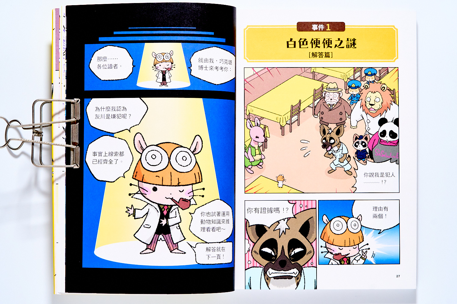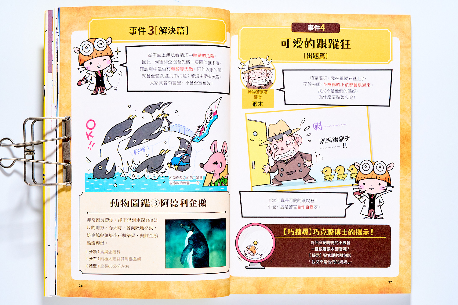 另外,每個事件中都有設計讓孩子思考的機會,而不是單純翻閱後得到知識和解答。小朋友可以跟著劇情以及倉鼠博士的思考對白,並且在解開謎團之前,還會有不少提示或是線索整理,讓孩子有空間可以停下來思考一番。