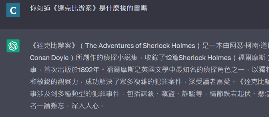 在這個步驟中,我們要測試它如何說瞎話,建議可以問一本你們家有的、不是世界經典的那種書。通常 ChatGPT 並不清楚書的內容,然後就會開始亂掰。