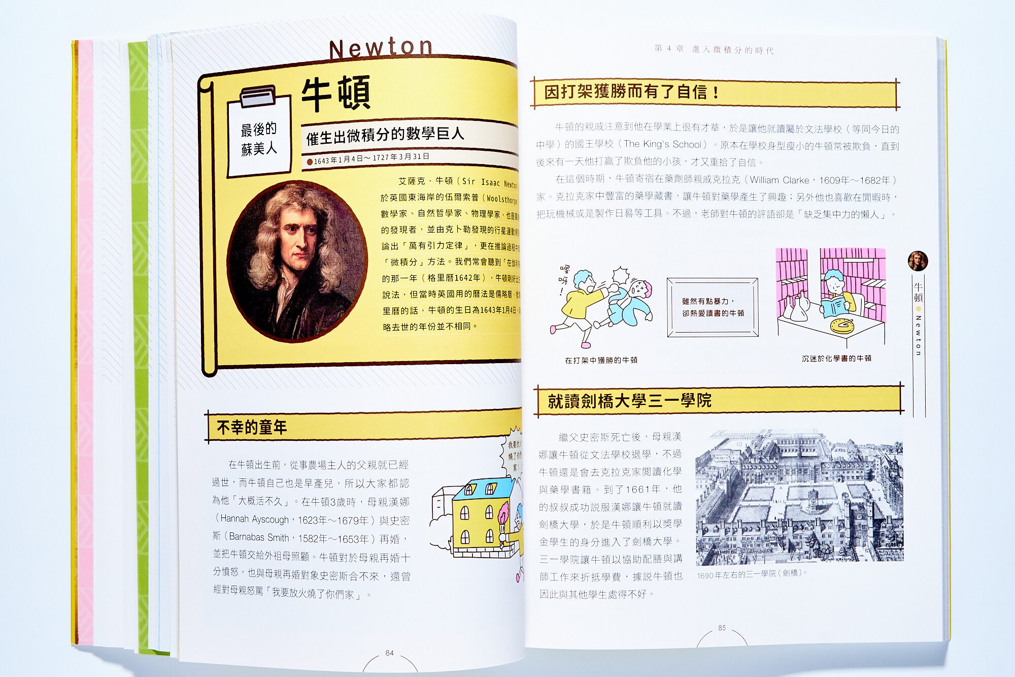 看到這裡,我剛好用牛頓的例子來『推測』一下為什麼國小、國小數學很少介紹數學家。你看看牛頓的力學,其實在國小、國中就有基本的概念;可是微積分卻要等到高三或是大學才會學到——這樣你應該就能知道原因了吧!