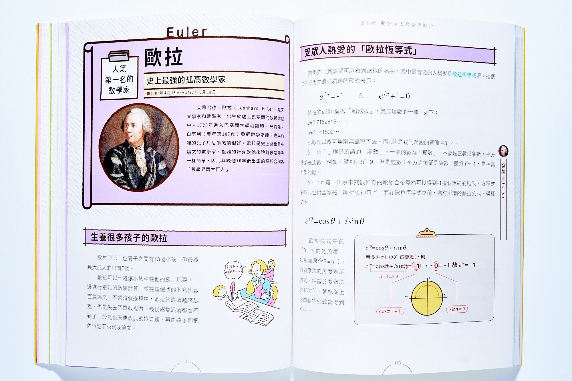 書中的內容是每位科學家會分成兩個部分,一個是生平趣事以及他們的重要研究——也就是很數學的部分。有些數學家生平故事確實趣味、古錐到不行,像是大數學家歐拉,因為小孩生很多,所以不得已就邊帶孩子、邊寫數學論文。