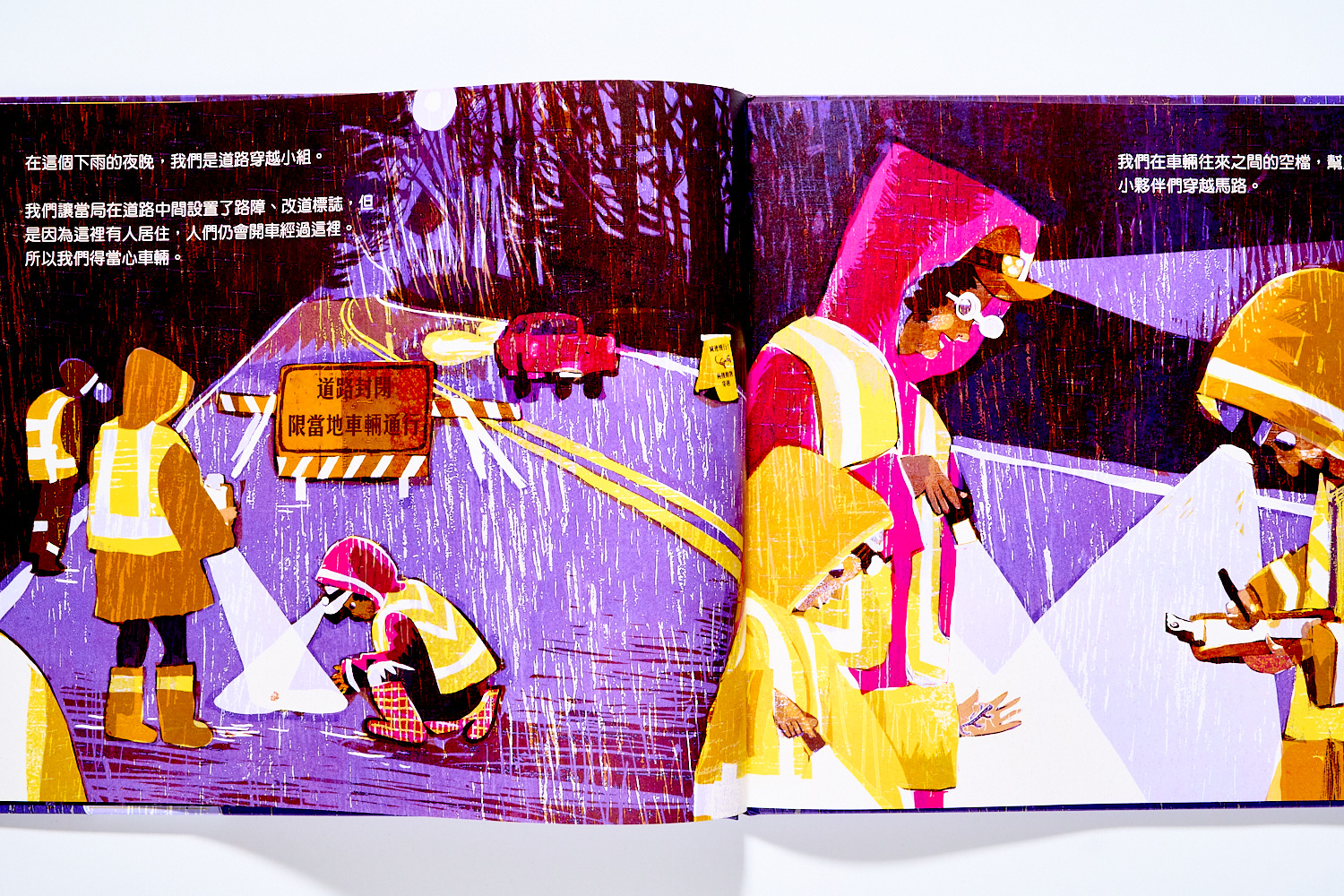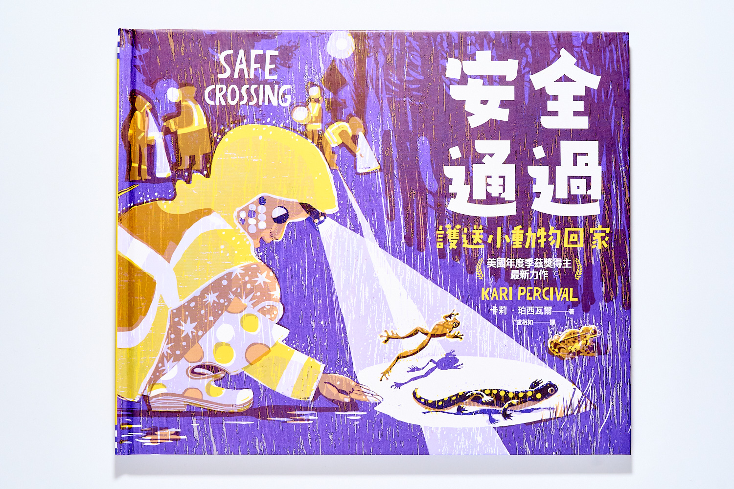 這本替兩棲動物建立生態廊道的繪本,是作者改編自美國麻州有一群志工會在每年春天夜晚,冒著大雨以及在馬路上穿梭的風險,『親手』把一隻隻青蛙、蠑螈從馬路的一頭,『拎』到另外一頭的保育故事。