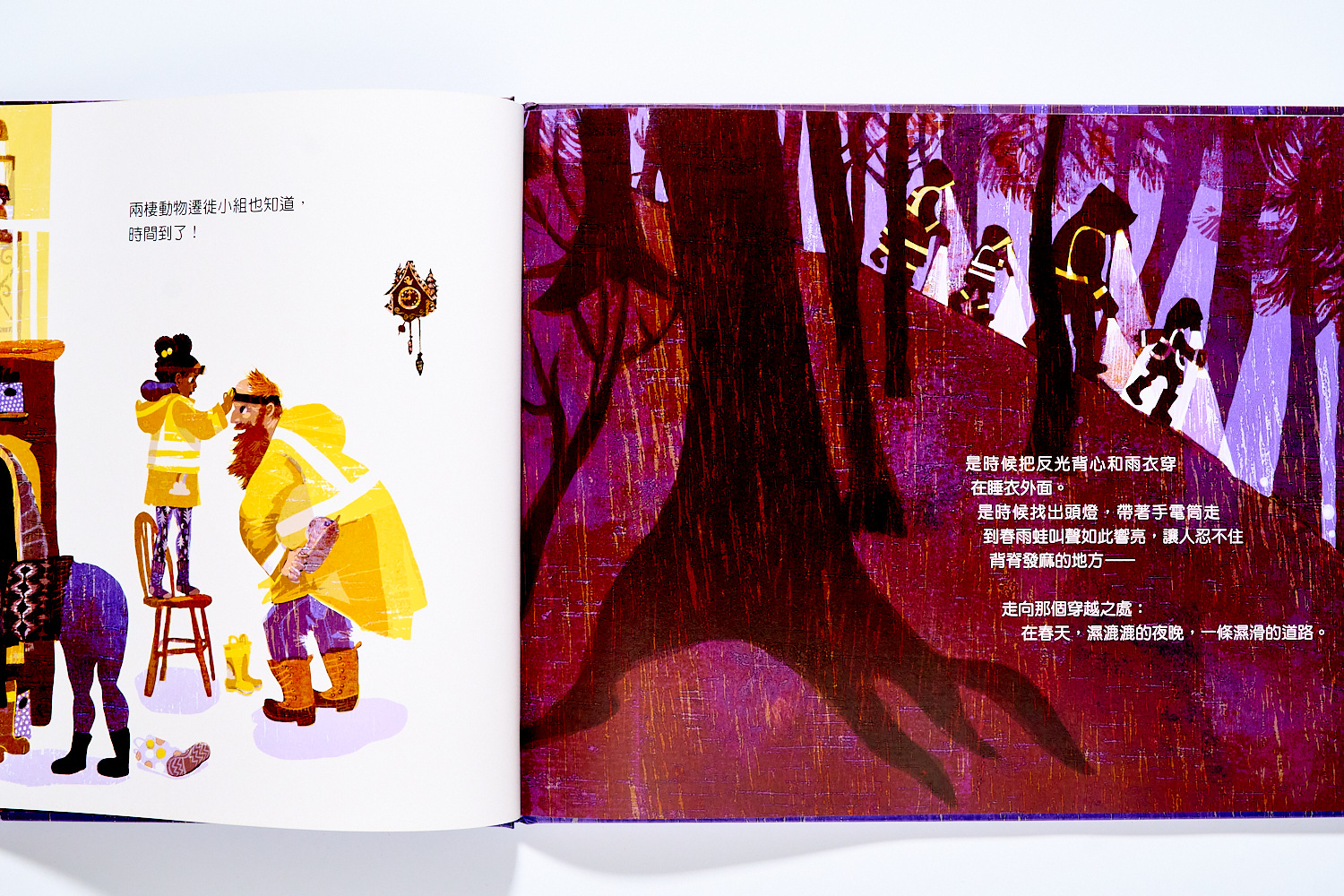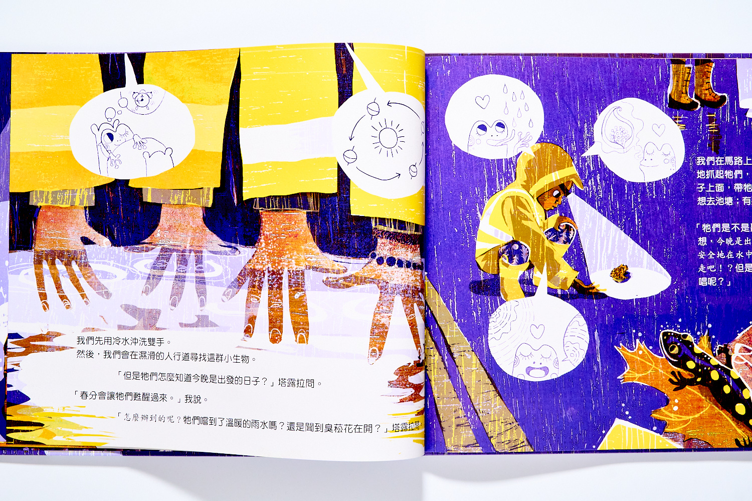 身為當地的志工小隊,大人和孩子們只要聽到春天大雨來時、就要穿上裝備跟著青蛙發的響亮叫聲出門。是時候、是時候,感謝譯者非常厲害的保留原文的韻味。