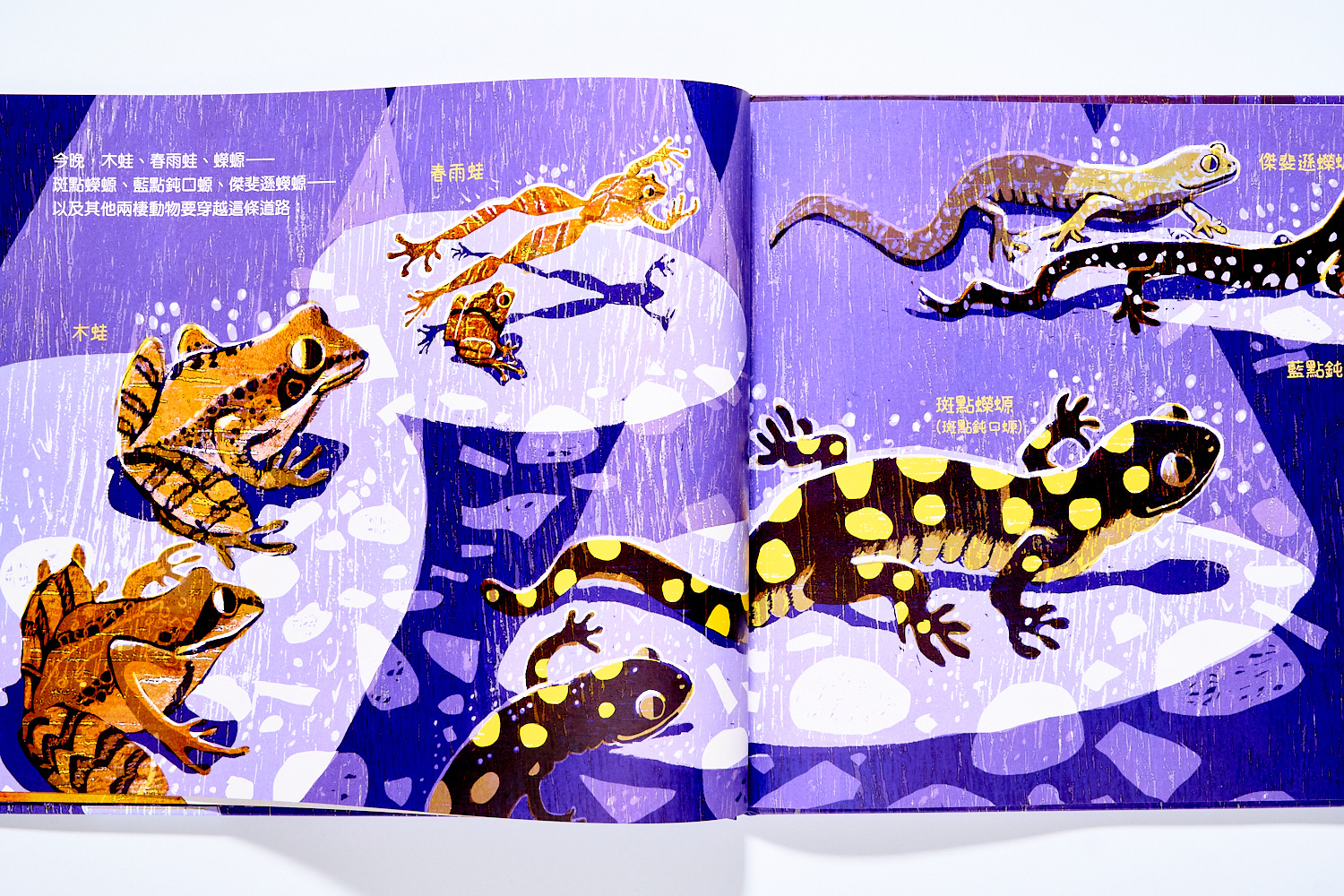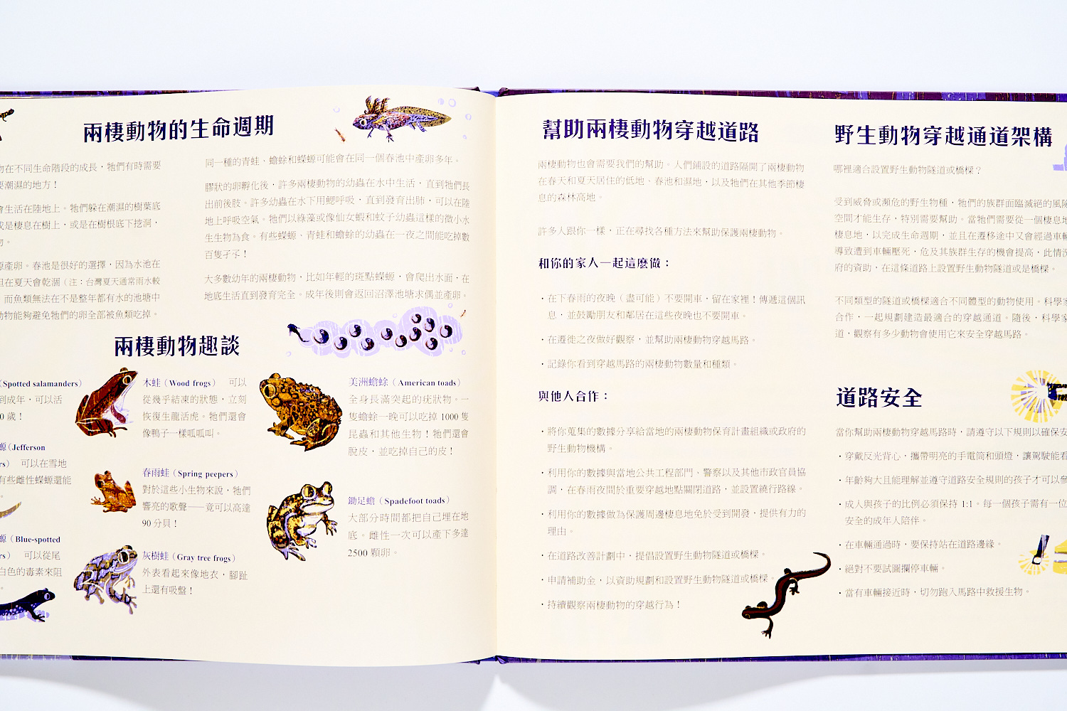 有各種青蛙與蠑螈,詳細的資訊都有在書末的附錄介紹。這些小動物們正要往他們的出生地前進,繁殖下一代。