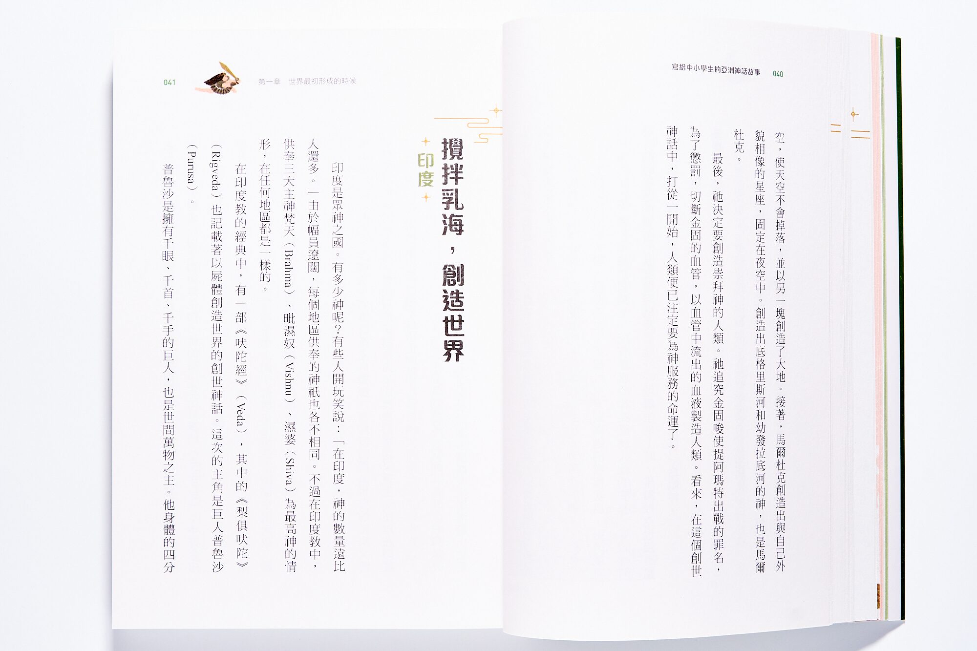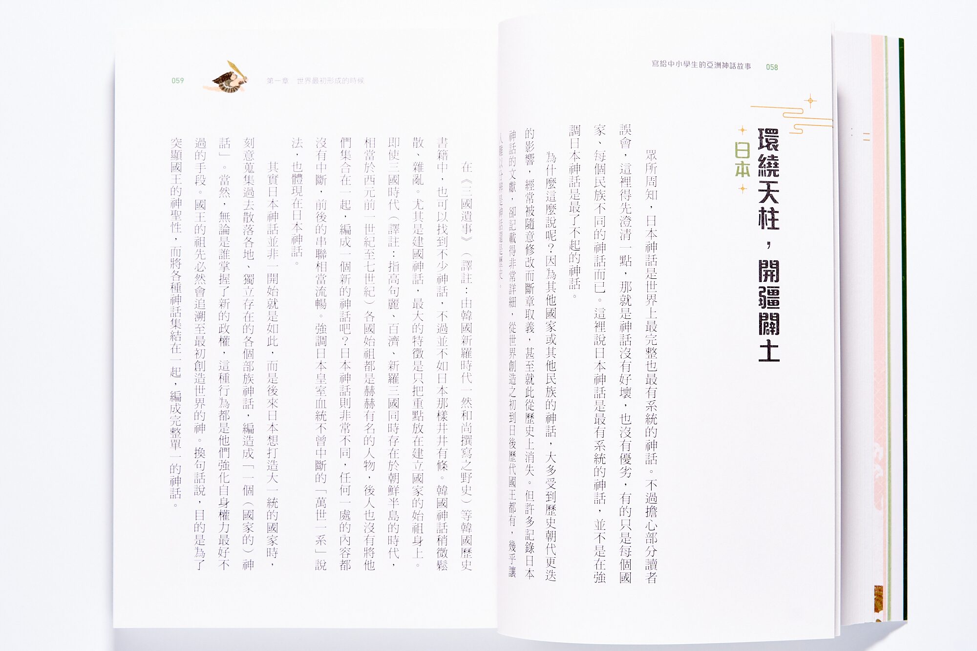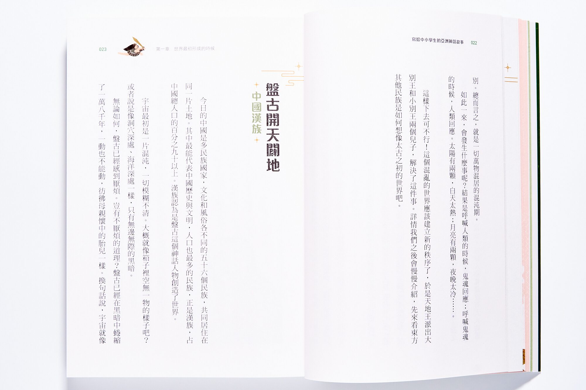 《寫給中小學生的亞洲神話故事》收集了來自於亞洲國家的神話故事,包含中國、印度、日本、蒙古、波斯、美索不達米亞等等,除了亞洲神話本來就是少見的題材外,作者也把這些故事分成世界生成到毀滅、人類誕生、英雄崛起、或是與自然共存身等大主題,並且在每組故事ˋ主題前都會特別撰寫導讀,讓孩子知道為什麼會有這些神話誕生,以及這些神話怎麼對人類社會造成哪些影響。