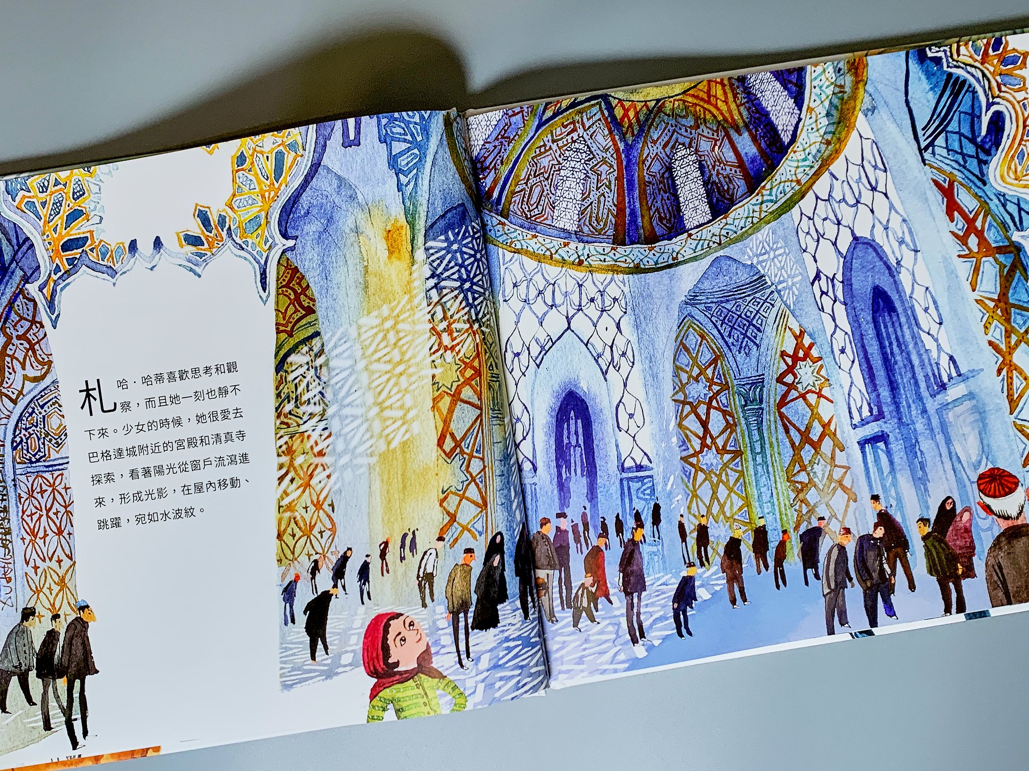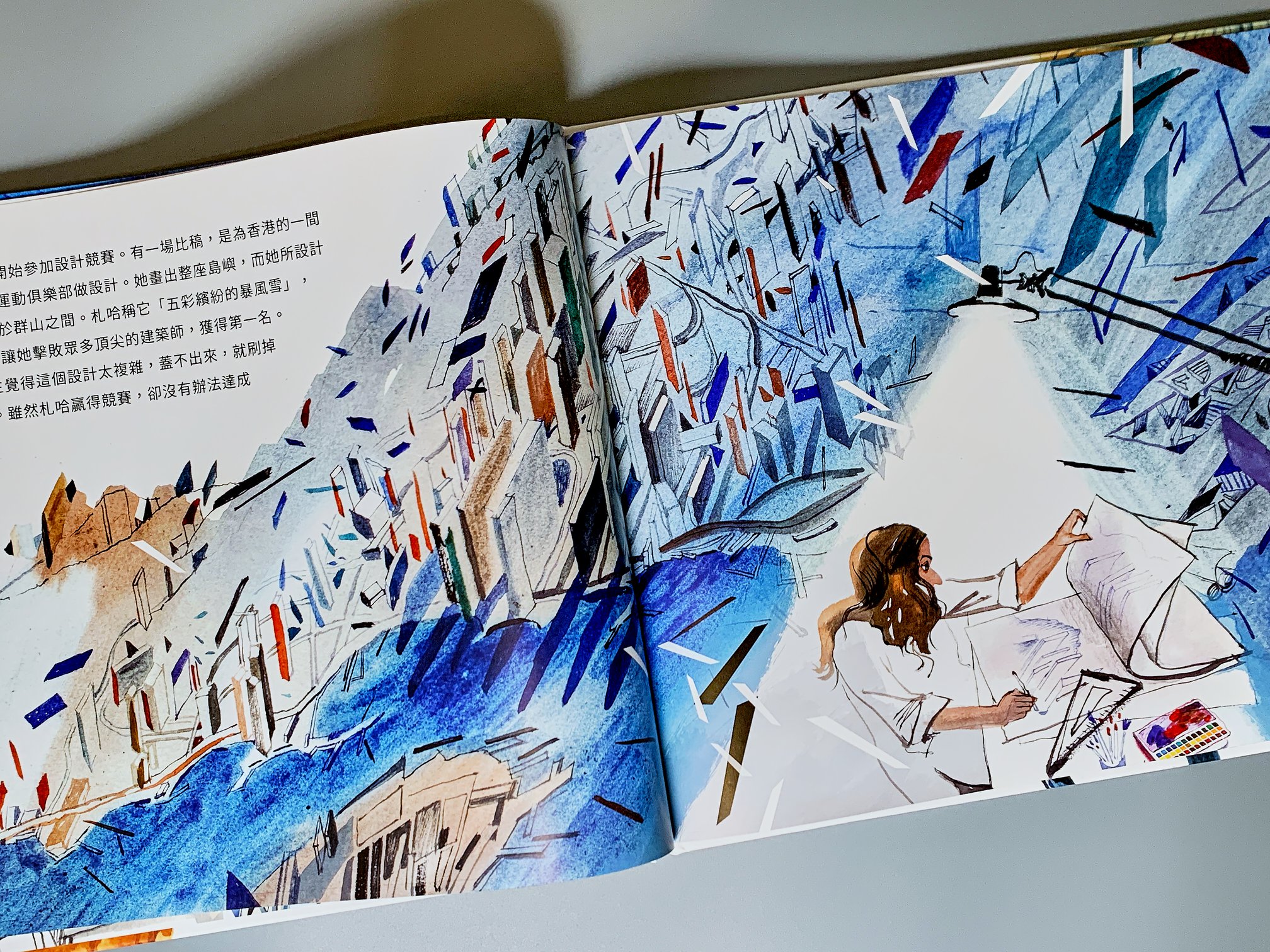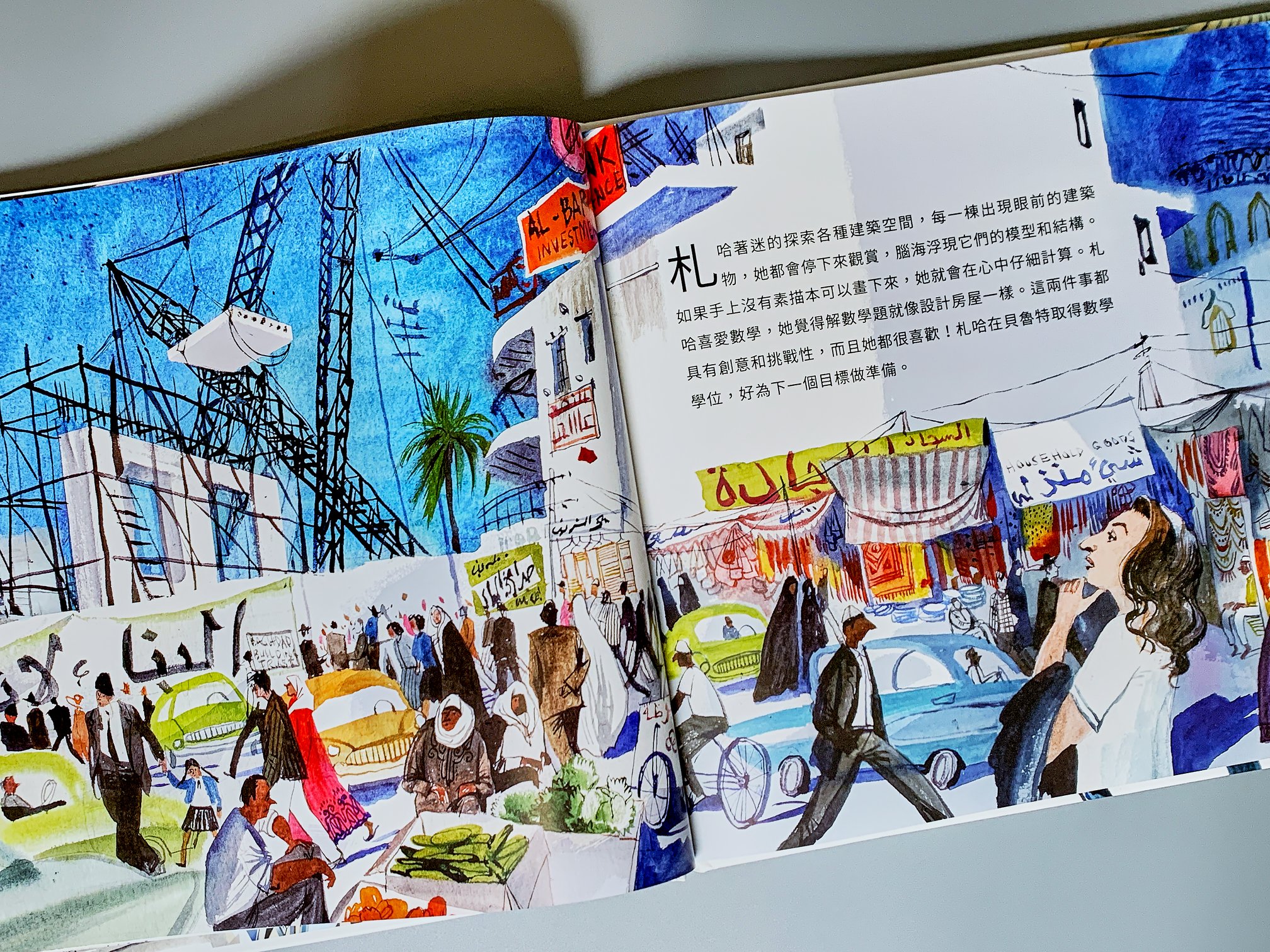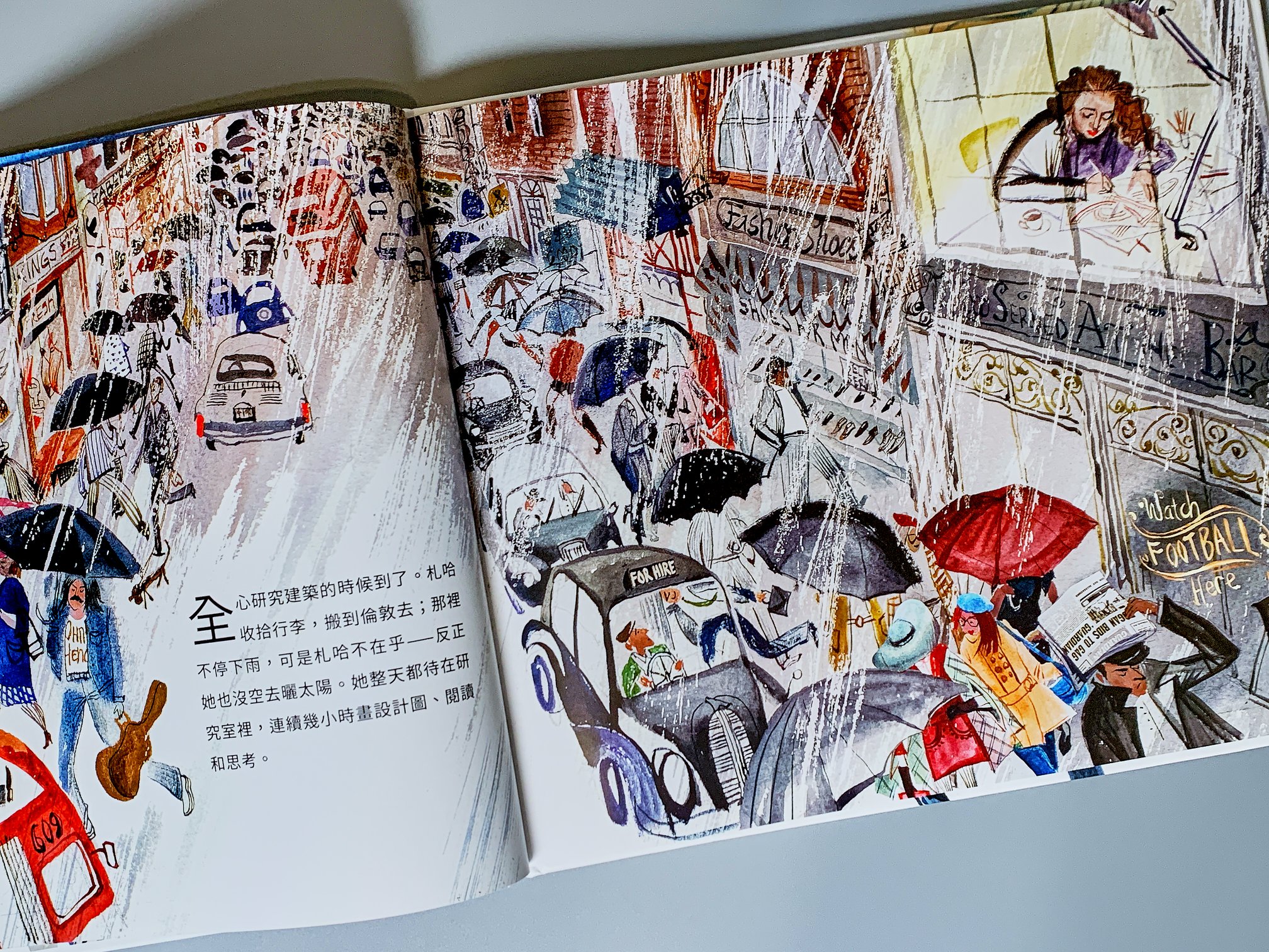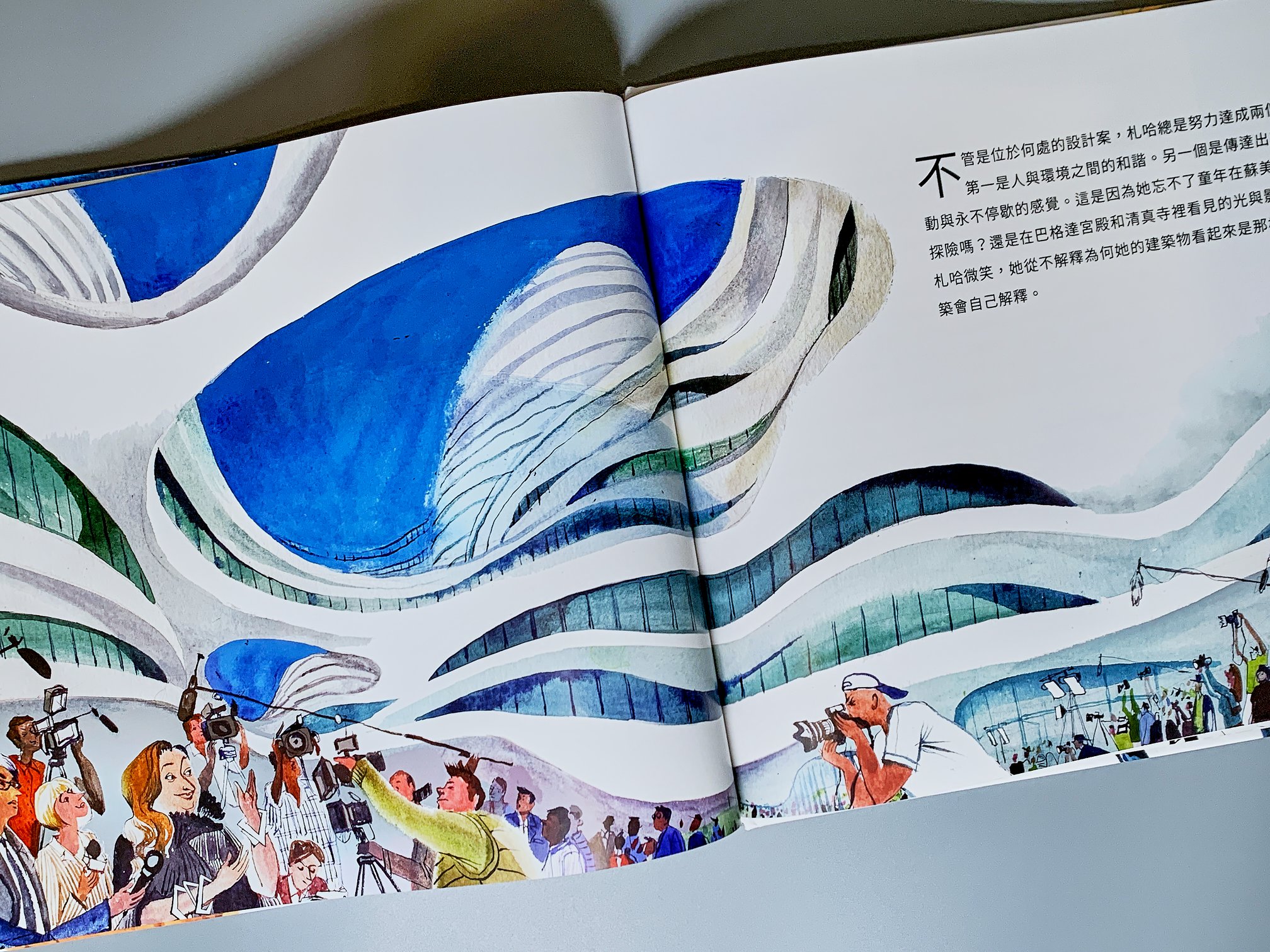 這樣的視覺也充滿在這本書裡,畫家用手感的水彩作畫,線條隨性又飄逸,像極她的建築風格;有時候誇張、奔放的構圖,就像是本人風格。