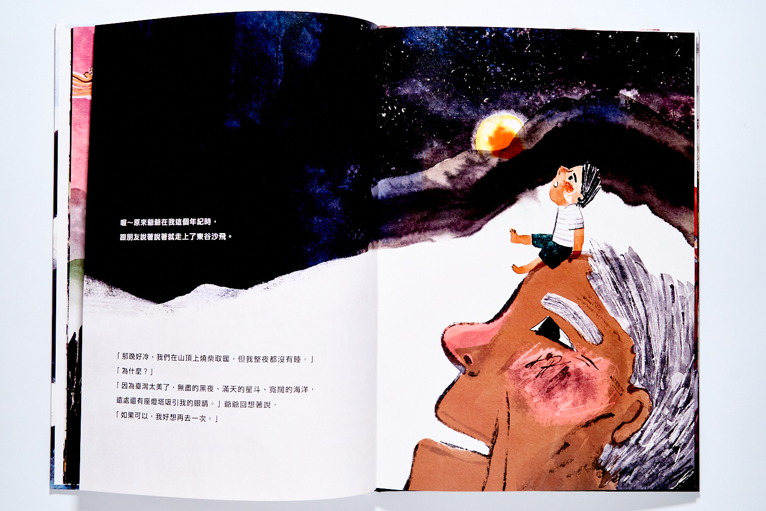 然而我還要請你和孩子特別留意書裡這幾個畫面,爺爺在路上不斷和孫子講著祖先的傳說與故事,不僅是在路途中增加趣味,同時也是向下一代傳承歷史的開始。