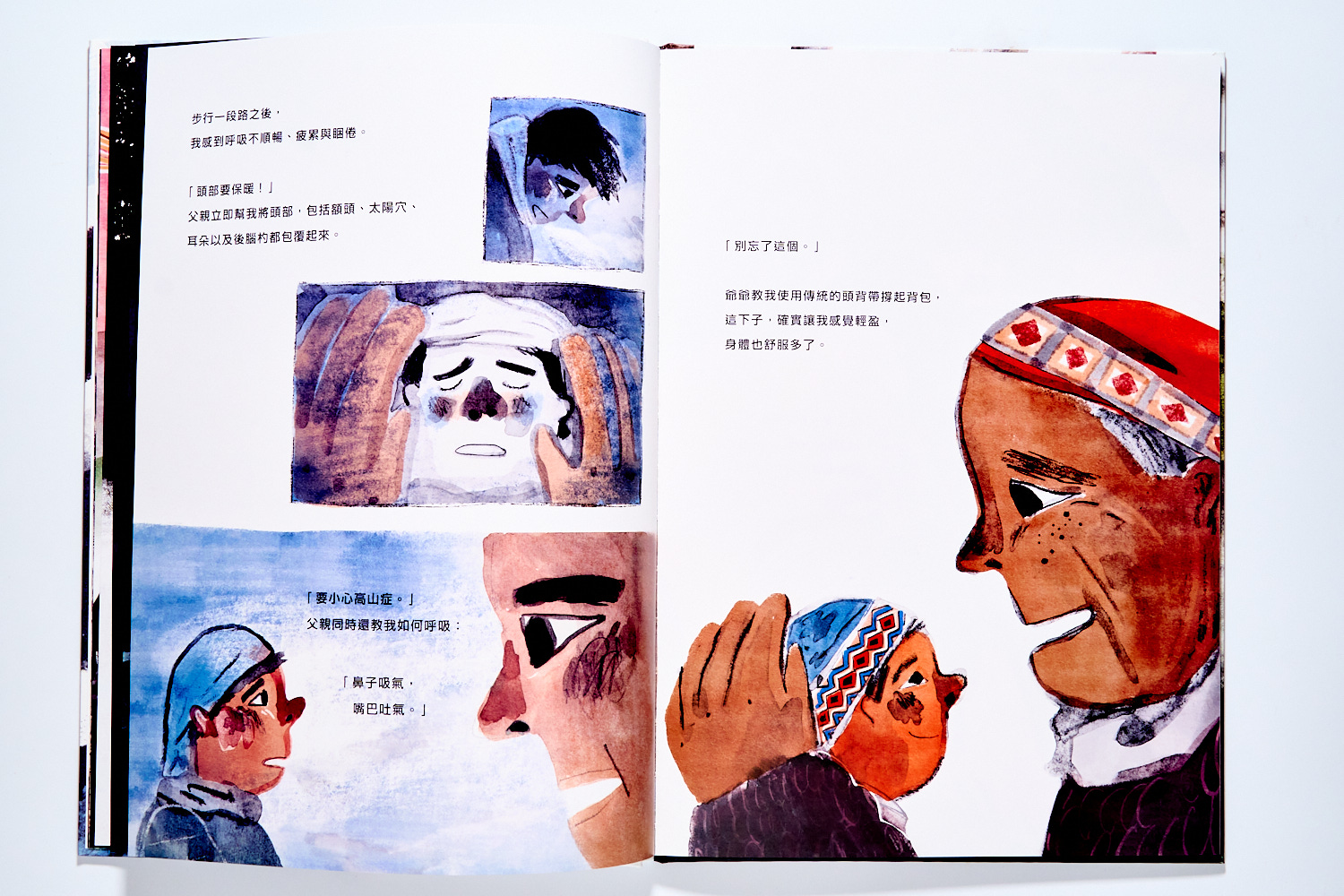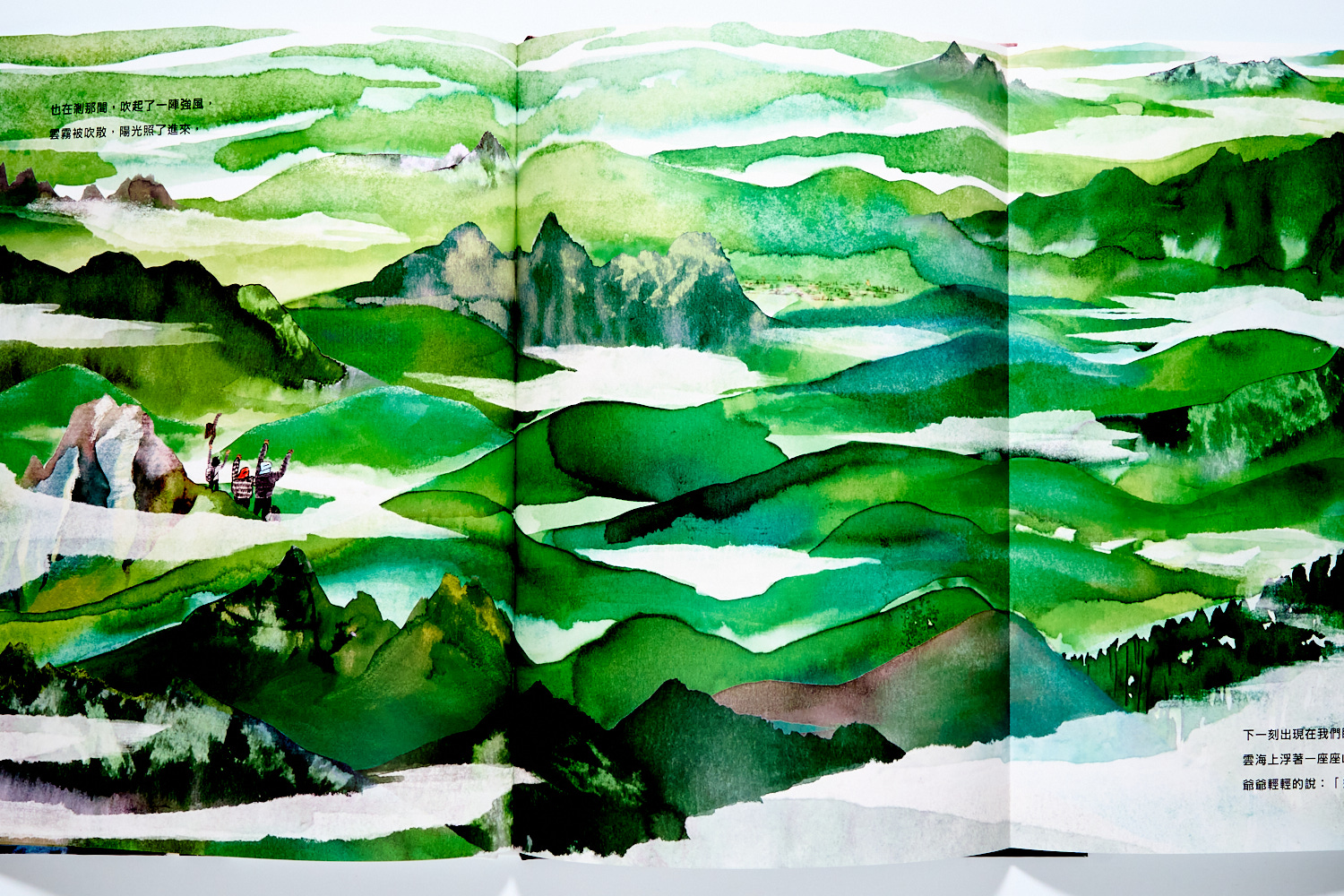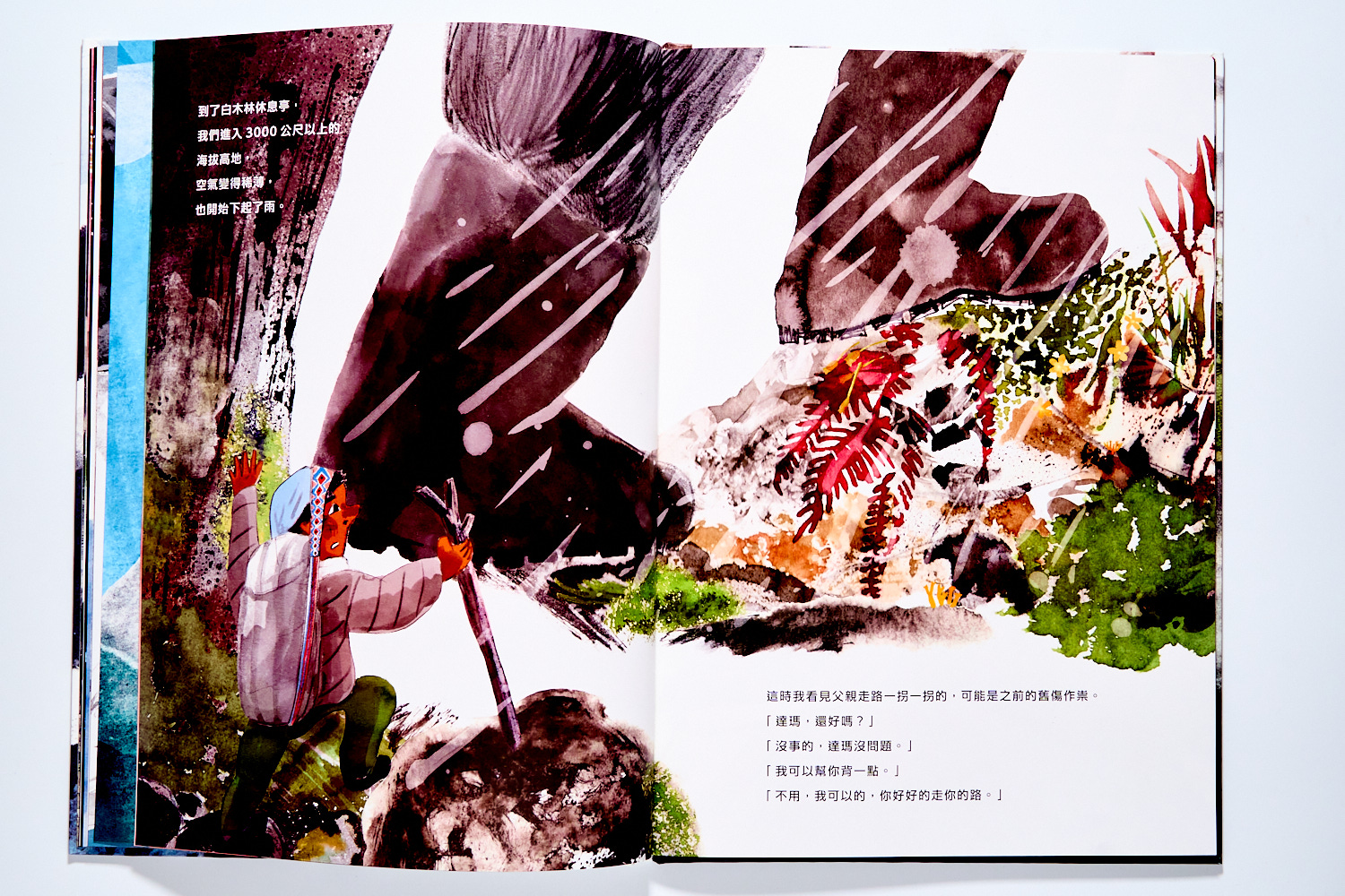 在插畫家貓魚精彩的創作裡,粗獷同時又富細節的插畫,是能讓我們和孩子一舉投入登上玉山的過程。有時大大的腳踩著路徑上的落葉枯枝、有時又要登上石階或是聆聽山深處的聲音,甚至就連高山症的描寫也都維妙維肖。