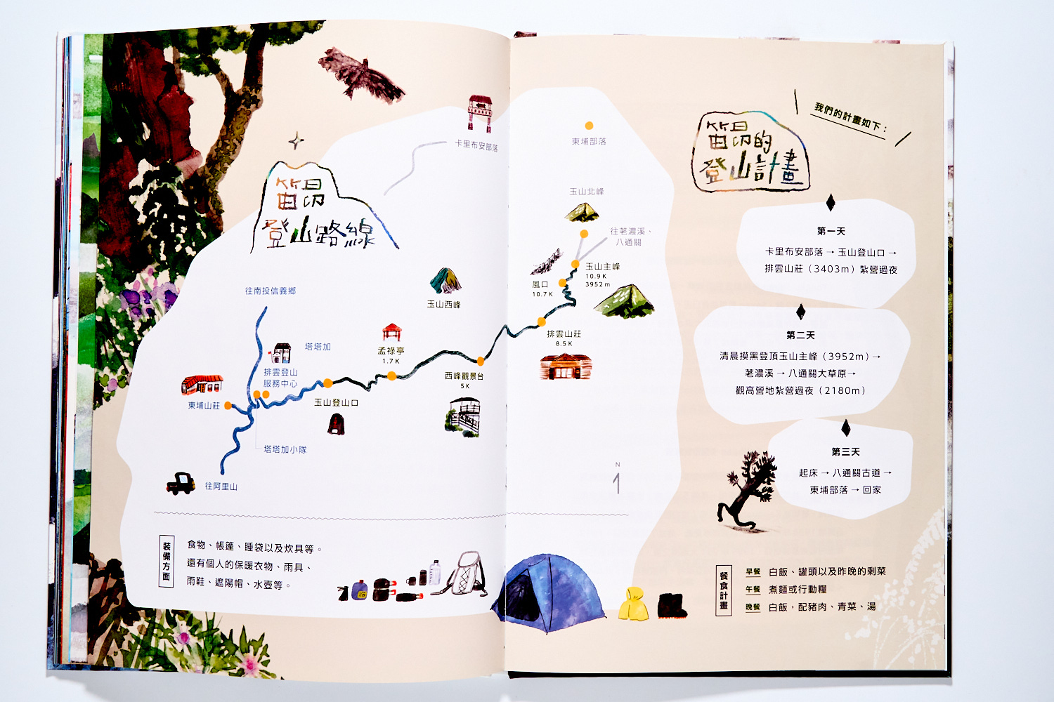 書末有個登山路線圖解釋祖孫們登山的路線,這個確實是現在的路線,他們從排雲塔塔加起登,中途登頂玉山,最後走八通關古道下山。