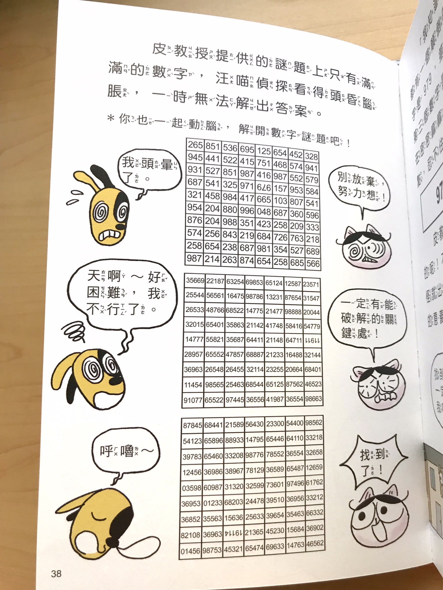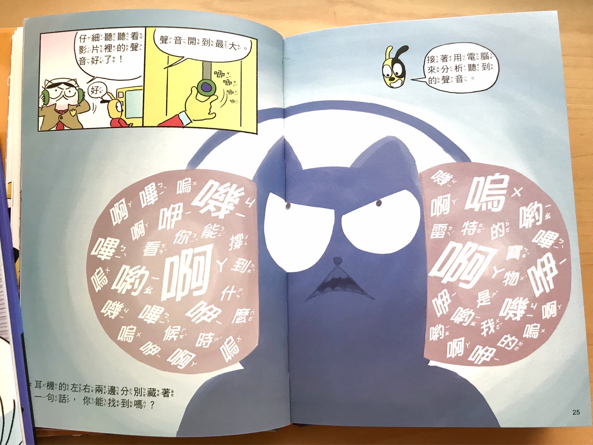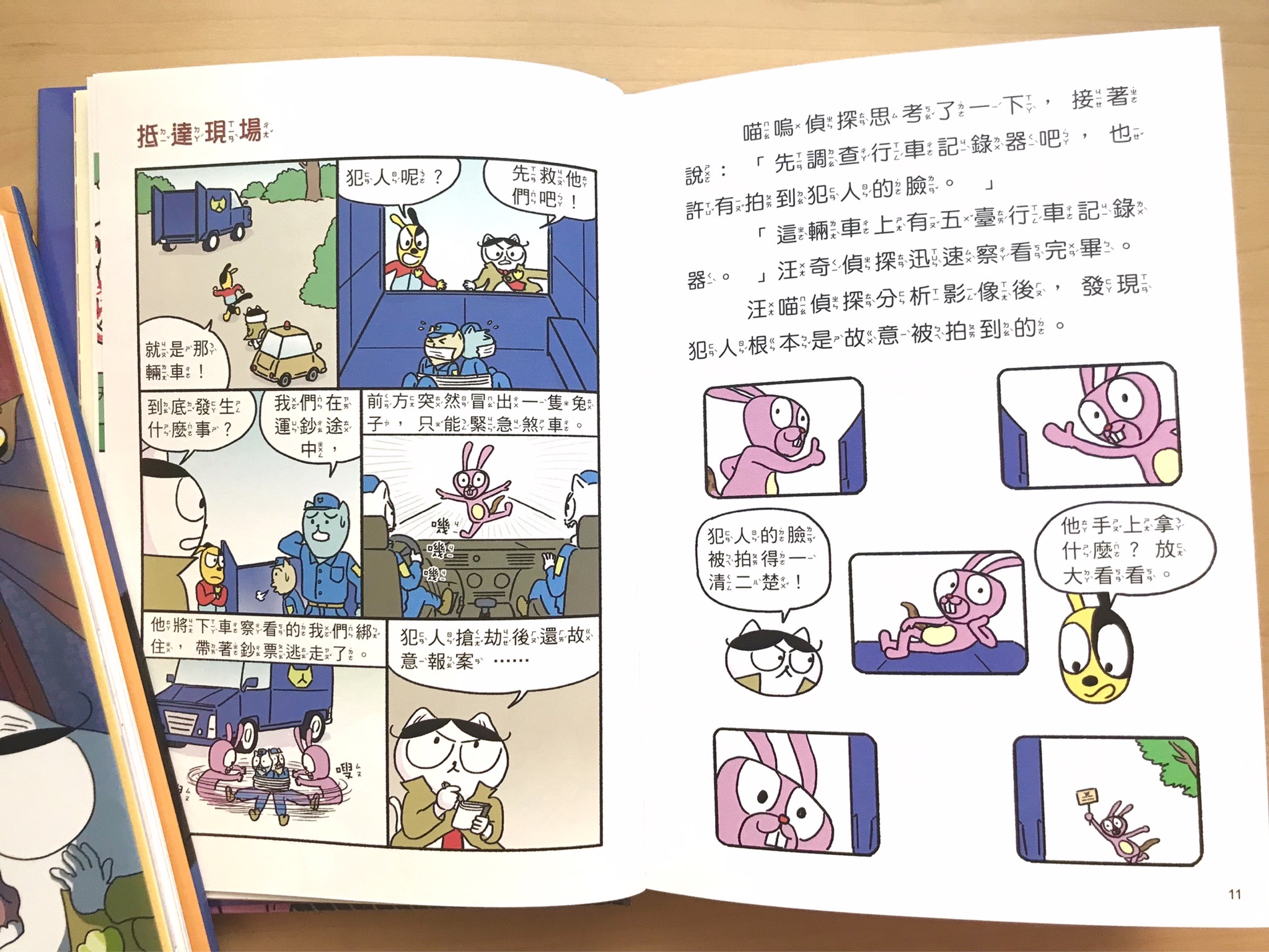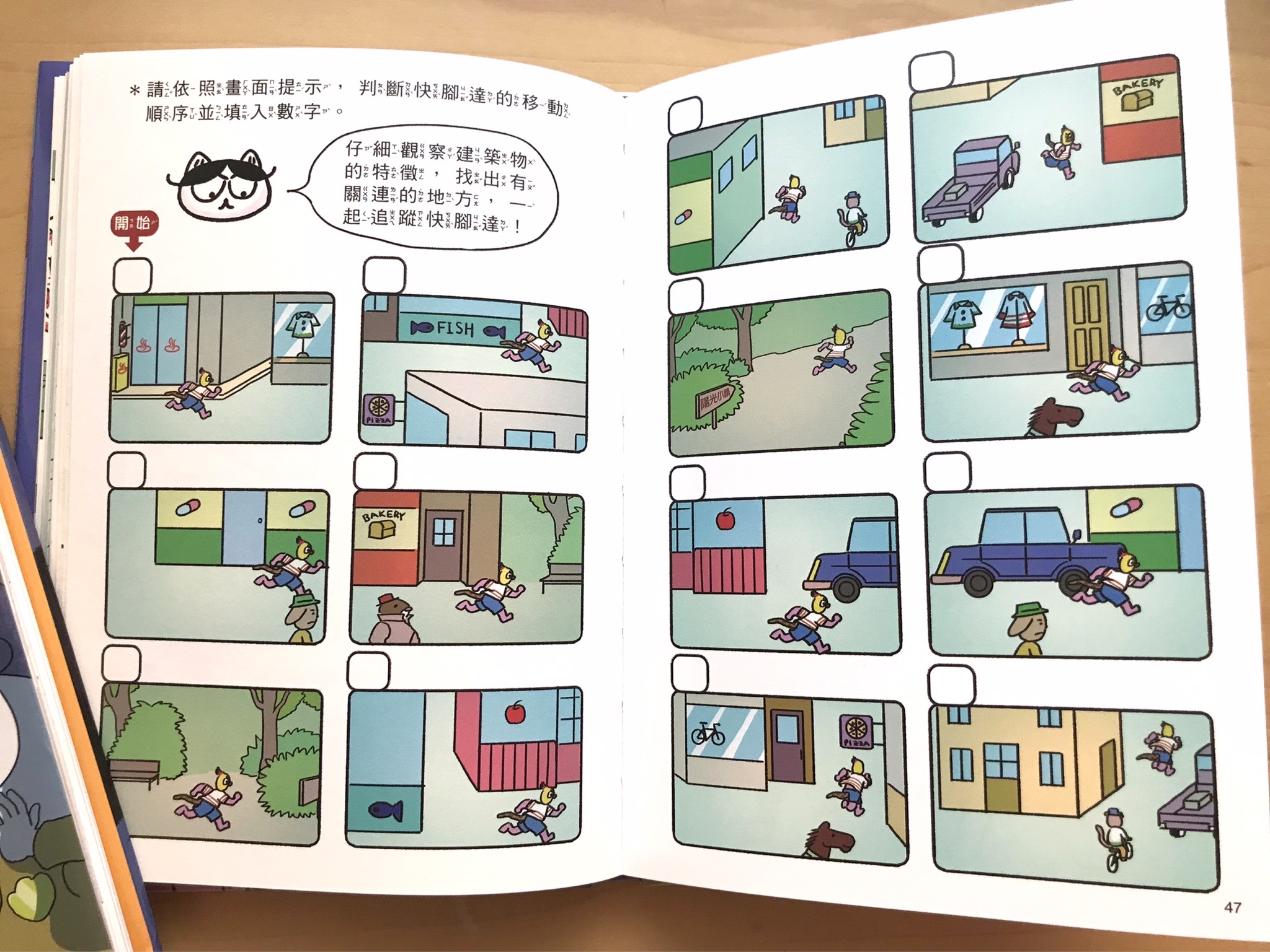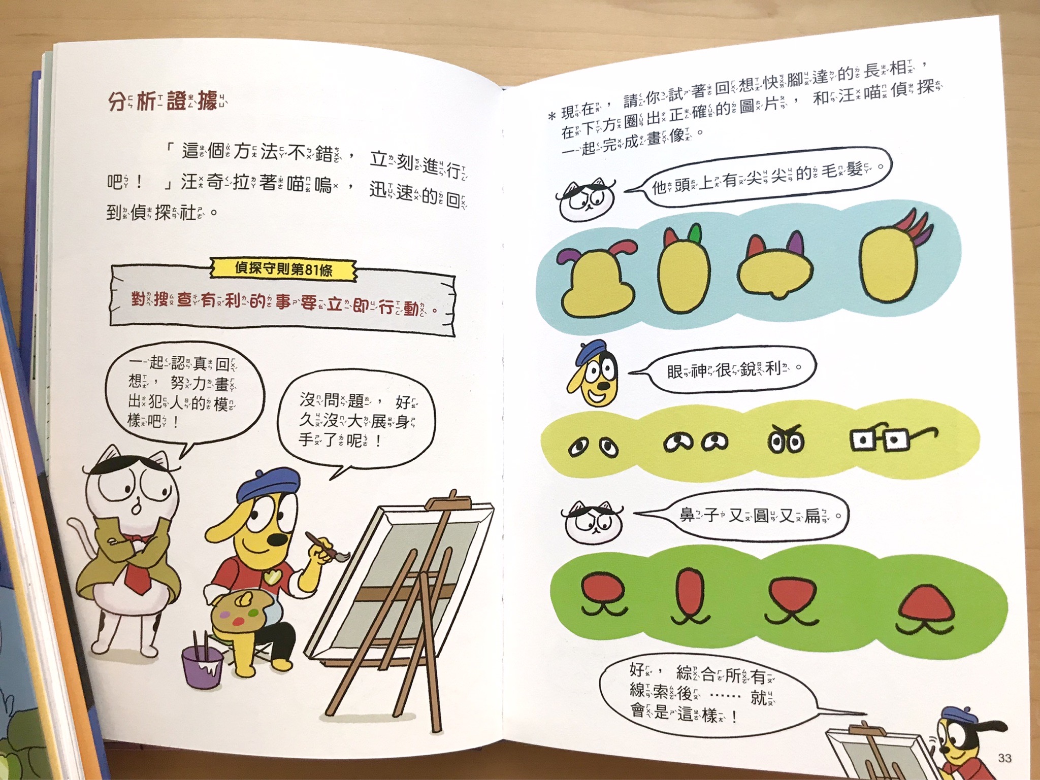 頁面中也會有小標題輔助,會暗示小讀者說,現在是要從故事線索一起想一想、現在是要停在這頁解謎了,等等的閱讀階段。而且引導孩子思考或解謎遊戲後,汪喵偵探自己的推理過程很快就會在下一頁出現,很適合低中年級的小朋友立刻驗證自己想的對不對,並且如何調整。