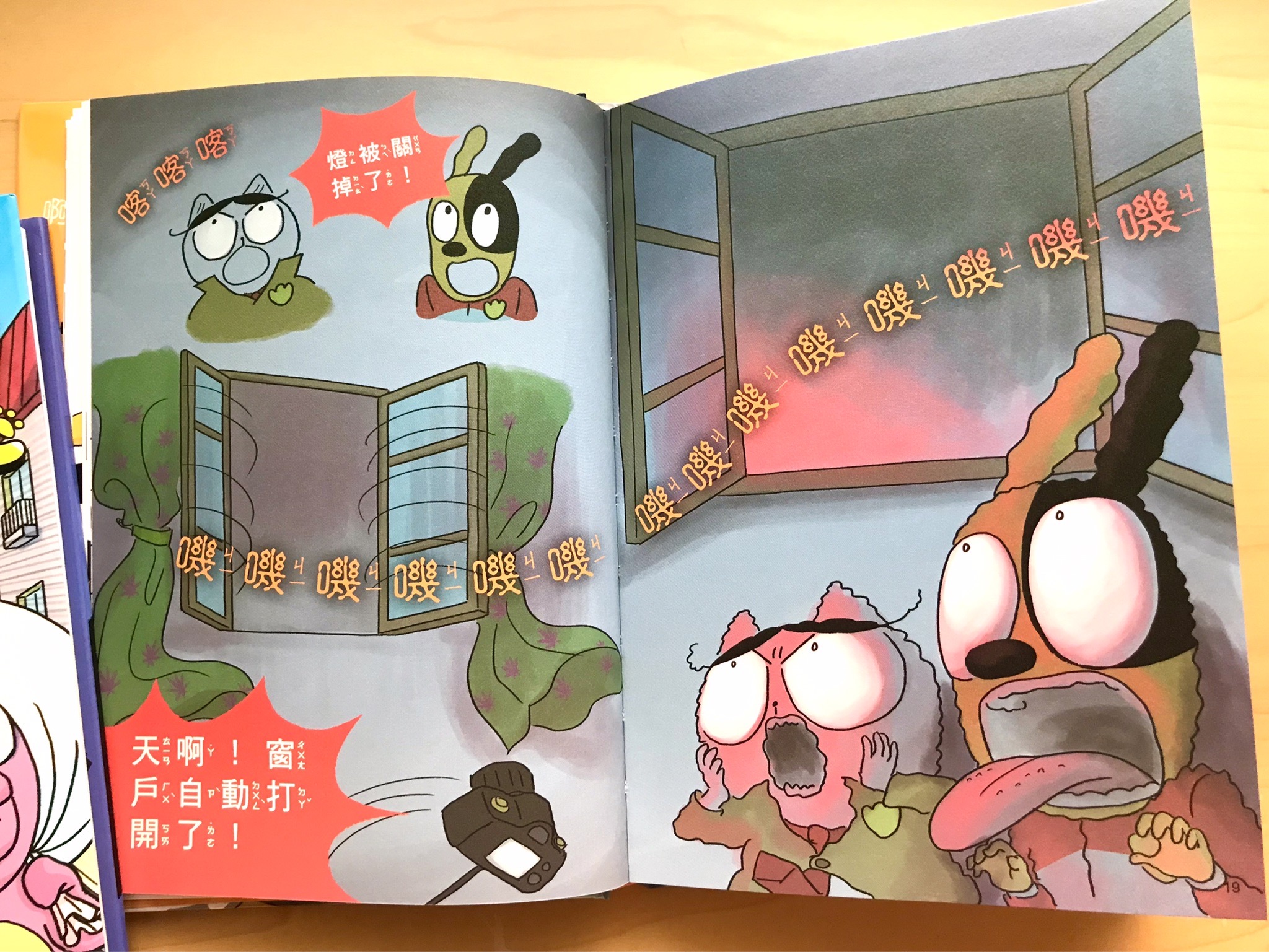 有時候也會有這樣的漫畫呈現。注意左上角的棕色小標題,書中不同段落都會有這種標示,在這類畫面較多變的圖文書中,有這個小標我覺得對小孩來說是不錯的閱讀提示。
