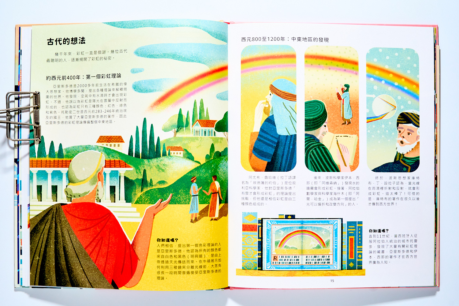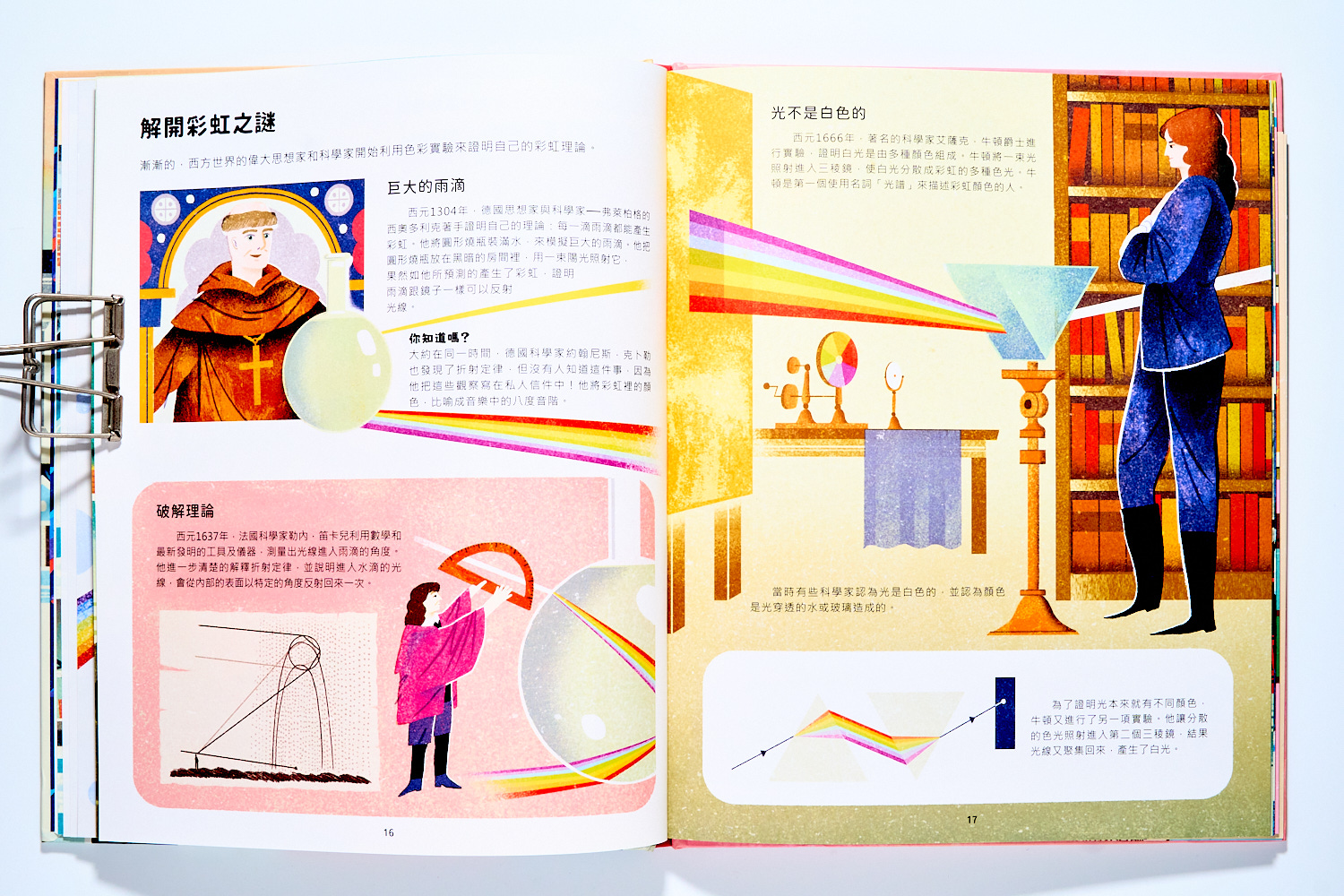 在解釋玩科學原理後,書本開始回到過去,從彩虹的發現歷史說起~