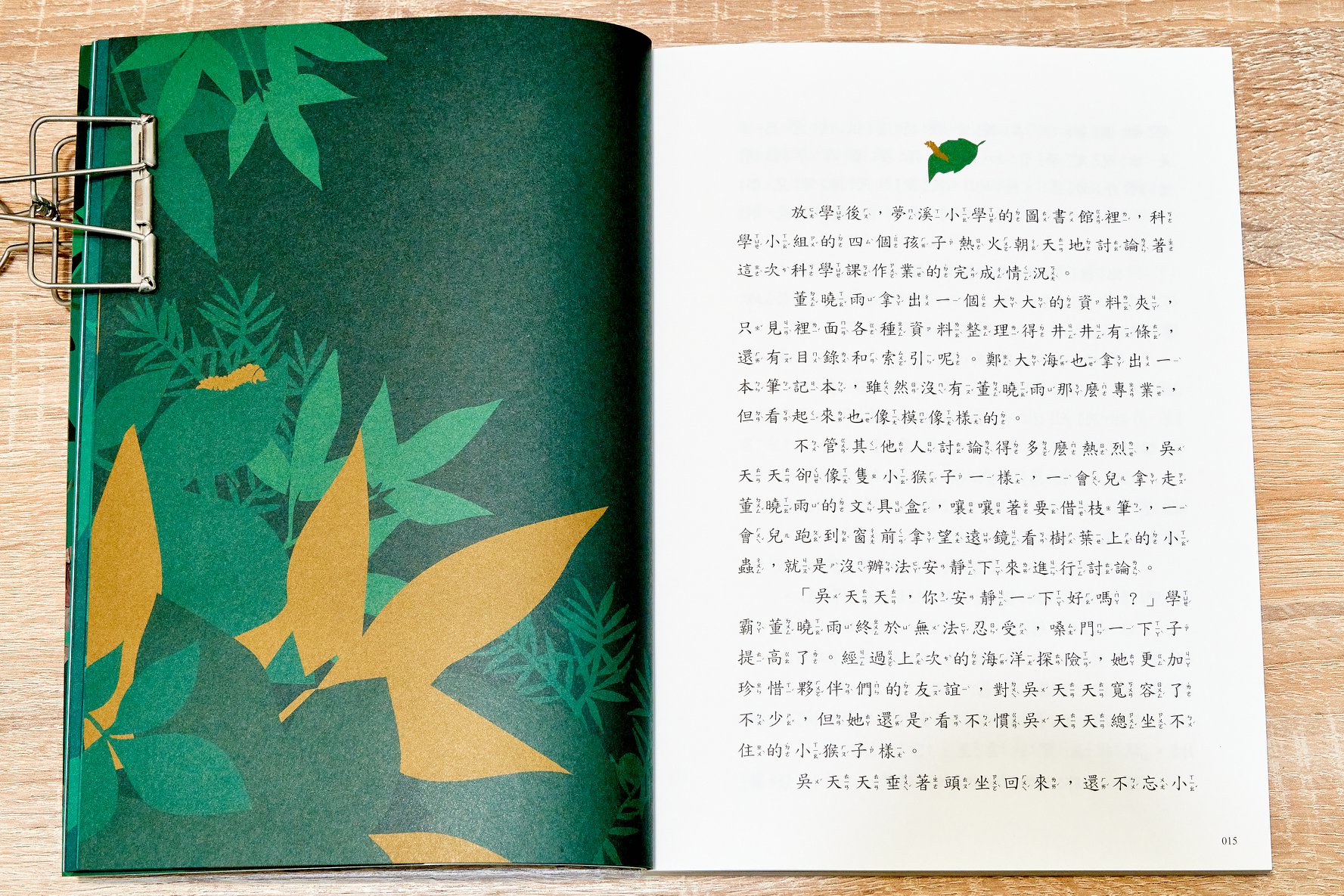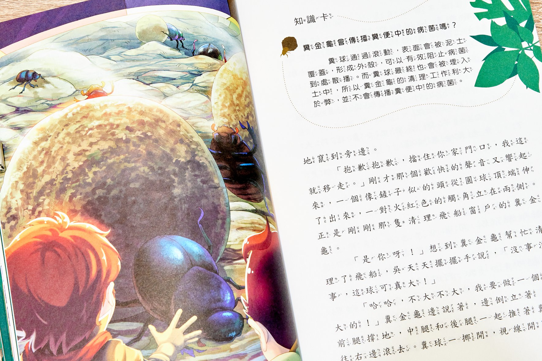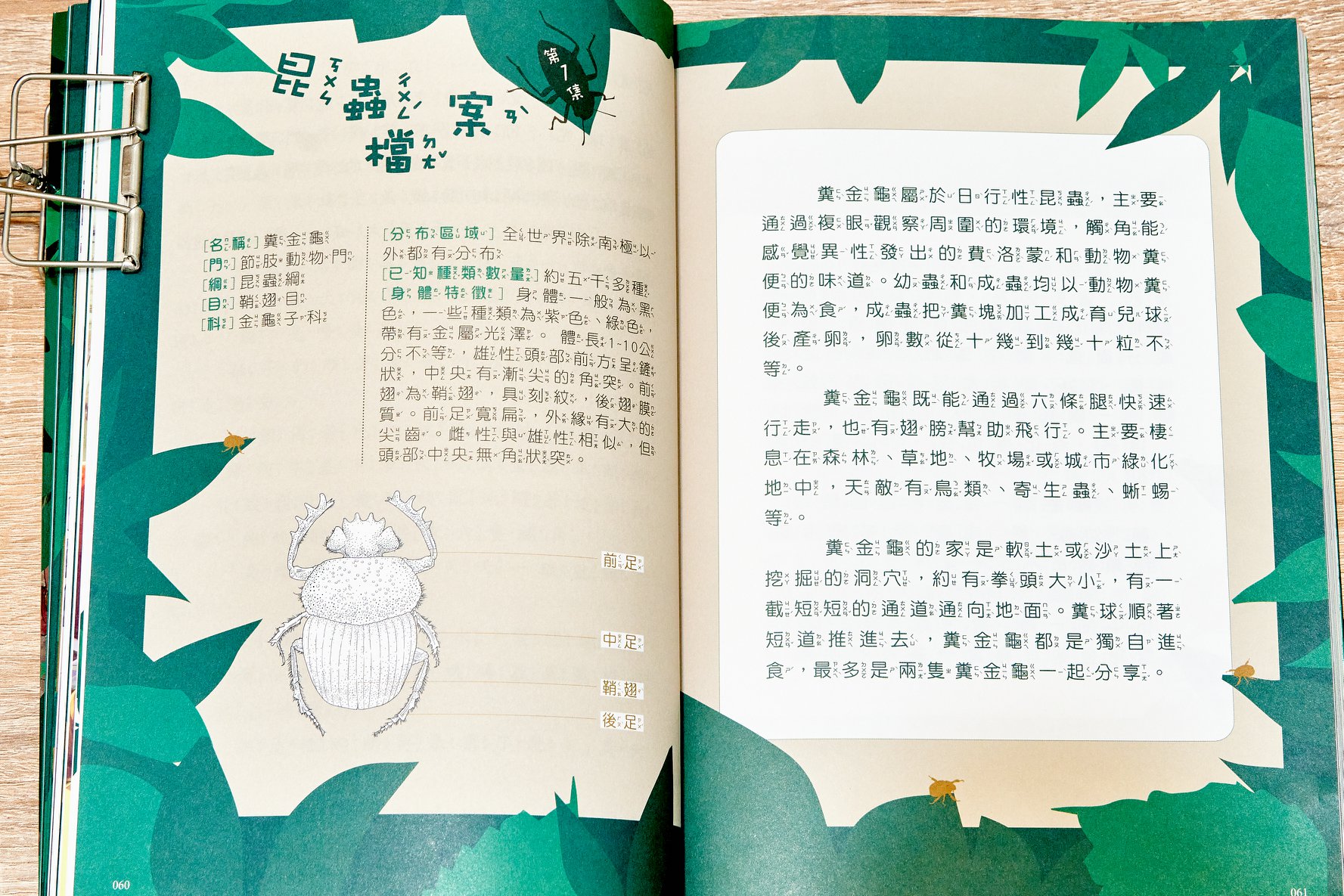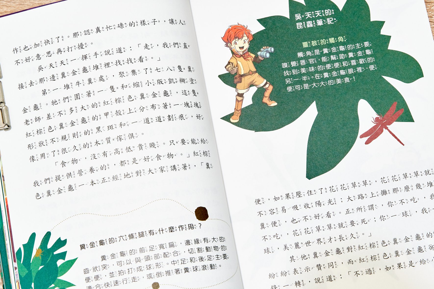 像這本書中登場的蟲蟲們就有糞金龜、黑褐蟻、螳螂、尺蠖等等,隨著故事進展,書中也會有特別的昆蟲知識整理,讓你的昆蟲迷孩子檢查一下知識正確性。