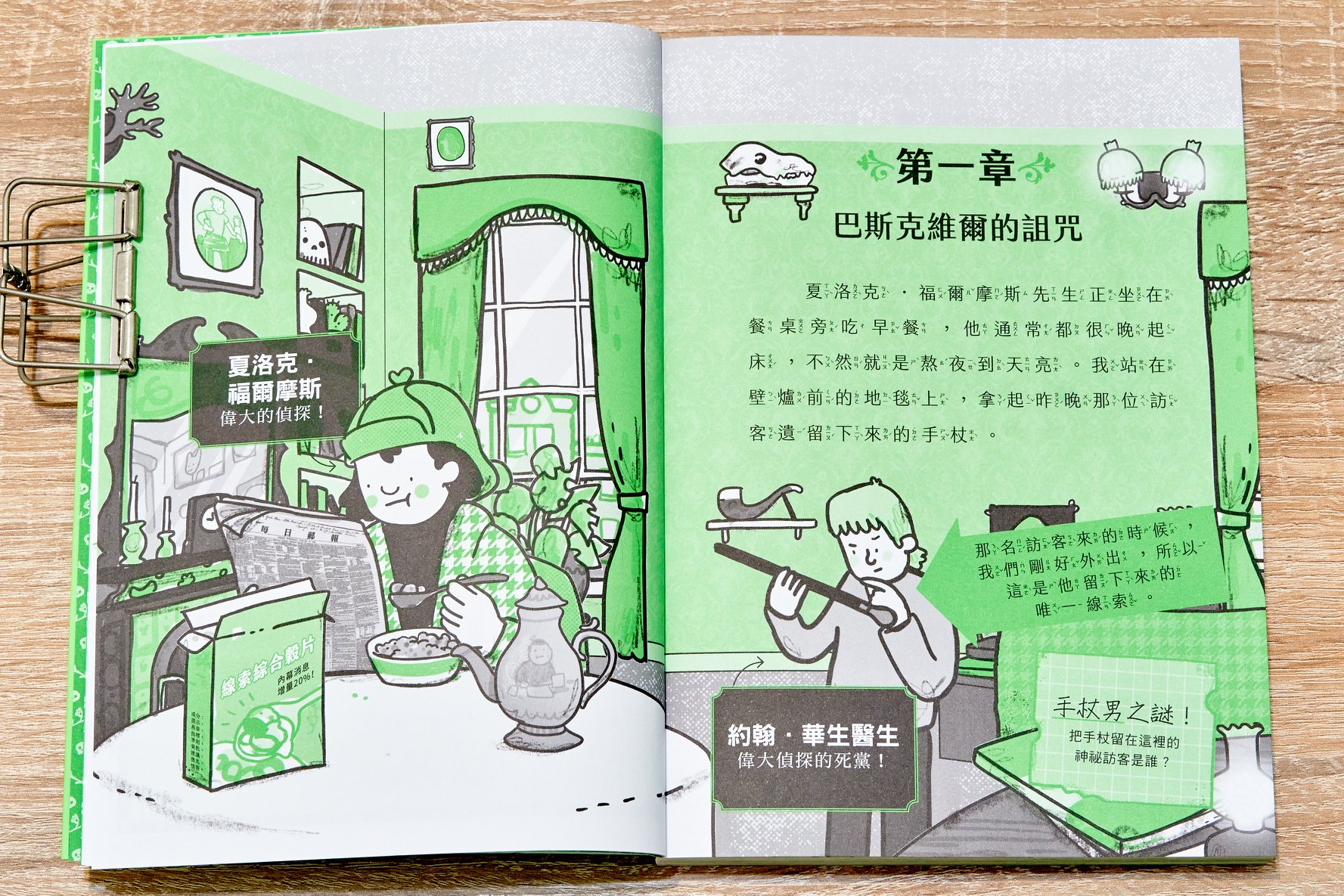 透過插畫家的重新詮釋,把單純小說文字加了許多細節,像是左下角的線索綜合穀片,內幕消息加量20%,果然非常適合福爾摩斯啊。