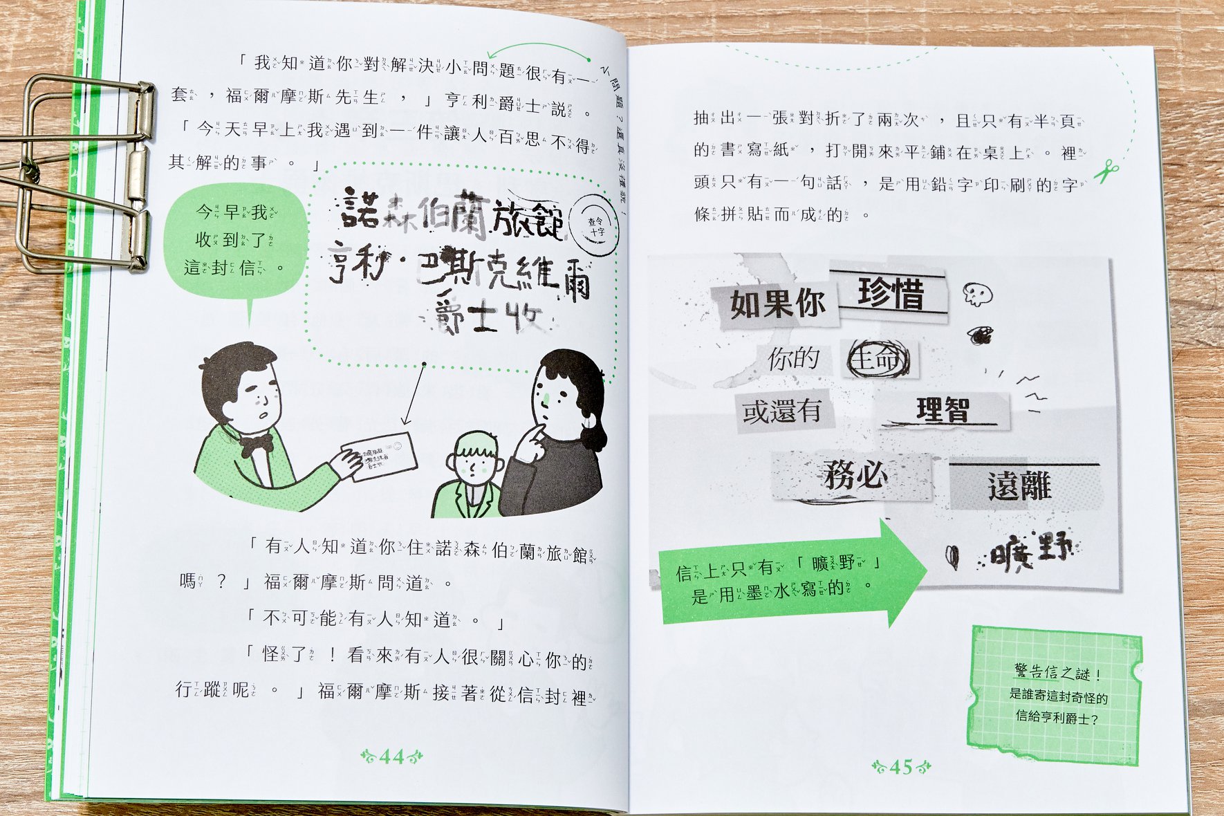 甚至嫌犯寄來恐嚇信,上面的報紙剪貼文字,還有糊糊的墨水,可是福爾摩斯的線索關鍵。用這種實際的表現手法,搞不好孩子還比福爾摩斯更快找出線索~
