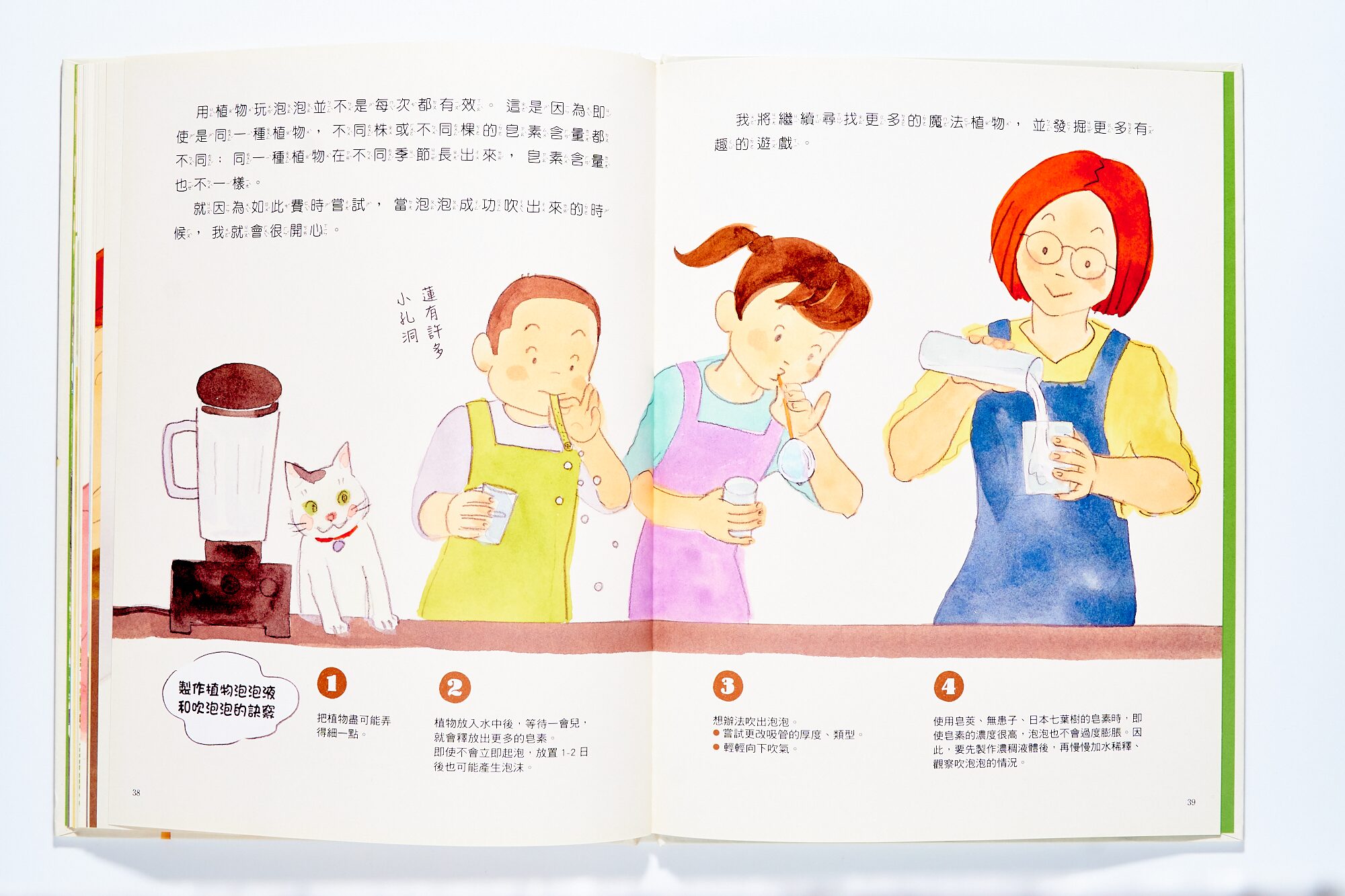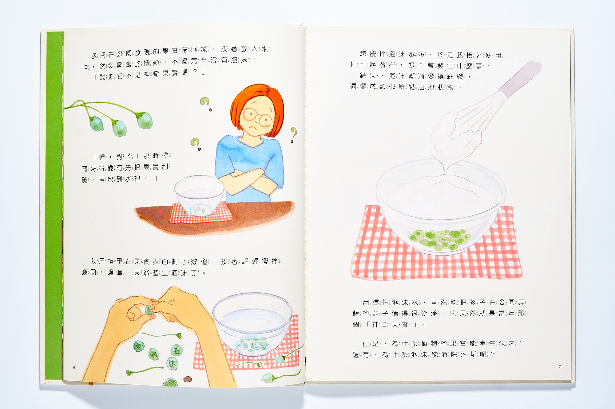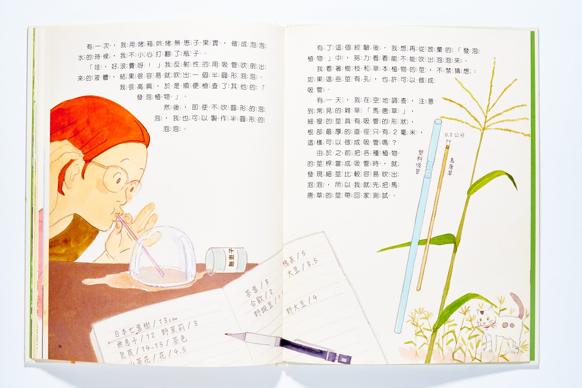 而溫暖的實驗就從第一頁開始,從公園摘來的神奇植物,想著小學和哥哥討論泡泡的趣味、邊在廚房裡拿著打蛋器和玻璃盆打出,慕斯般的濃密泡泡。