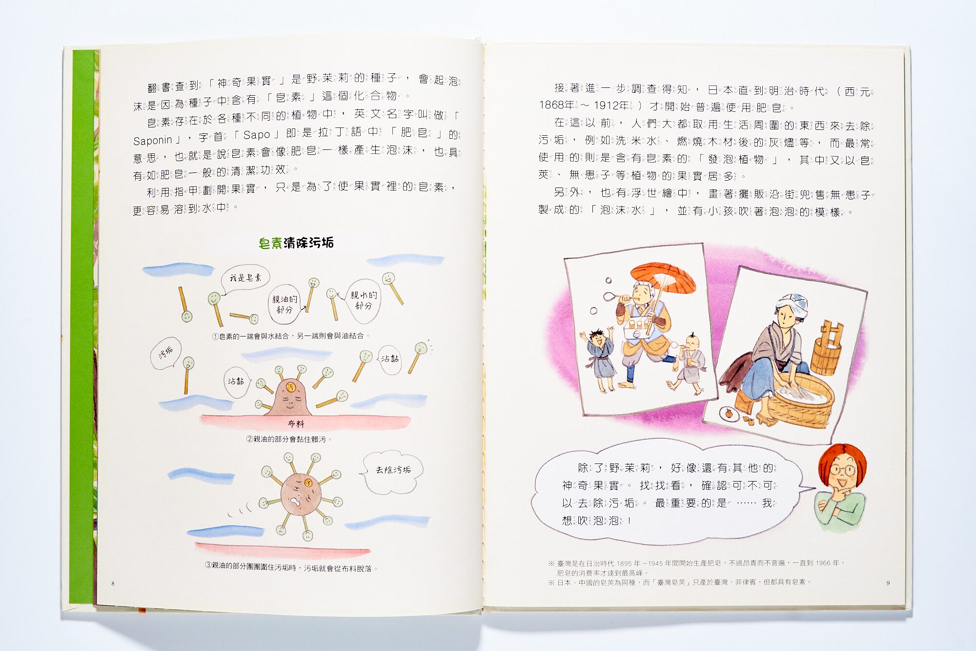 我自己邊讀、也邊想起以前的肥皂是長怎樣?結果認識了美琪藥皂,甚至是臺灣第一塊肥皂,或是看看臺灣也有哪些起泡植物。這系列『科學不思議』總是讓人意外發現,生活到處總有令人不可思議之處。