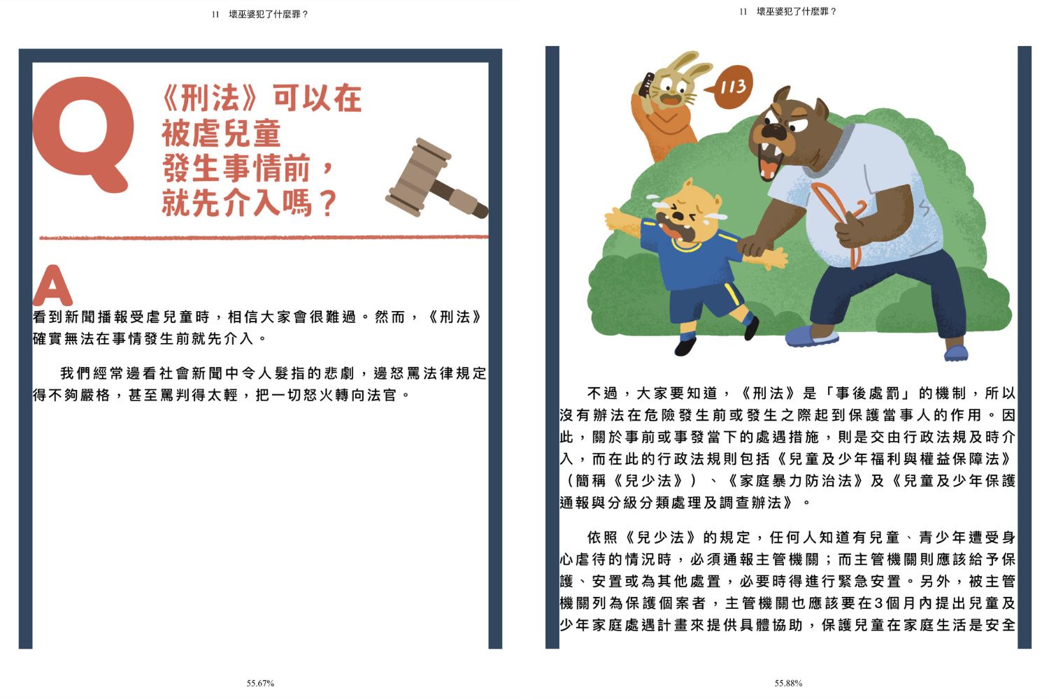 - 先有一小段漫畫搬演童話事件情境,不用擔心這些犯罪事件太重口味,絕對不會毀了任何人的童年。裡面所有角色都是由童話陪審團的動物主角扮演,情境卡通化後,能恰到好處在於表達事件、討論法律本身。