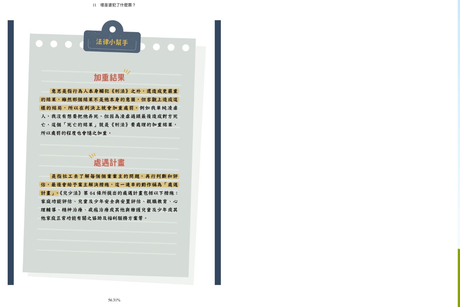 - 章節末的法律詞彙補充解釋。這也可以用來複習、對應剛剛讀的內容,而且你會發現讀完前面,再把這些條列知識點裝回去,就能立體瞭解來龍去脈。