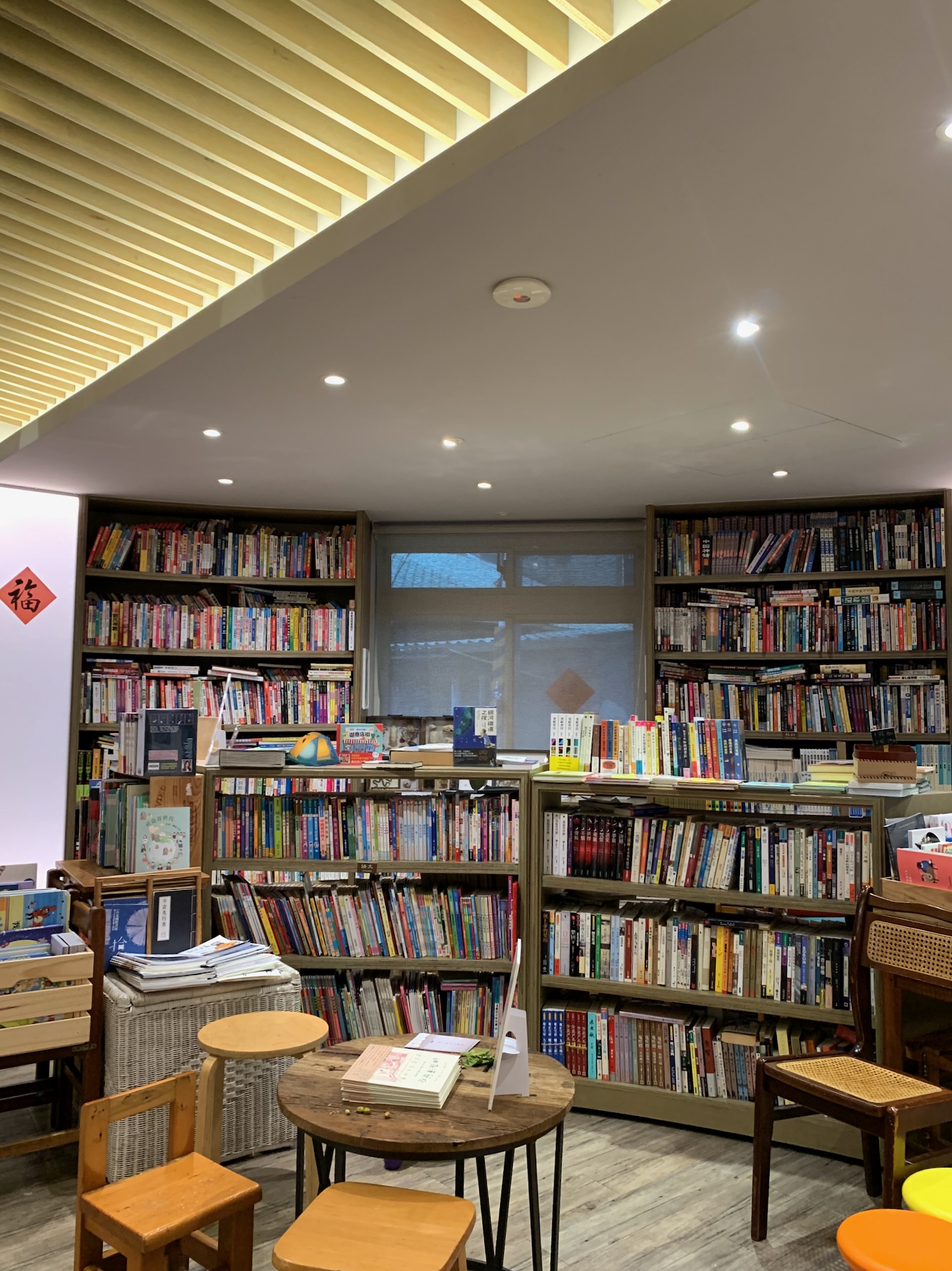 不曉得店主人取名綠是因為環保、還是喜歡綠色,但是一進去看著天花板像枝條的橫條、周圍像年輪環繞的書櫃,再配上童書!就覺得自己身處在一棵大樹裡!