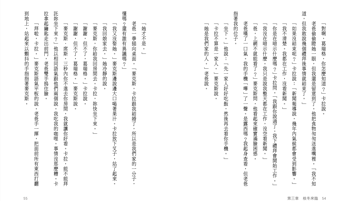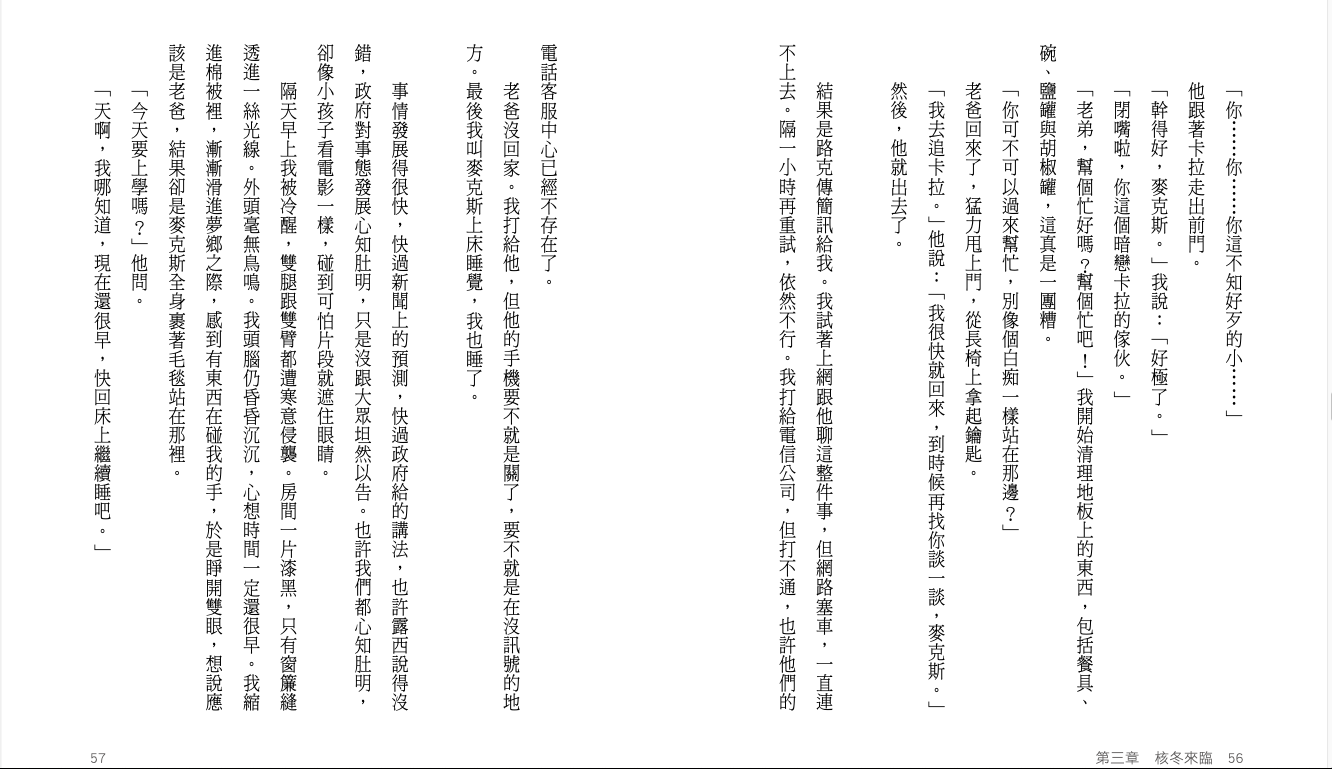 隔天早上費恩醒來,天氣變得陰暗嚴寒,還下起灰色的雪。沒有網路,沒有手機,沒有電視,沒有電力,爸媽也不在身邊,一切都變了。而在學校的所知所學,一切都派不上用場。