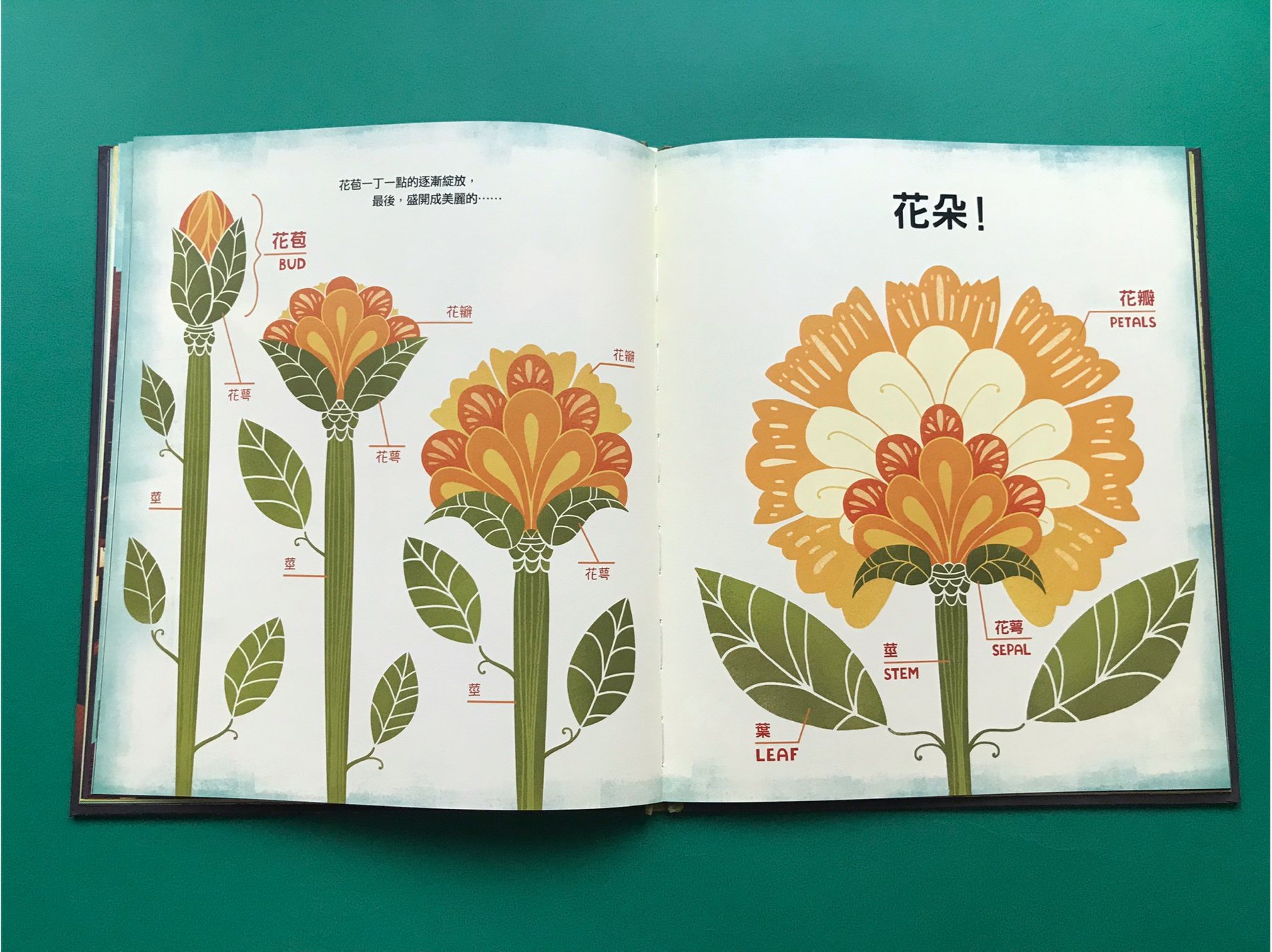 重點是,每頁都會一一標示各植物部位。小朋友就可以對照一下,植物長大前後,種子變成什麼樣、莖葉會如何,當然還有花萼啦。