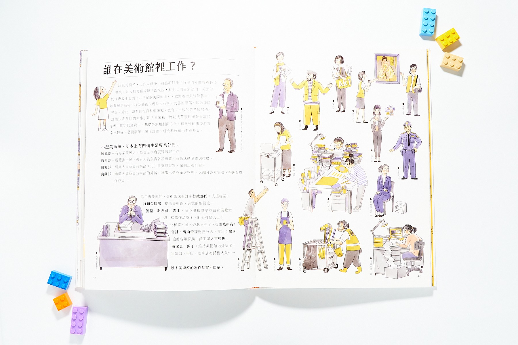 美術館裡可不是只有館長和導覽員喔。書中仔細的向讀者介紹一間美術館背後的各種職位與負責的工作,也可以讓孩子知道美術館不僅是展覽美術品而已。