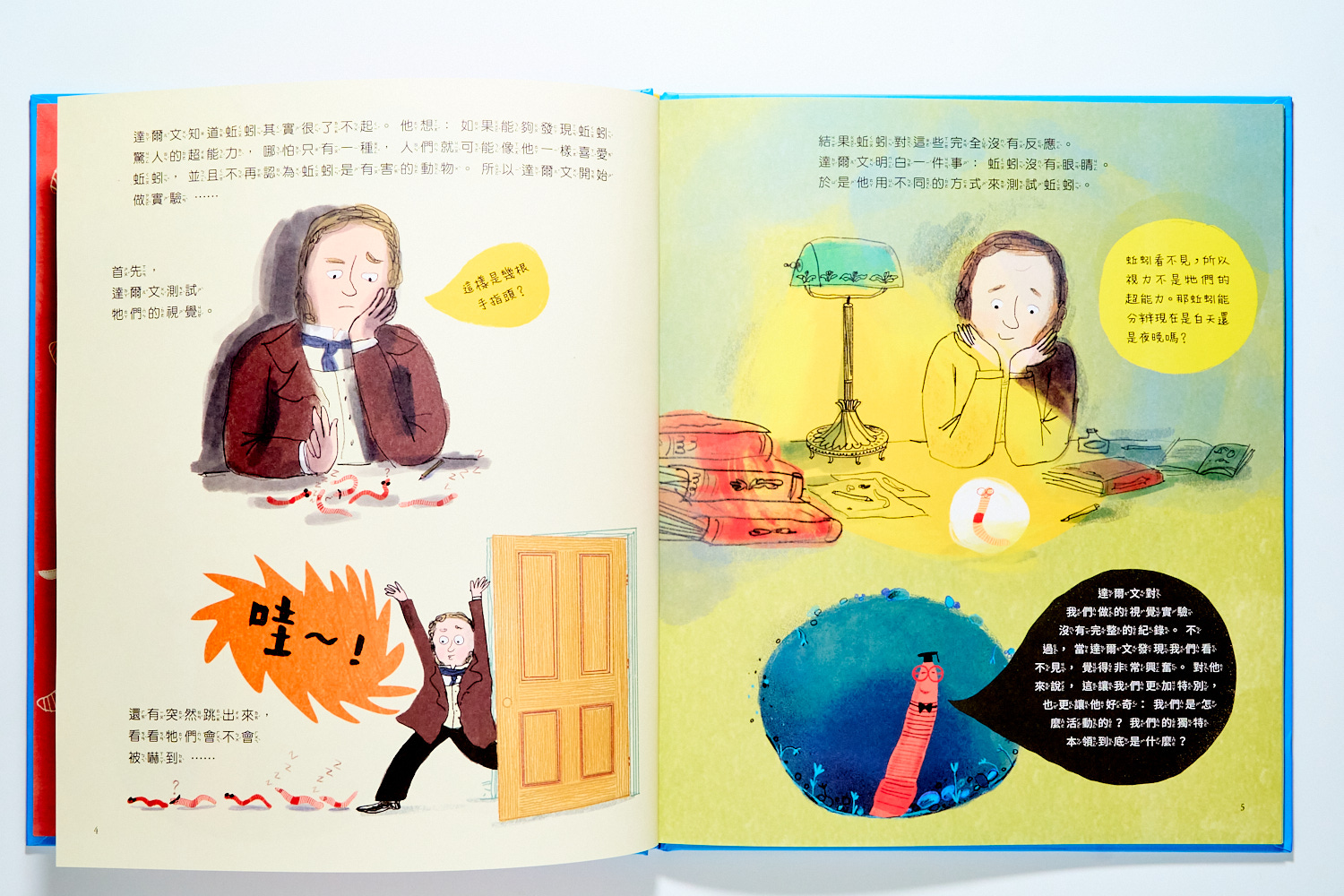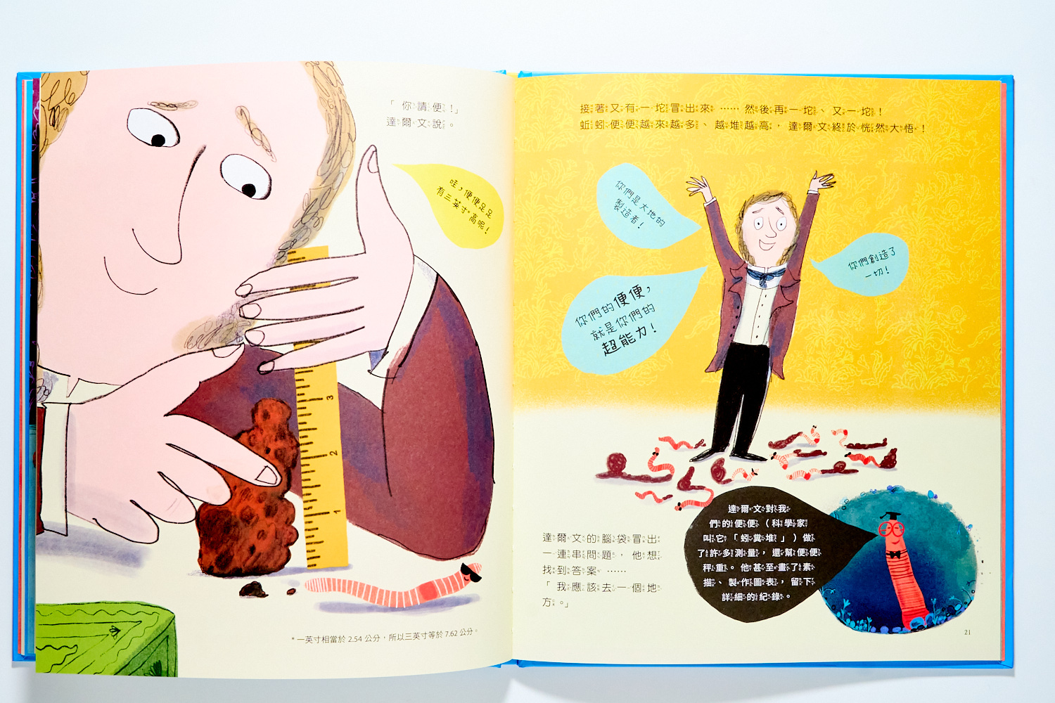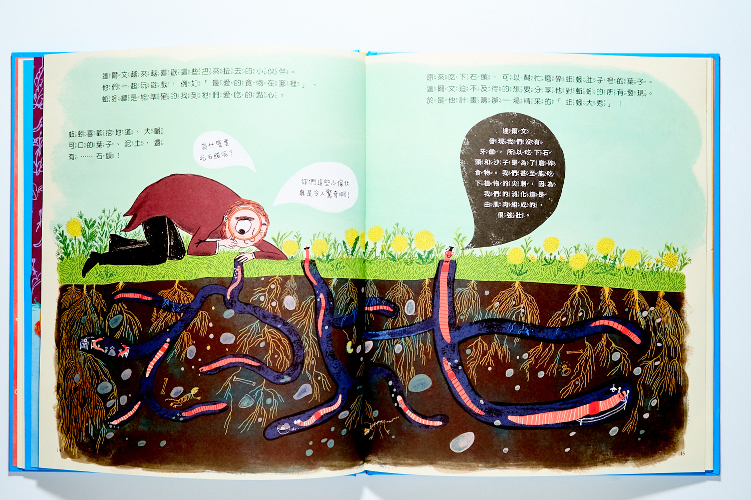 在那時候,大家對於這個藏在土裡、像蟲一樣的動物一點都不感興趣。但達爾文就是對這土裡的小動物非常著迷,於是你會在書裡看到許多達爾文像小孩子一樣研究的趣味畫面: