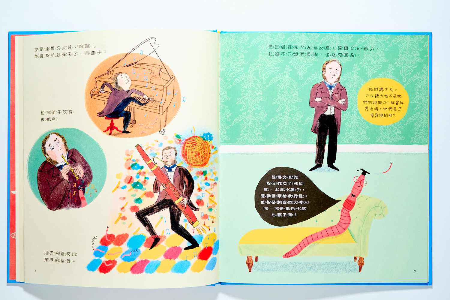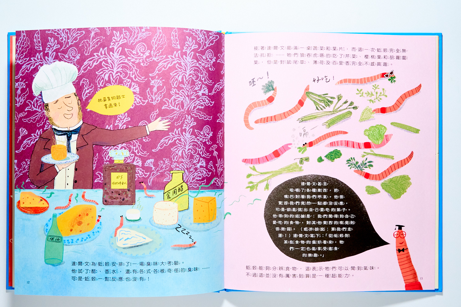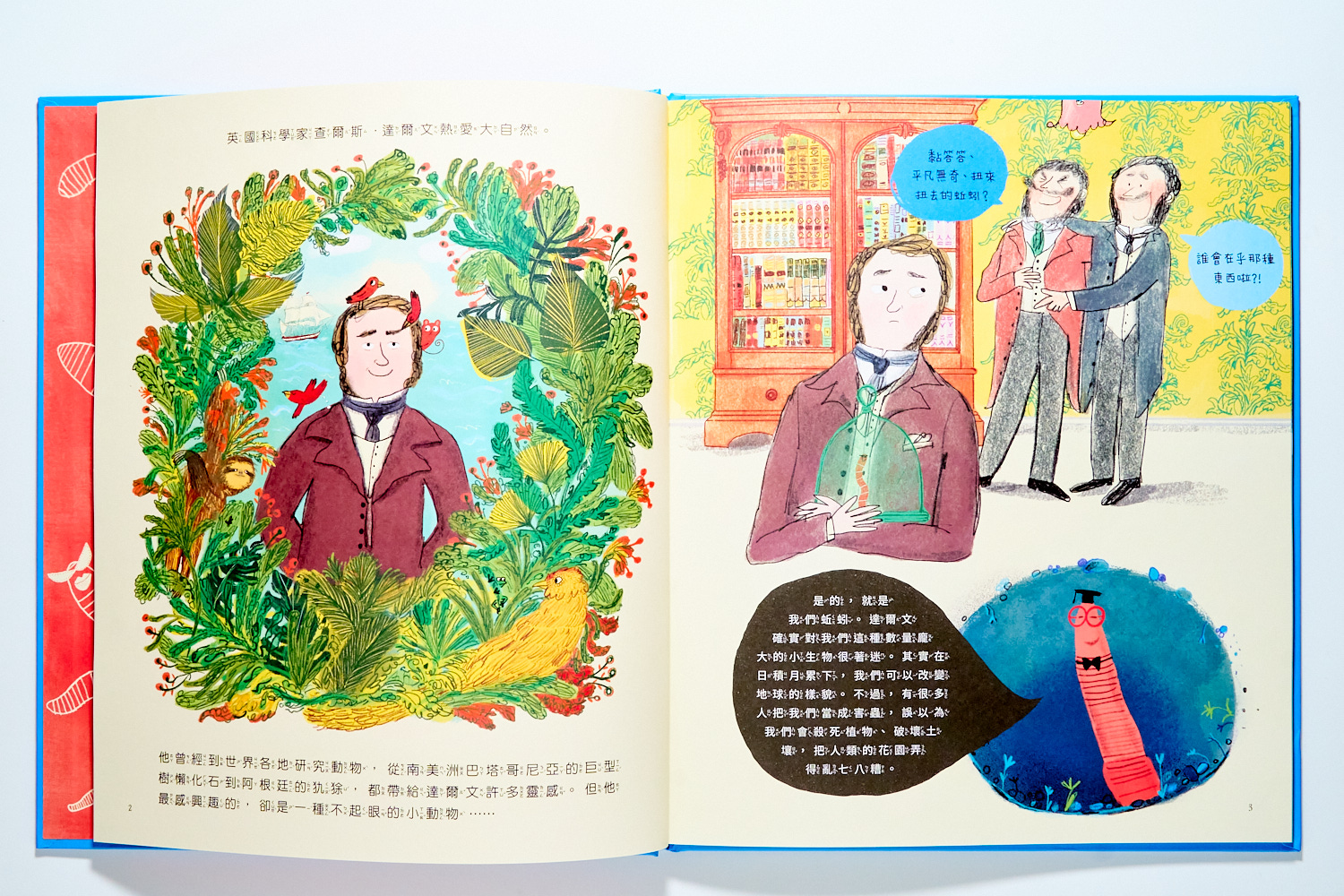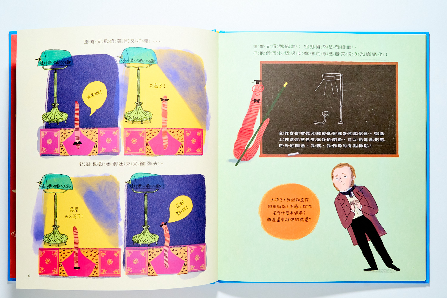 在那時候,大家對於這個藏在土裡、像蟲一樣的動物一點都不感興趣。但達爾文就是對這土裡的小動物非常著迷,於是你會在書裡看到許多達爾文像小孩子一樣研究的趣味畫面: