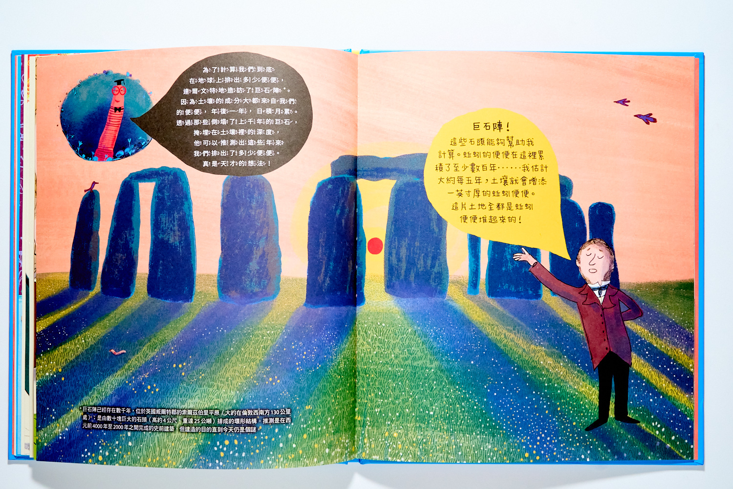 達爾文先是推測蚯蚓不斷的在土裡累積便便,以及像我們人類翻土挖洞一樣將土壤帶到地表,那土壤的高度應該發生變化才對~因此,他先跑去觀察英國巨石陣,仔細研究這些歷史巨大石頭在土壤下沉的深度,來推出蚯蚓如何經年累月的改變地貌。