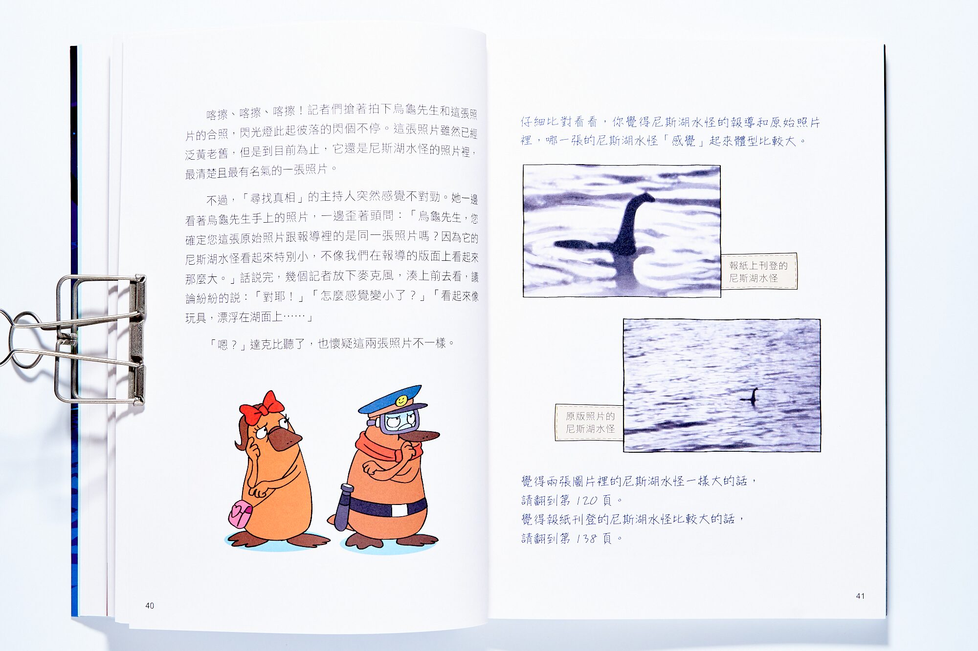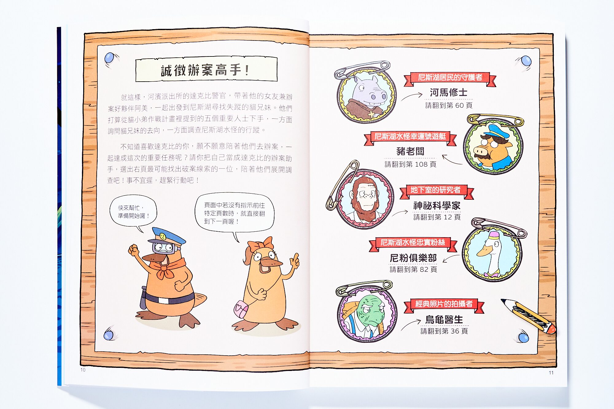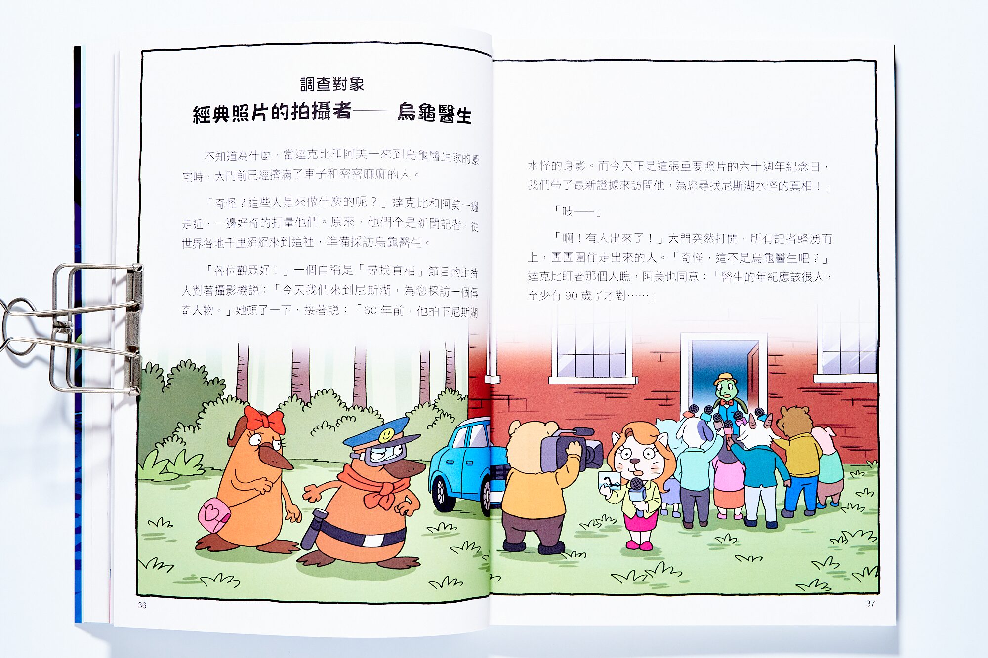 新系列以文字閱讀為主,可以當作適合中高年級的橋樑書+推理解謎書。故事裡描述達克比這次接到的任務是找出,想要挖掘尼斯湖水怪真相但意外失蹤的貓兄妹,所以不像之前漫畫都是解決生物問題。