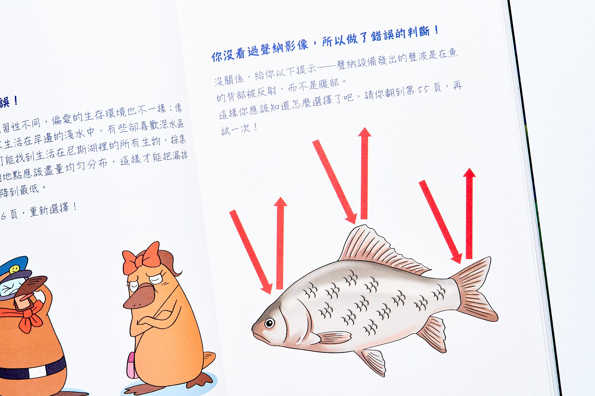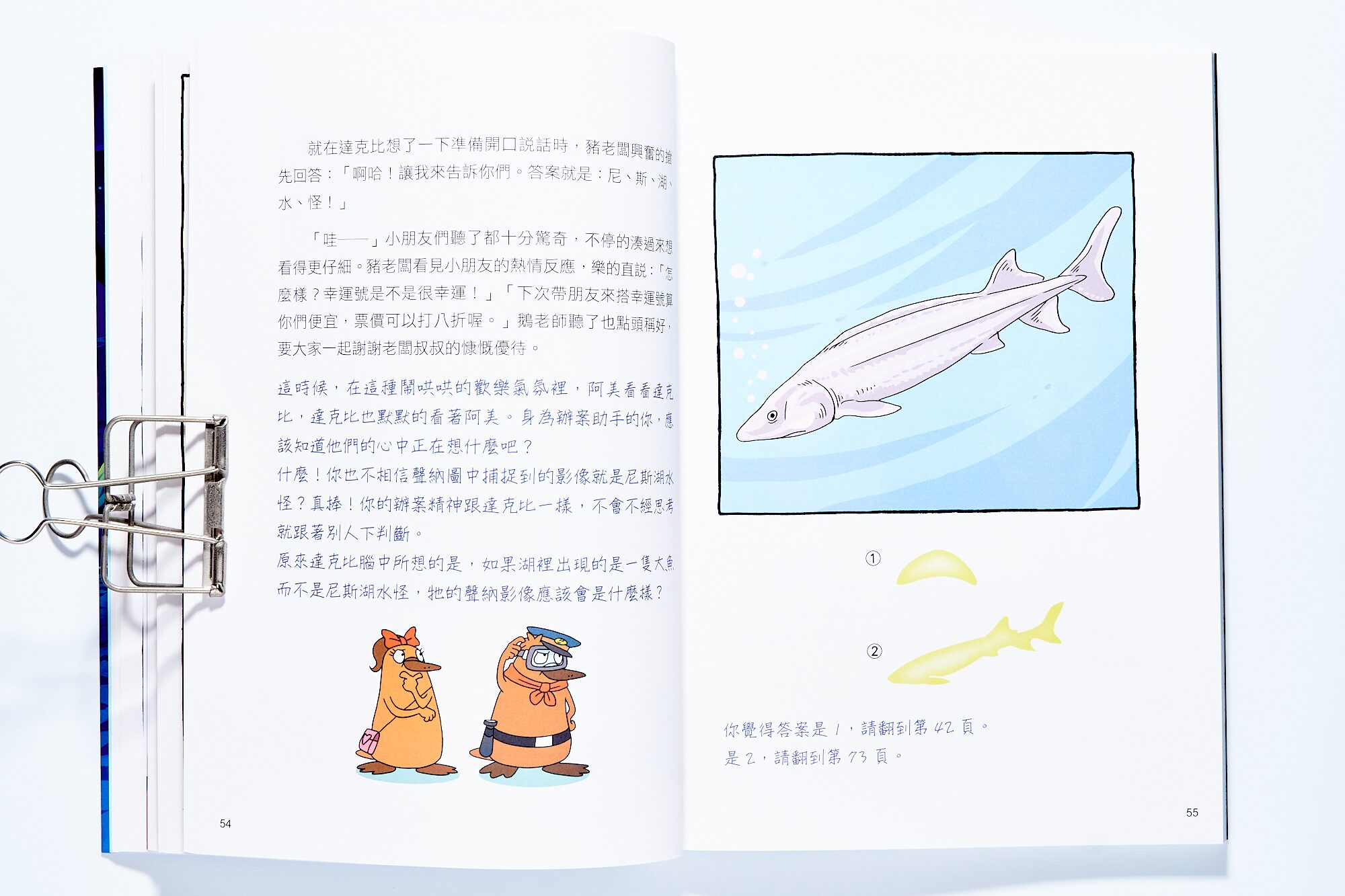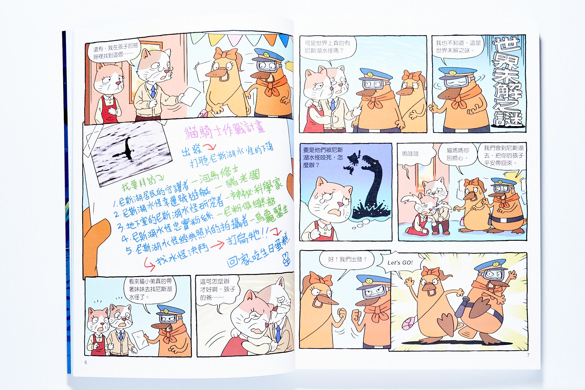 新系列以文字閱讀為主,可以當作適合中高年級的橋樑書+推理解謎書。故事裡描述達克比這次接到的任務是找出,想要挖掘尼斯湖水怪真相但意外失蹤的貓兄妹,所以不像之前漫畫都是解決生物問題。