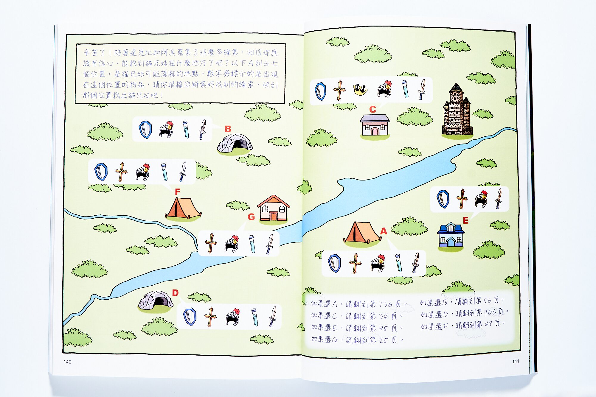 書籍解謎做法是放入這些閱讀支線,讓孩子選擇挑戰,並在旅途中會發生交叉翻頁(點擊圖片可以放大瀏覽更多內頁)