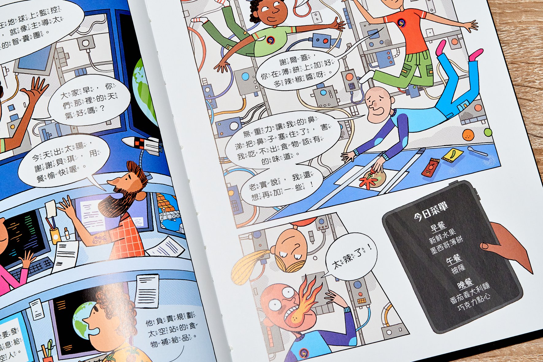 內容就是介紹太空人的辛苦『上班』生活。早上七點就要起床、八點就開早餐會議,接著一路忙到晚上七點半吃晚餐,九點半就要準時睡覺。